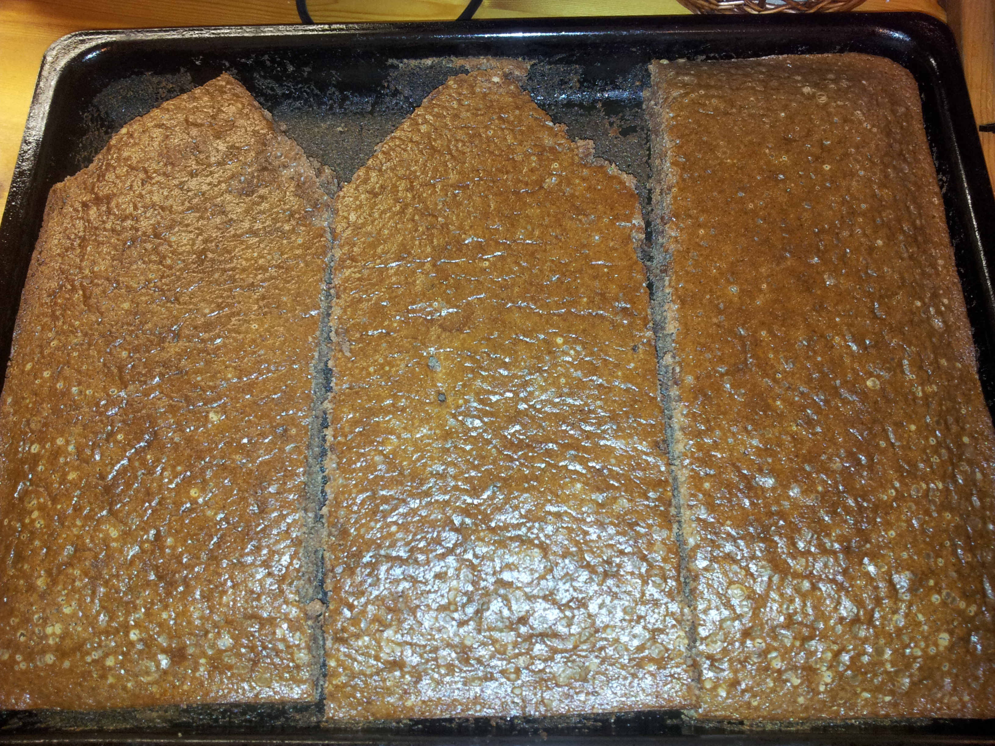 Når kaken så er avkjølt deler du den opp i tre like deler. Skjær bort to trekanter på alle delene. Legg to av kakene oppå hverandre. På den siste skjærer du bort den midterste delen. Legg de delene fremme og bak på de to andre. Finskjær kaken tilslutt. Bygg opp skipet med sjokoladeglasur som lim. Dekk sidene med glasur. Jeg valgte å ha glasur mellom lagen også, men det er valgfritt 🙂