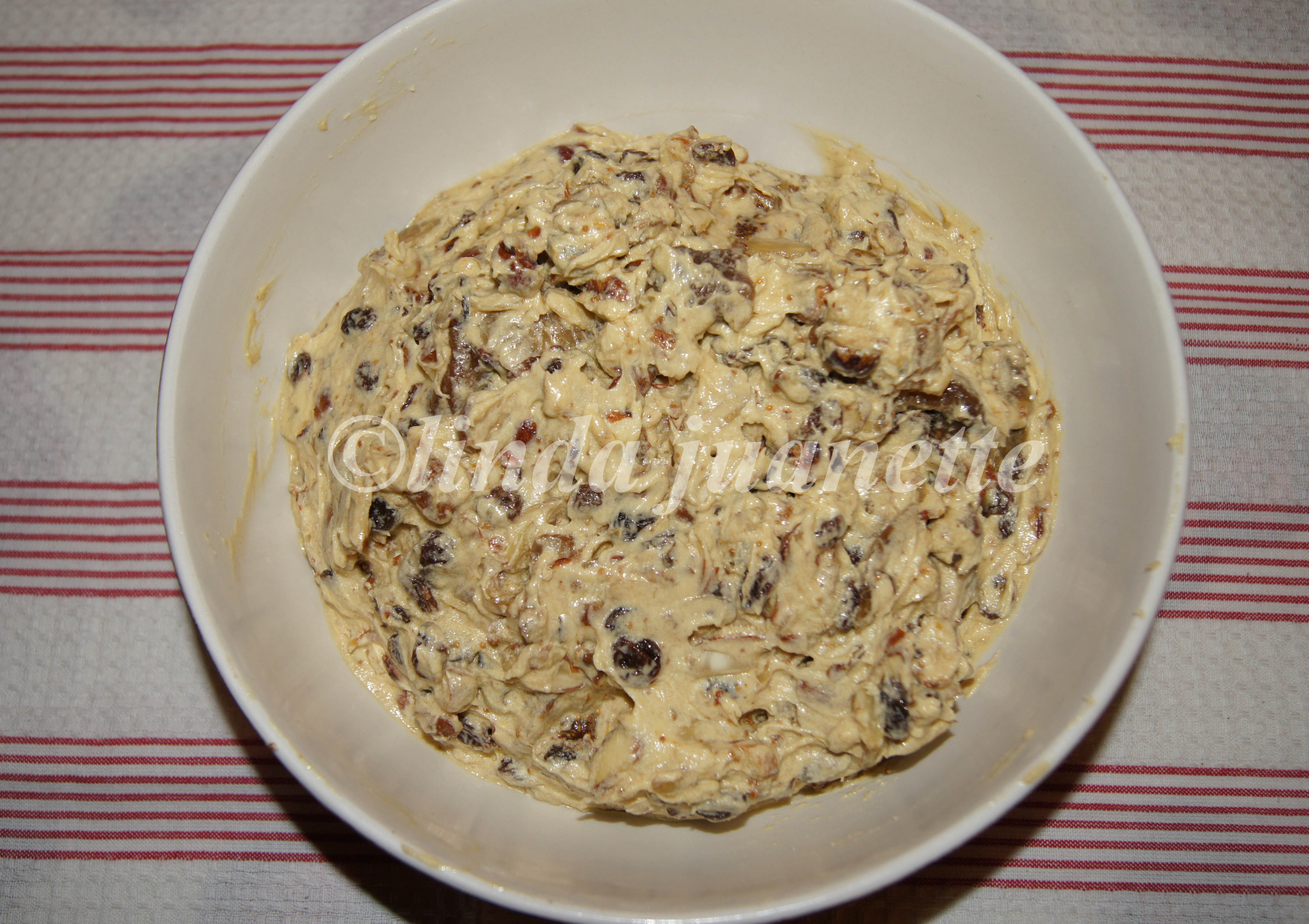 Fremgangsmåte: Lag fruktblandingen og tilsett appelsinjuice og cognac. La blandingen trekke noen timer eller helst over natten. (Jeg liker ikke apsikat og sukat og bruker derfor bytte det ut med annen tørket frukt eller øke mengden med fiken og nøtter).