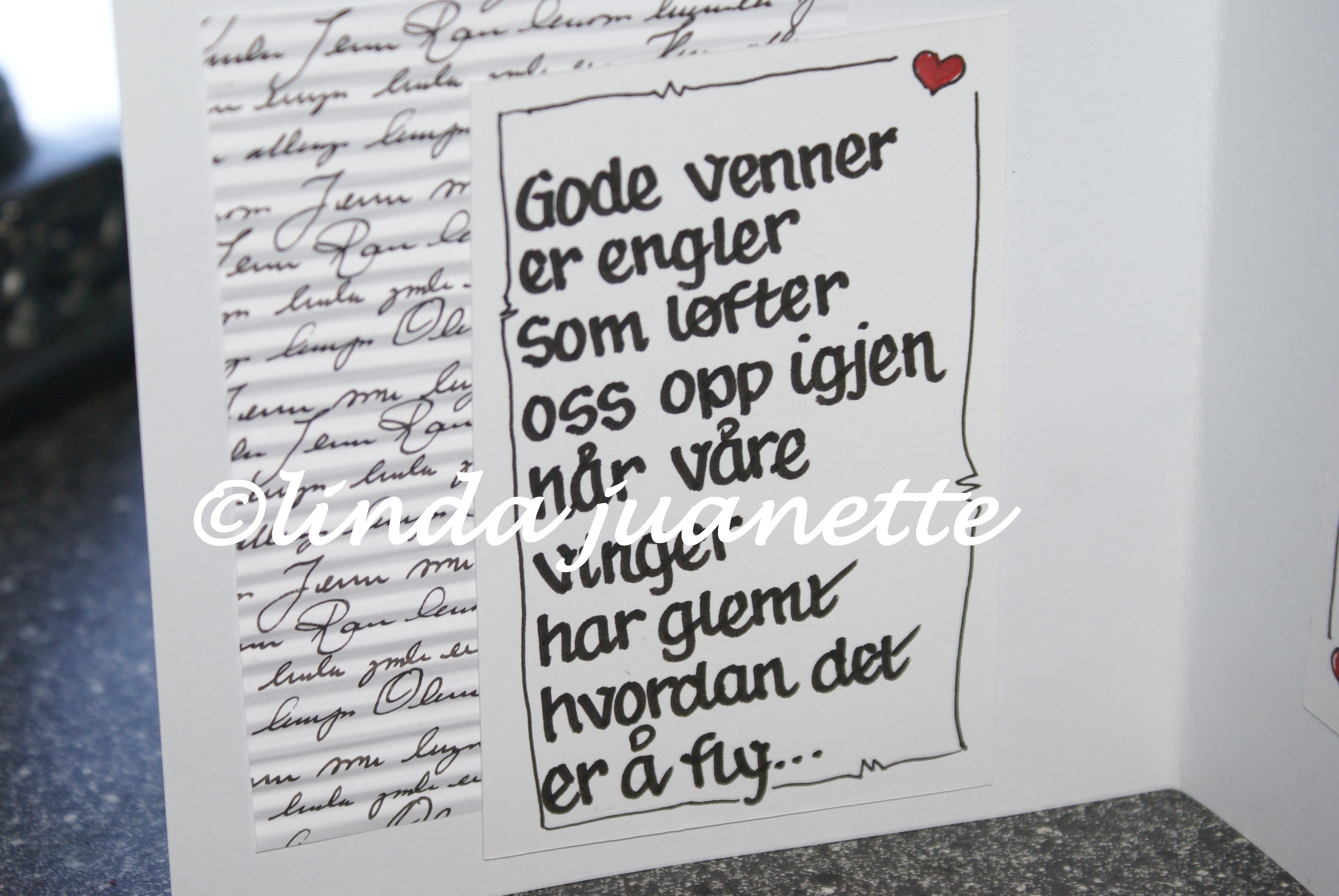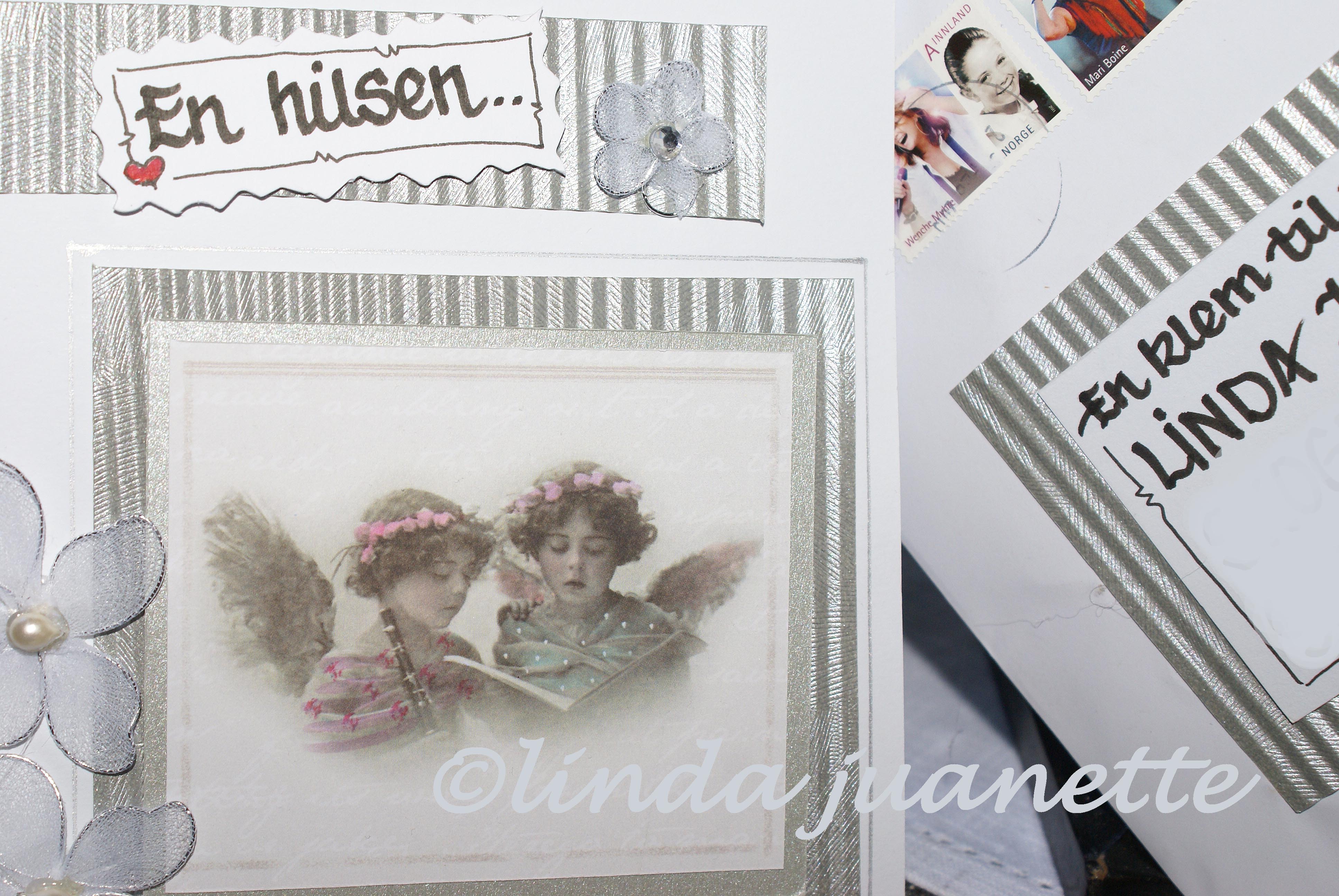 Og jeg er veldig heldig som har en venninne som kan finne på å lage og skrive kort til meg, sånn helt uten at det er noen spesiell anledning. Det er lykke når jeg slik som i dag, på en vanlig hverdag, finner en rikt dekorert konvolutt fra henne innimellom posten med regninger og reklame. Og så spennende som det er å åpne konvolutten for å se hva som åpenbarer seg inni. Denne gang var det et nydelig kort med engler og gode ord.