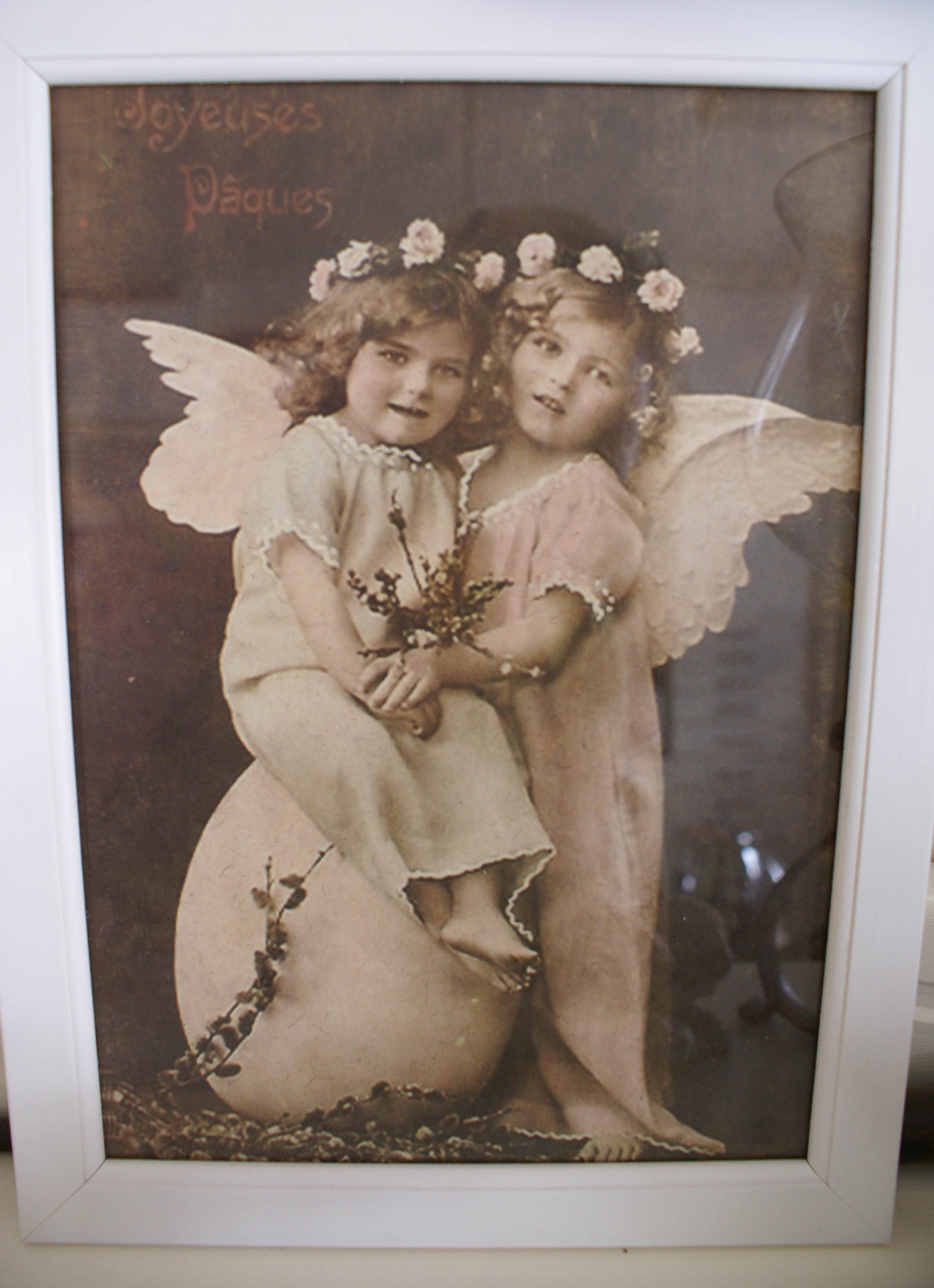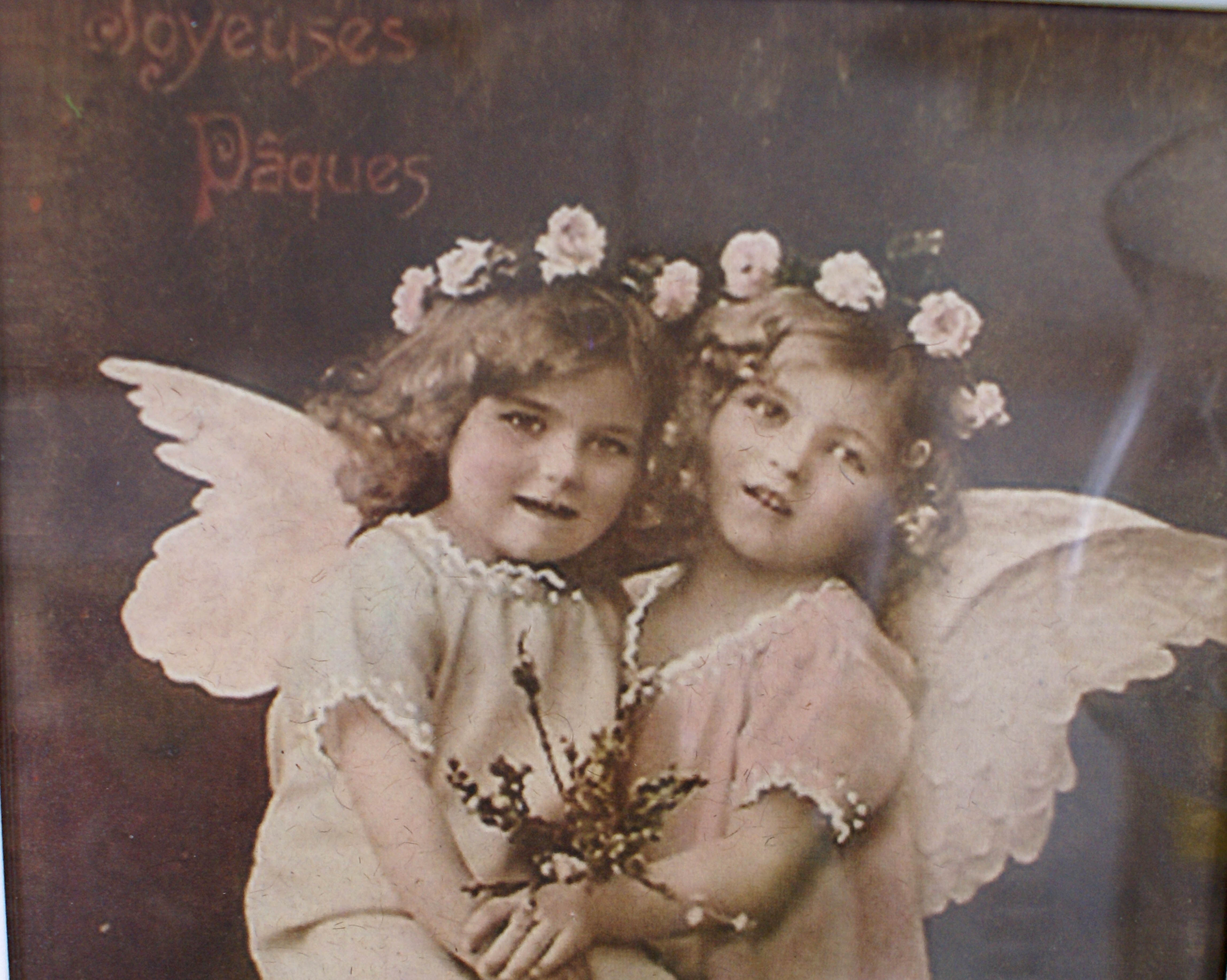 Dette bildet er sannsynligvis opprinnelig et påskekort etter som det har påskriften Joyeuses Pâques, som betyr god påske på fransk, men hos meg står bildet fremme hele året.