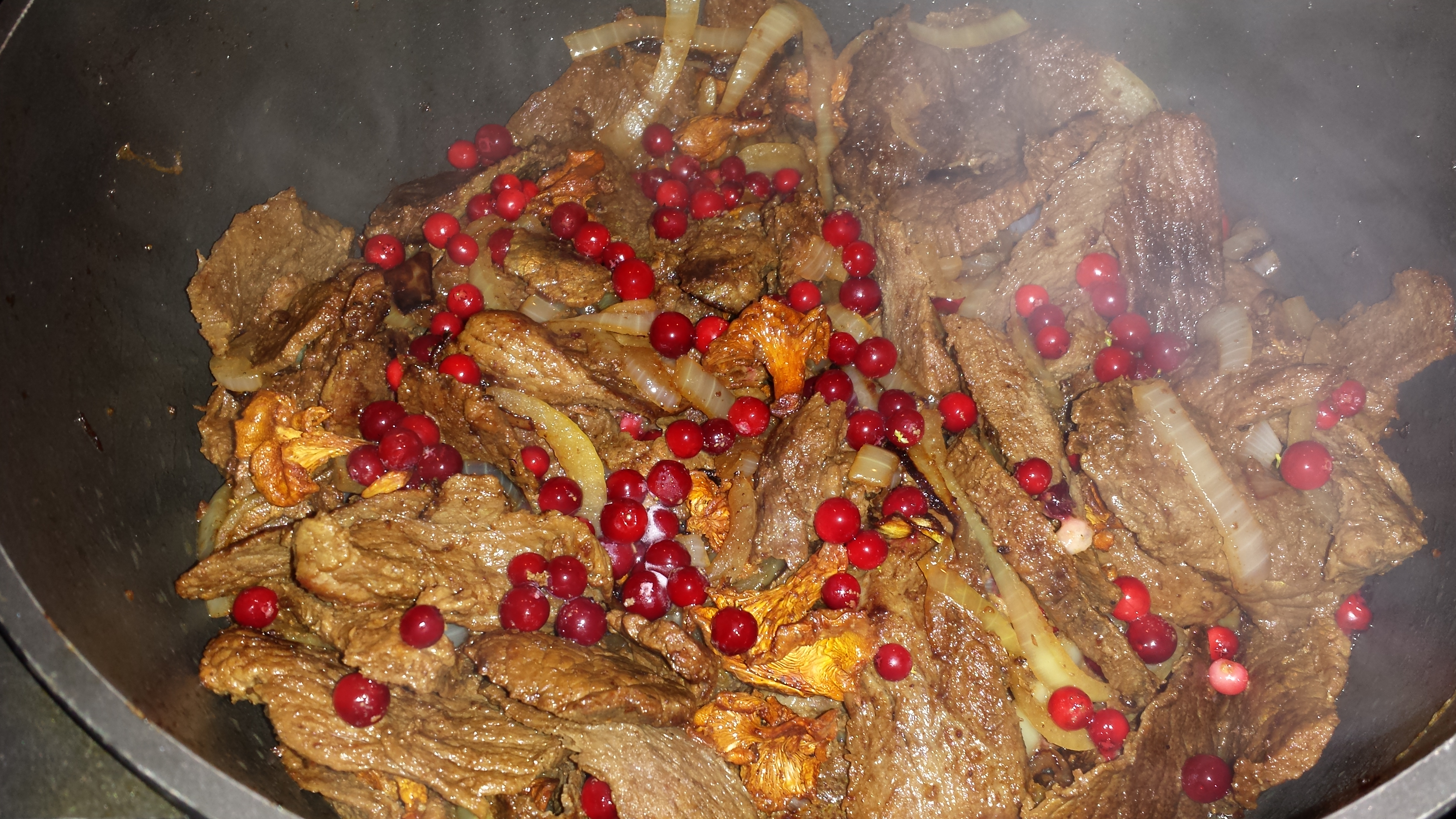 Fremgangsmåte: Halvtin frosset elgkjøtt og skav det i tynne skiver. Fres kjøttet i en vid og dyp panne. Når kjøttet har fått farge tilsettes løken. La det surre sammen til løken begynner å bli blank. Smak til med salt og pepper. Tilsett kantarellen, knuste einebær, tyttebær, og sukker, deretter rører du inn rømme og fløte. Ha på lokk og la småputre imens du koker poteter og ordner eventuelt annet tilbehør.