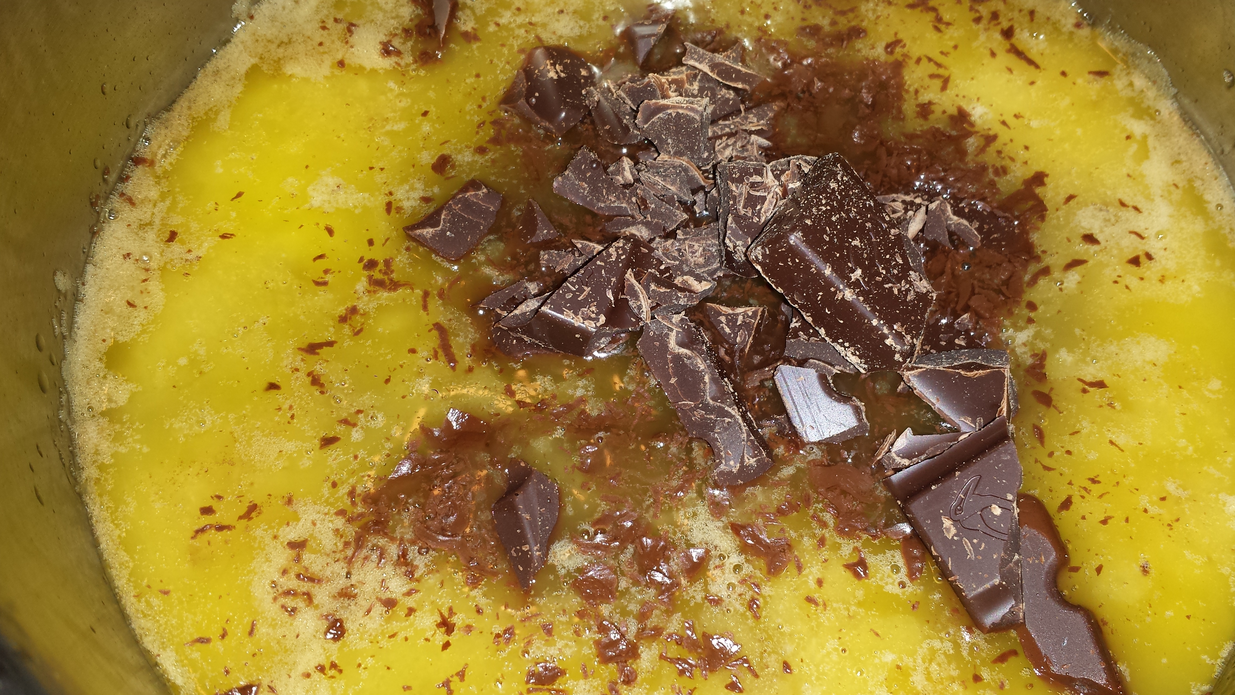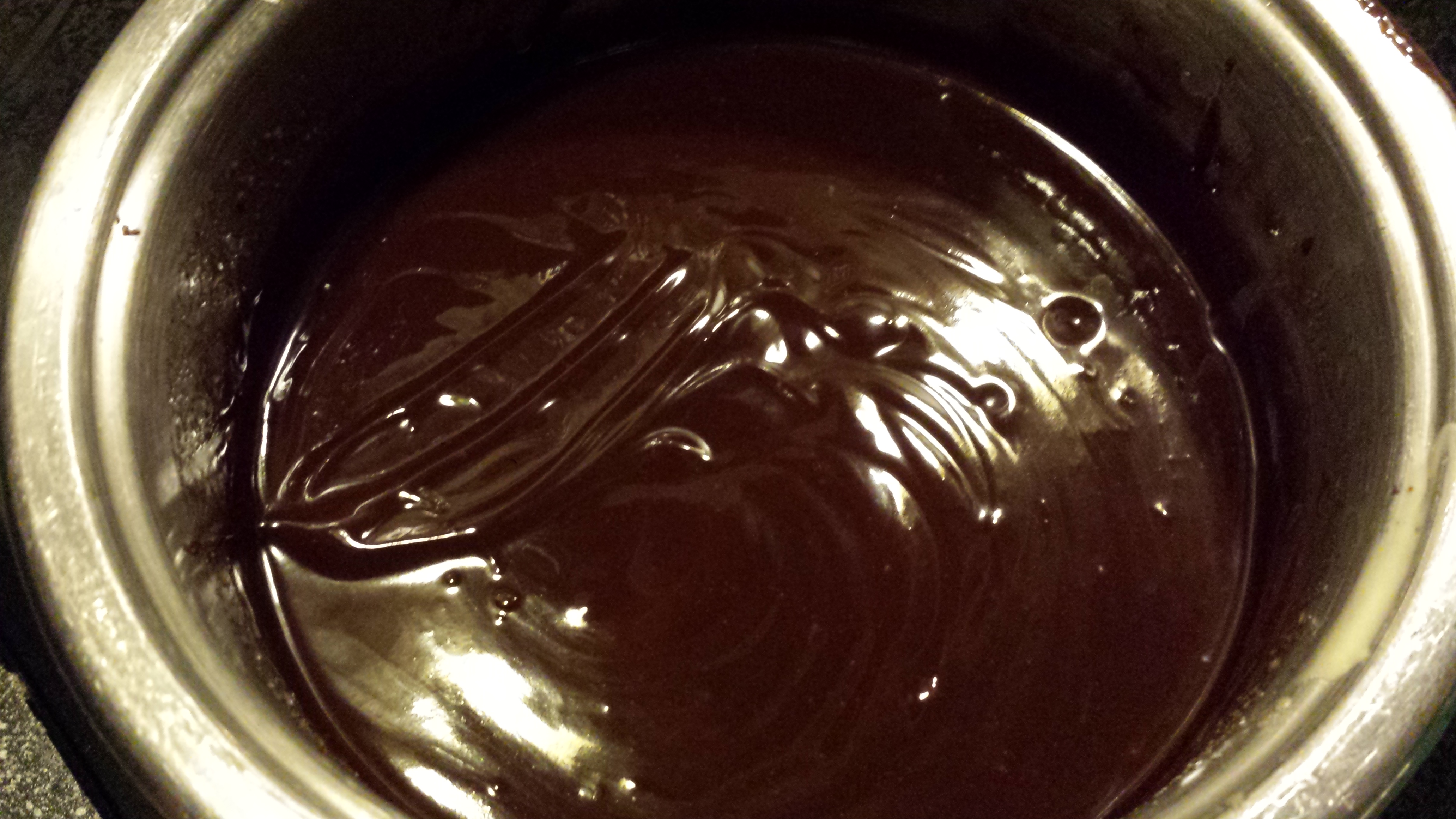 Kok opp vann og smør på lav varme, tilsett deretter hakket eller revet sjokolade. Når sjokoladen er smeltet rører du sammen og tar det kjelen av plata. Rør i sjokoladefyllet med jevne mellomrom til det er avkjølt og klar for å has på kaken.