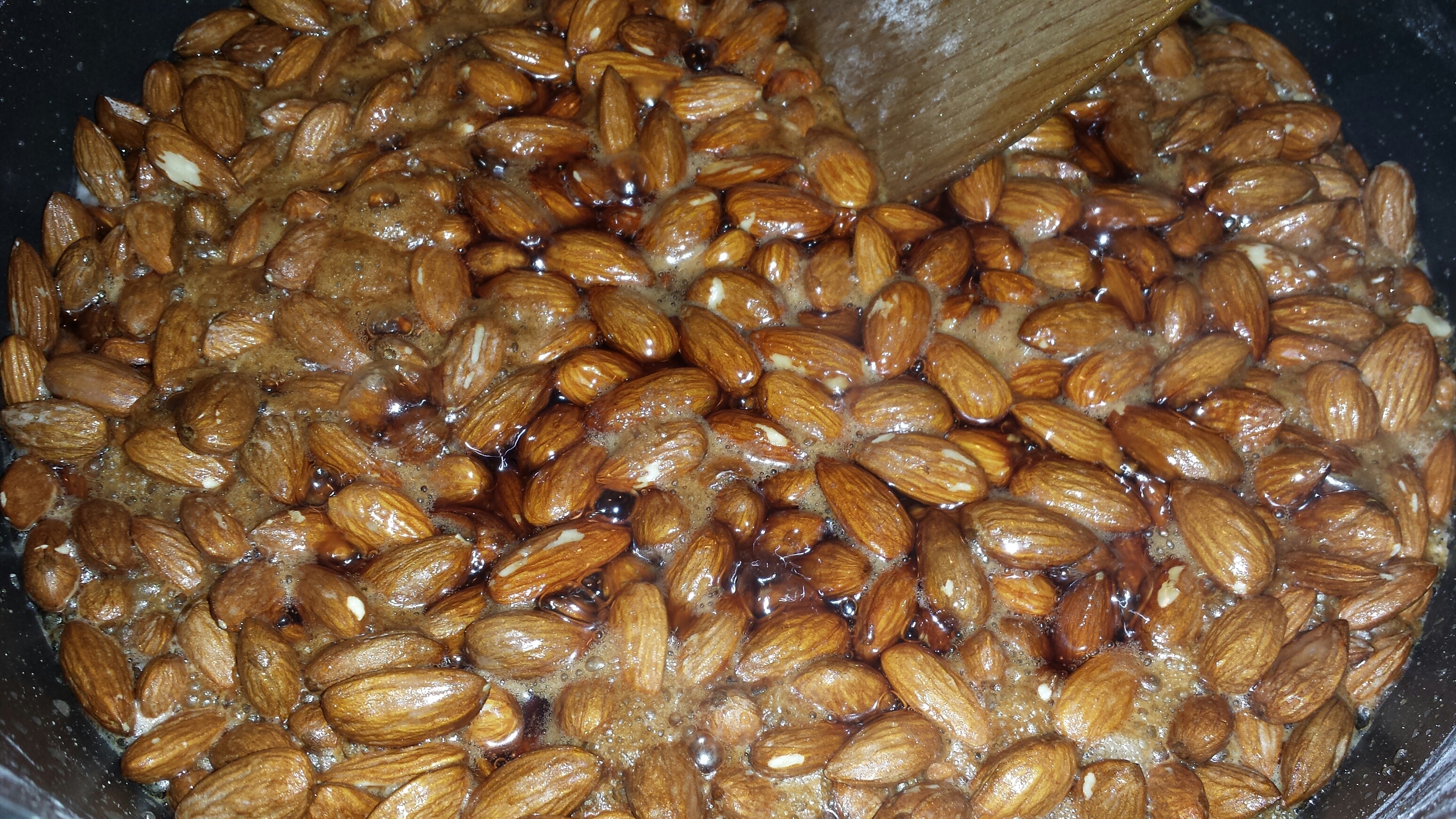 Når sukkeret er krystallisert skrus varmen opp. Ha i smøret. Rør hele tiden i mandlene slik at det ikke svir seg i bunnen. Når sukkeret som hadde krystallisert seg er blitt flytende er de brente mandlene ferdig. Ha alt ut på godt smurt underlag. Bruk to smurte gafler til å fordele mandlene utover underlaget slik at det blir lett å ta fra hverandre etterpå.