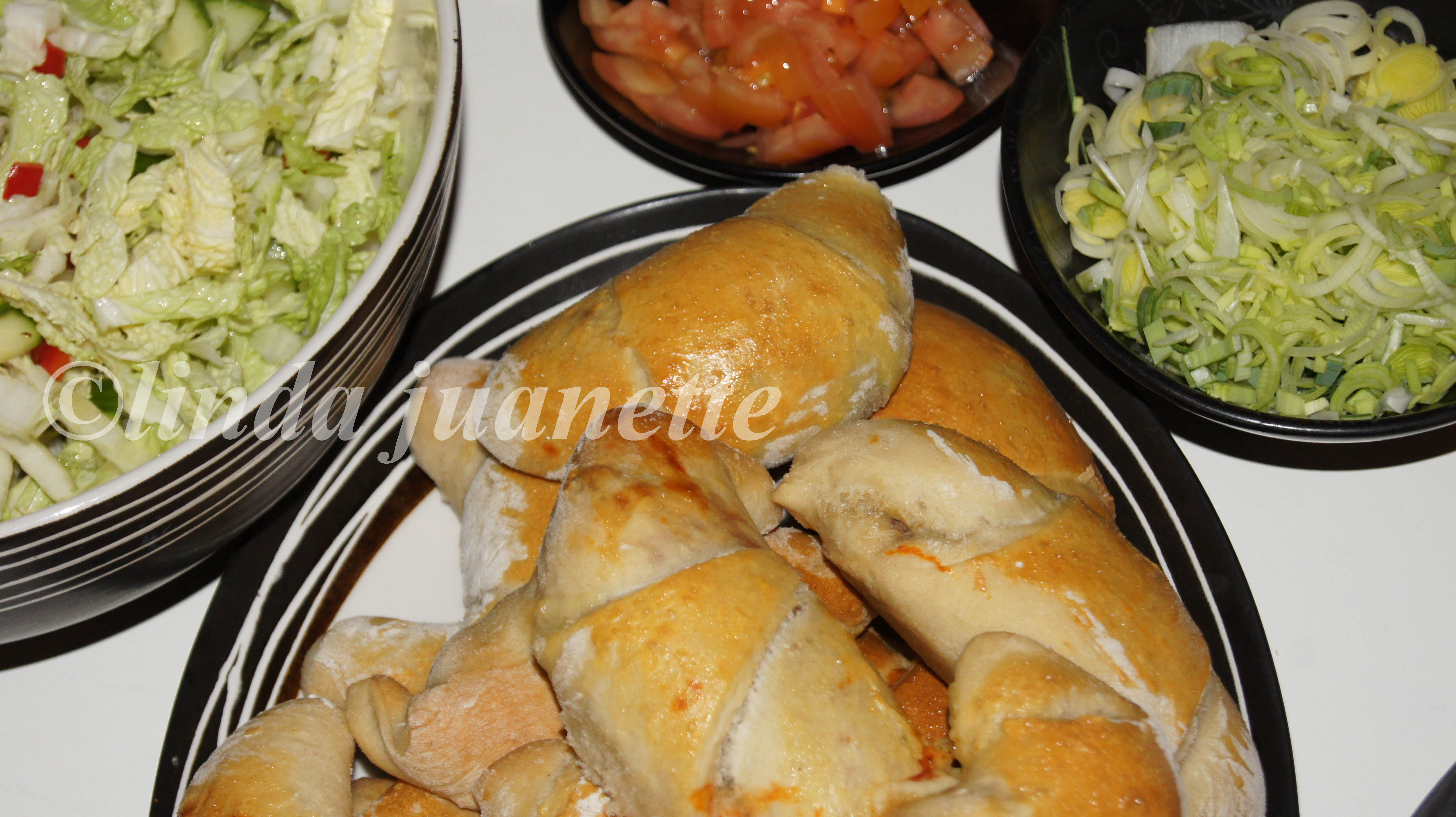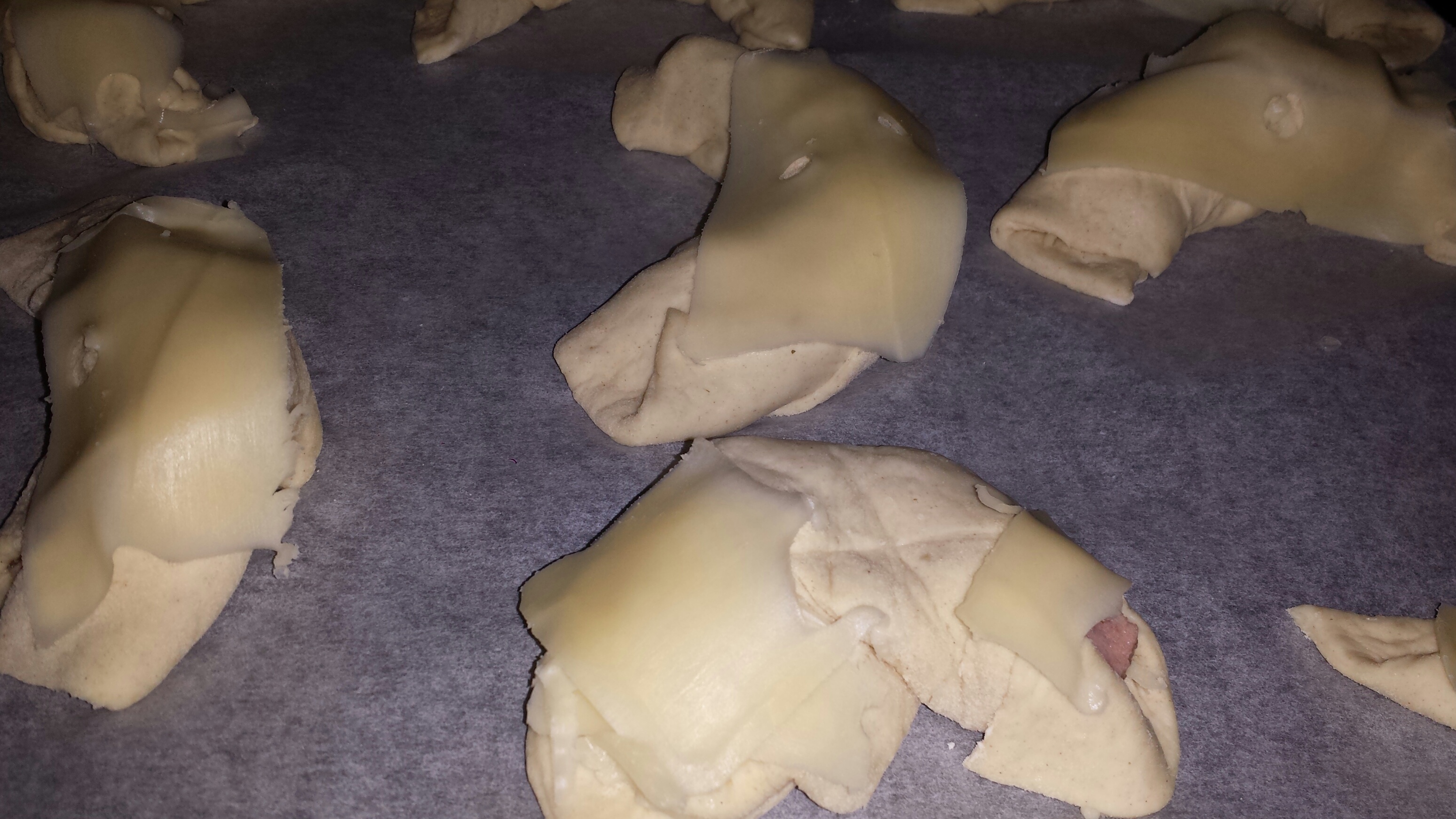 Fyll: Hornene kan fylles med hva du måtte ønske, gjerne ha samme utgangspunkt som for eksempel pizzafyll. Jeg bruker oftest å steike kjøttdeig sammen med hakket løk, og krydre etter smak. Har man det riktig travelt kan hornene fylles med kjøpt pizzafyll, skinke, tomater, eller bare ost. Her er det bare å velge ut fra hva man liker 🙂