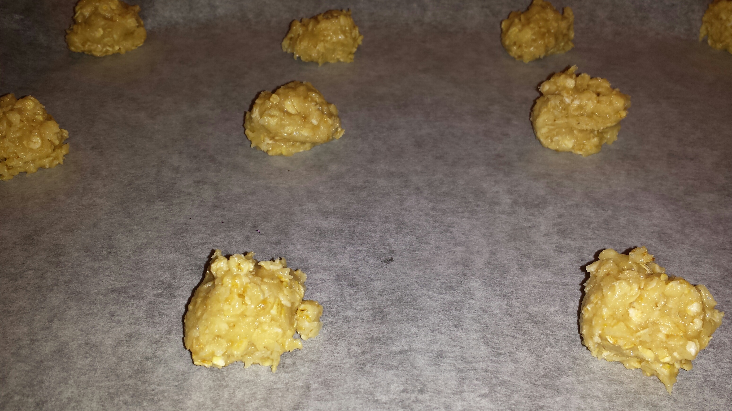 Bland sammen alle ingrediensene. Legg deigen med en teskje på bakepapirkledt steikebrett, med god avstand imellom.