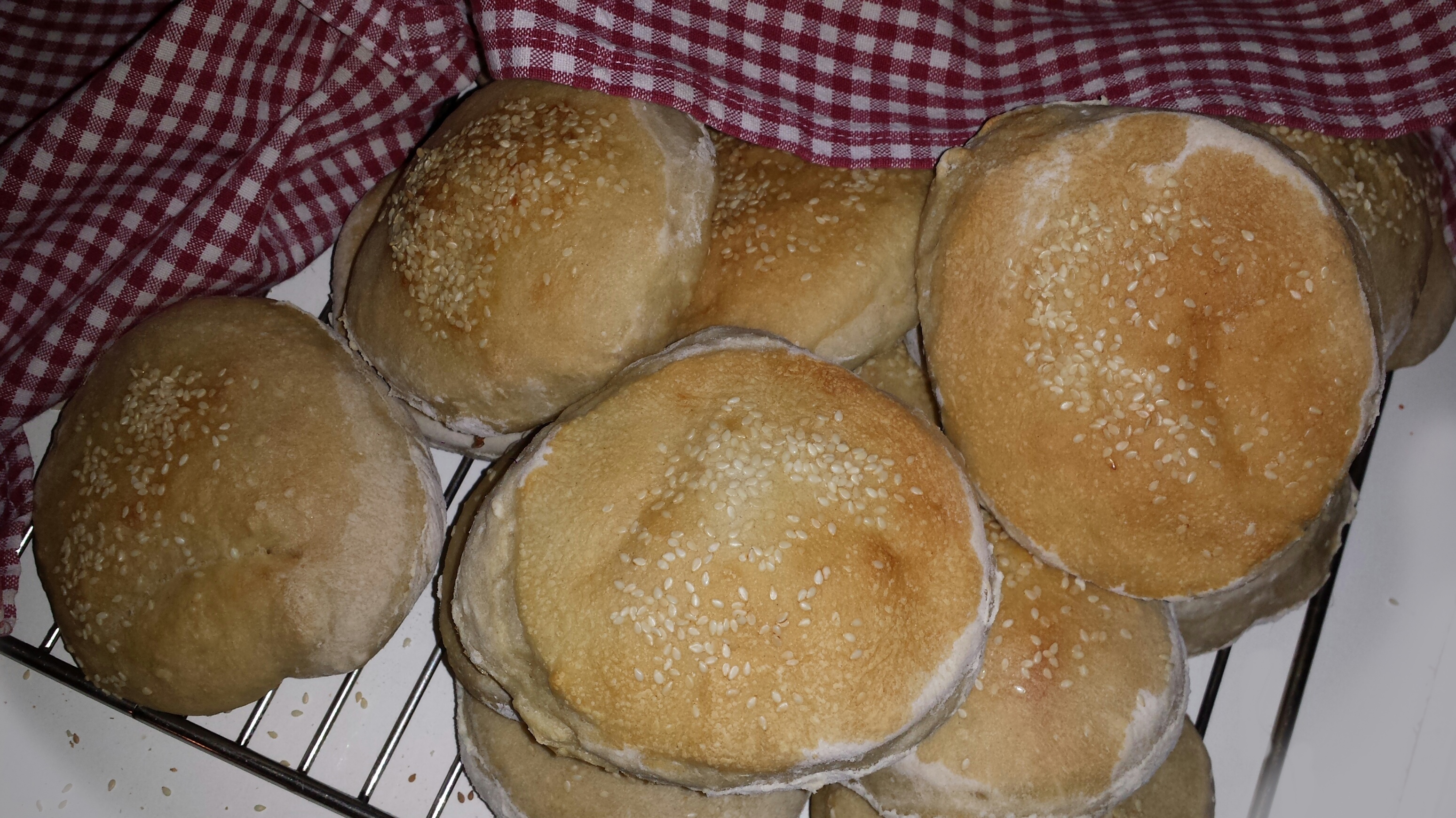 Sett hamburgerbrødene til heving på smurt eller bakepapirkledt brett. Heves i 30 minutter. Pensle over med lunken melk og strø med sesamfrø.