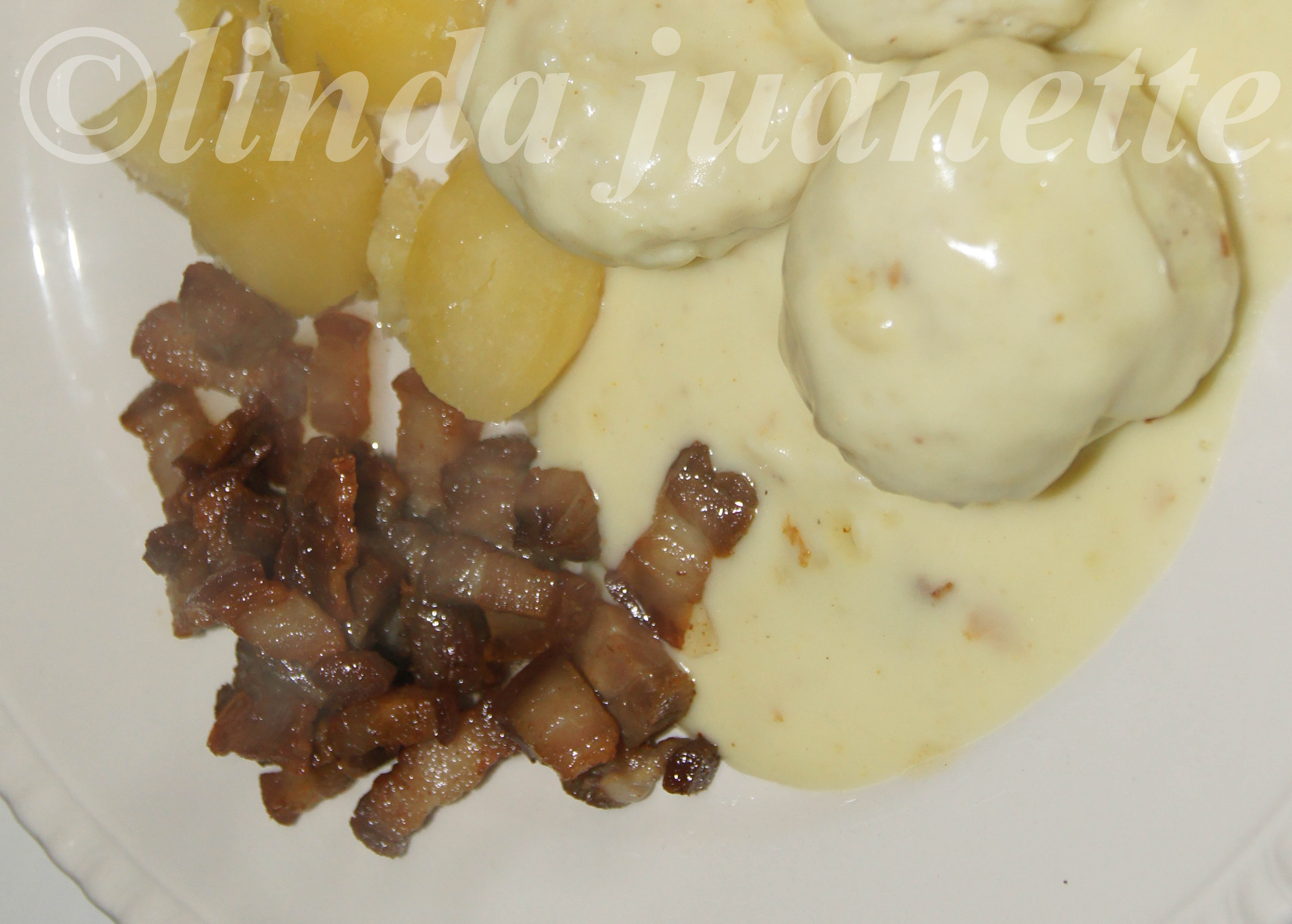 Sprøstekt bacon eller surret løk er godt tilbehør til fiskeboller i hvit saus, i tillegg til gulrot og andre grønnsaker.
