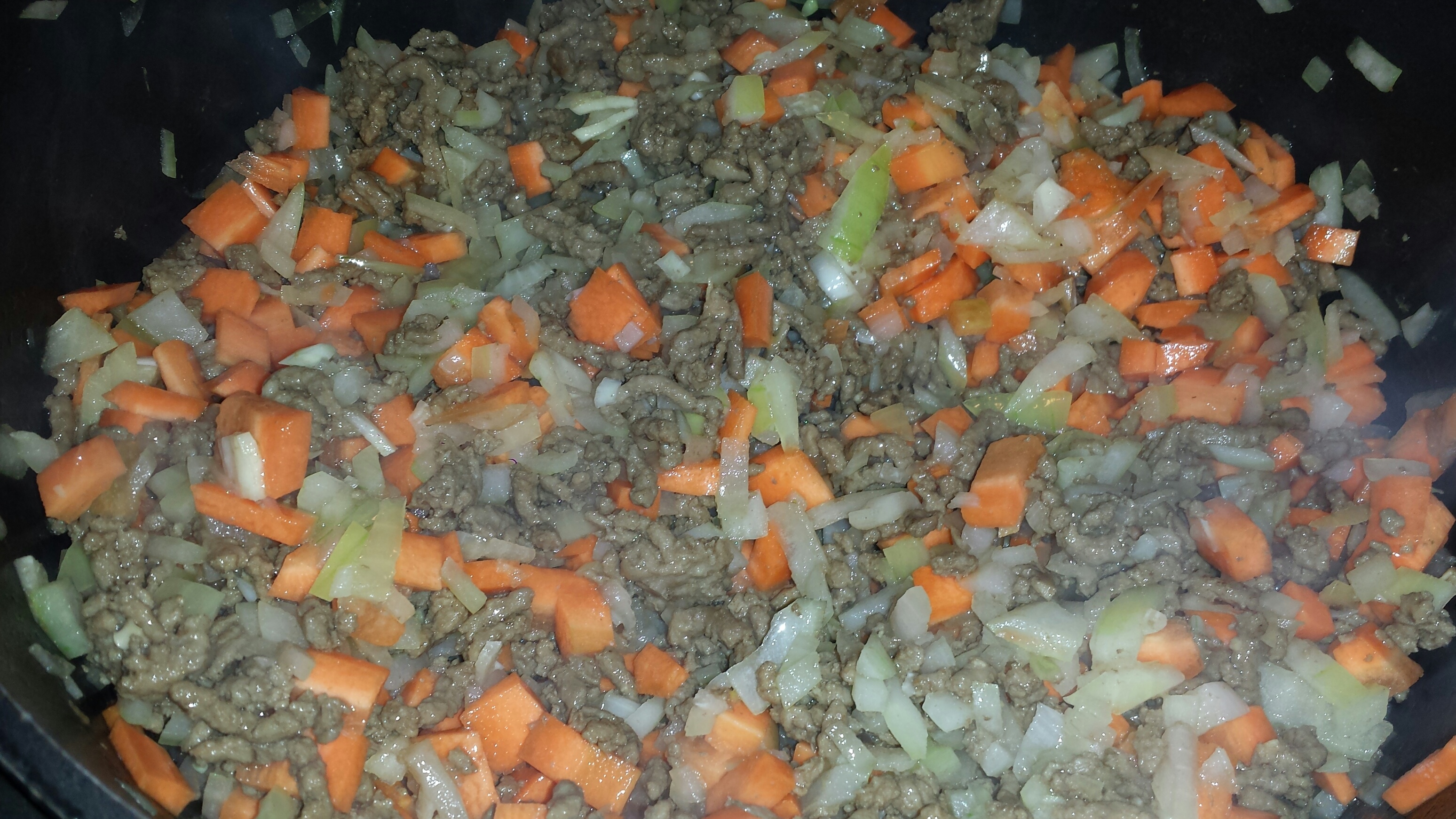 Fremgangsmåte: Fres kjøttdeigen i en panne med olje. Ha deretter i gulrot og løk. Når løken begynner å bli blank has tomatpureen, worcestershire sausen og urtene i, og det hele freses på sterk varme noen minutter. Ha i rødvin og kok alt sammen inntil vinen har kokt inn (redusert).