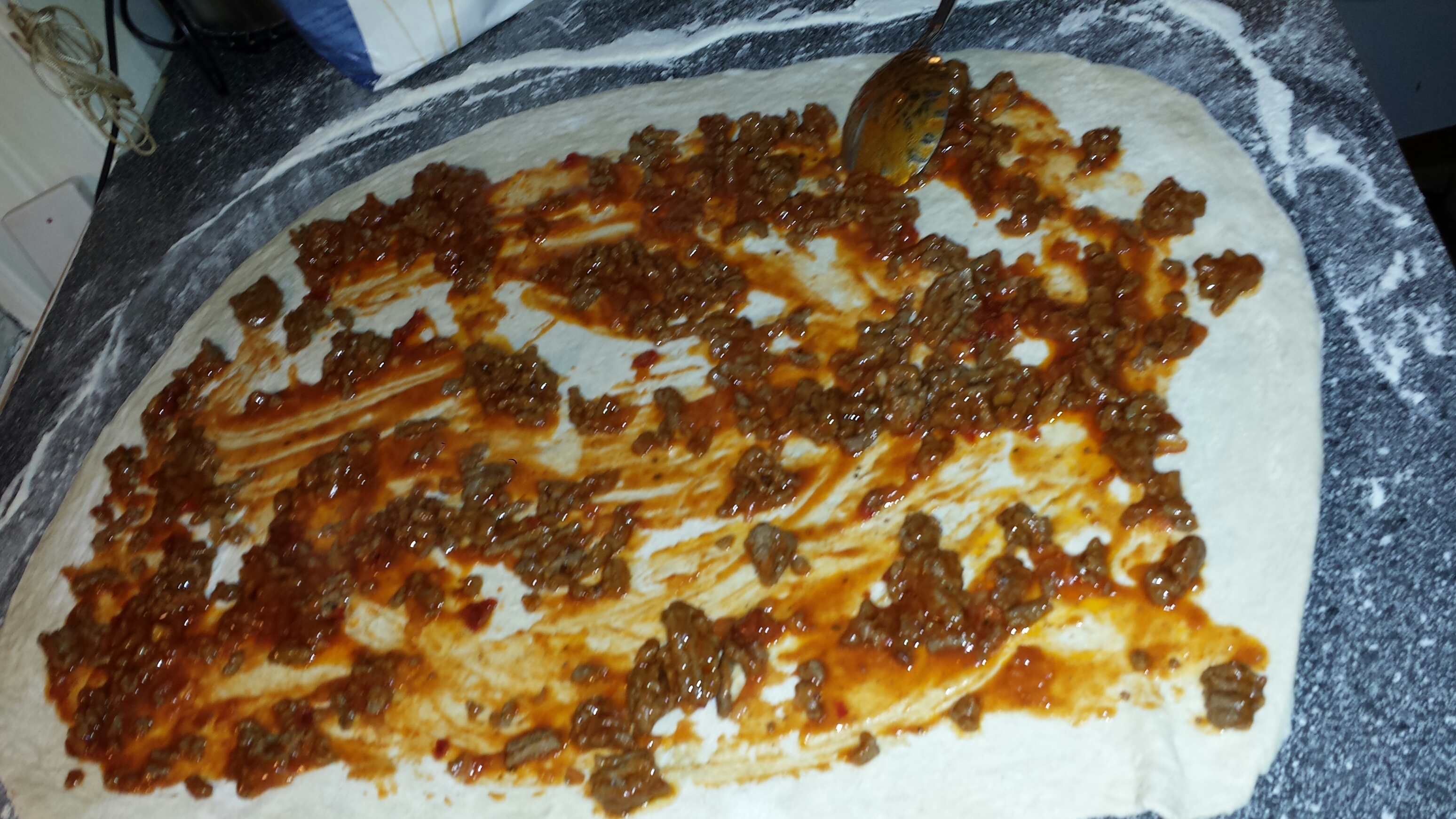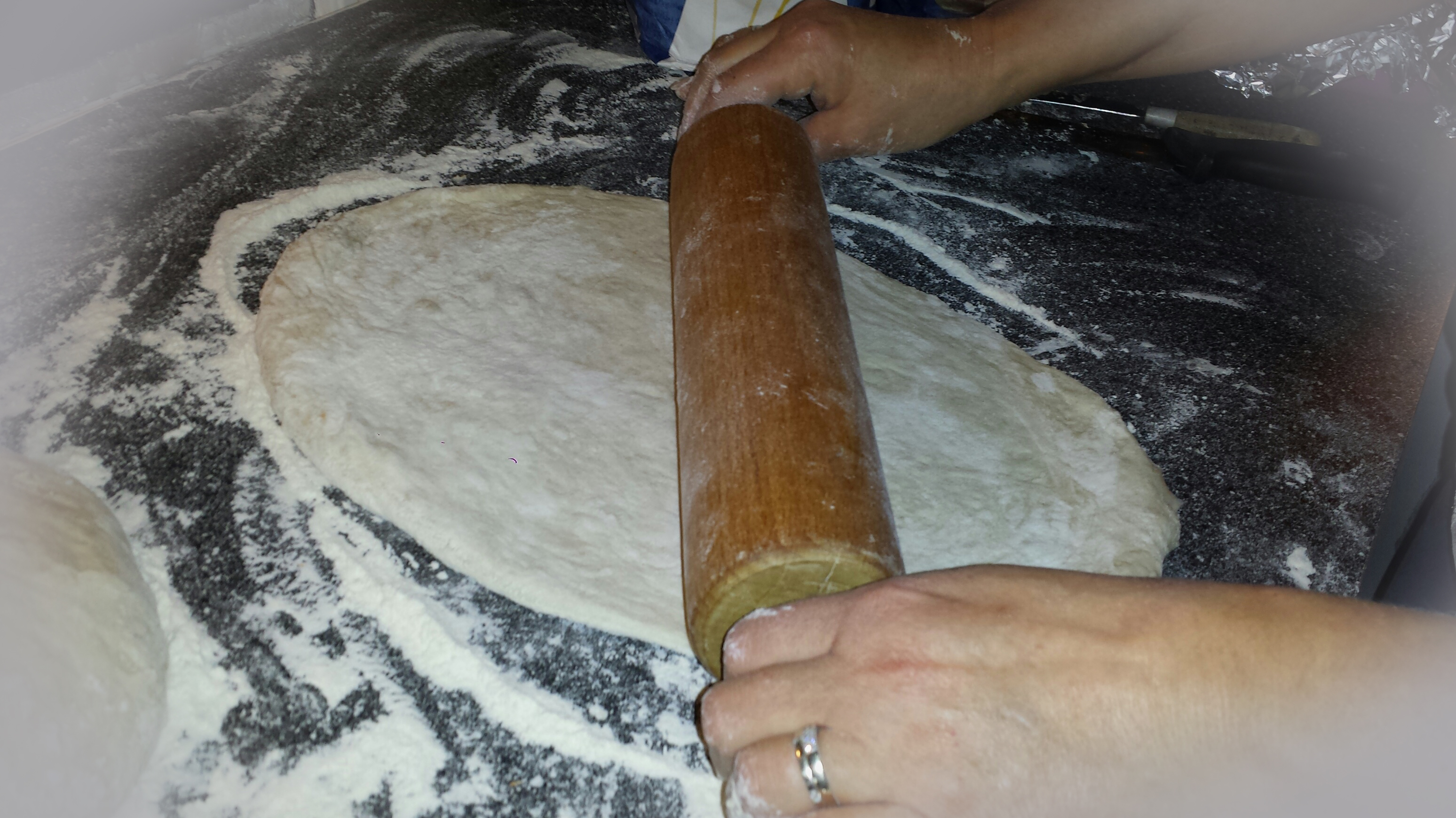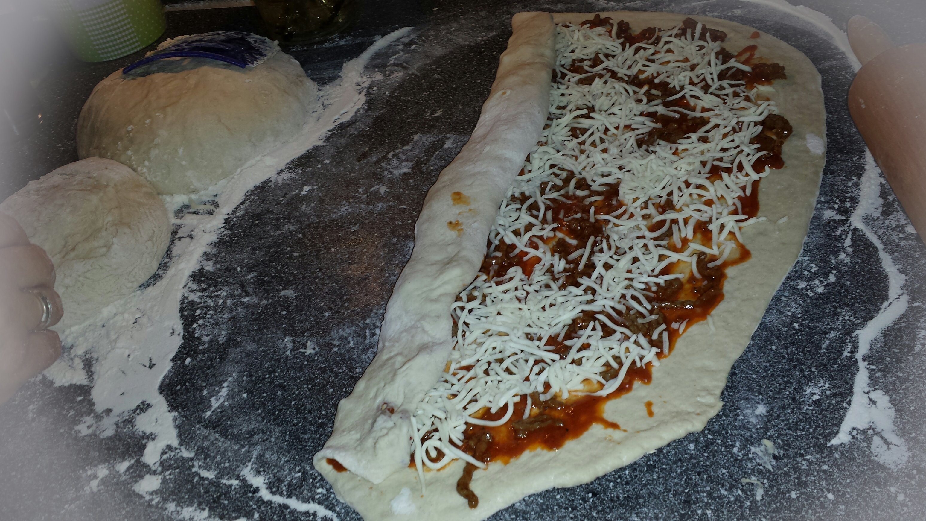 Når deigen er ferdighevet er det bare å kjevle ut leiver som fylles med pizzafyll, se bilder nedenfor.