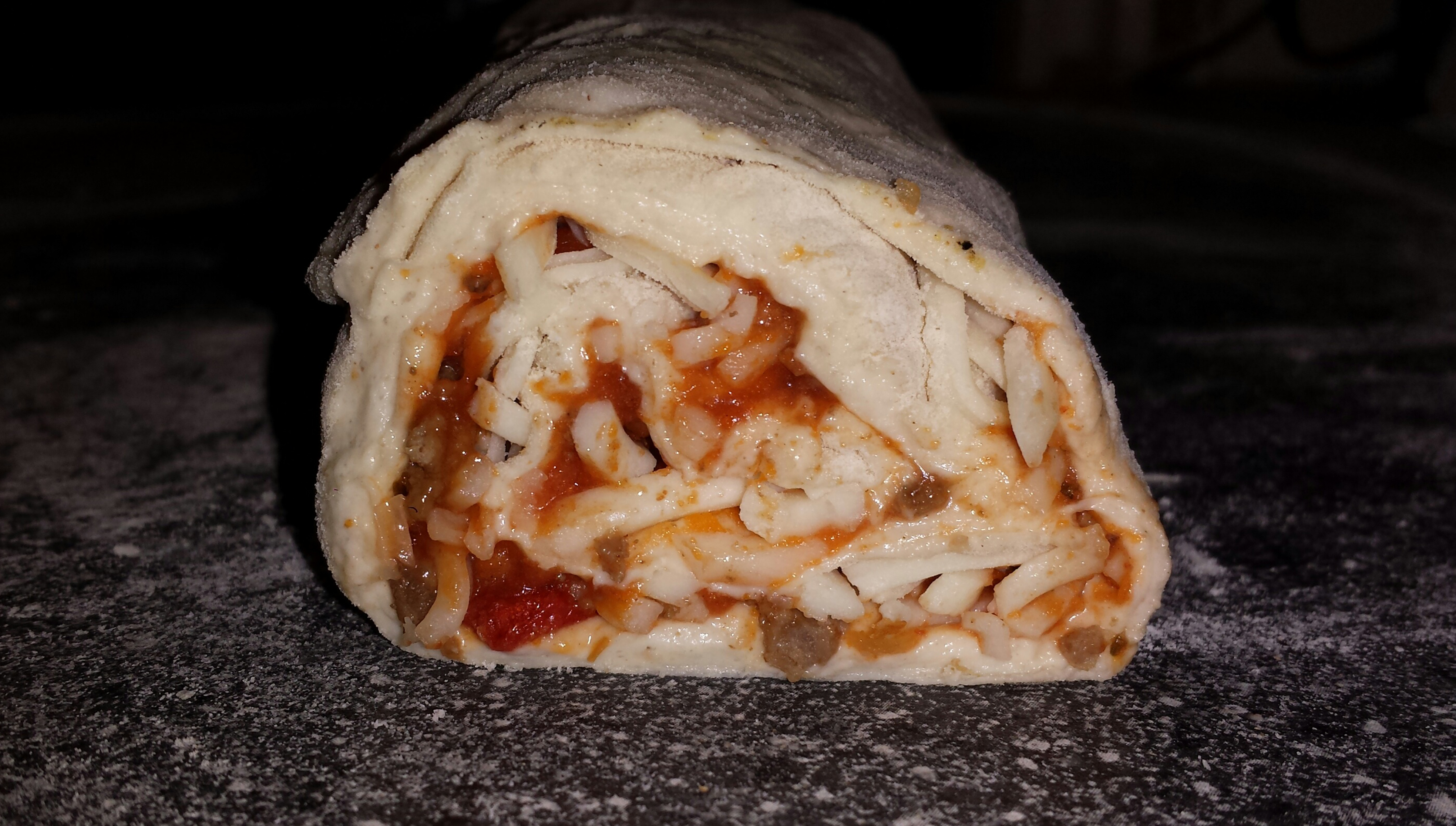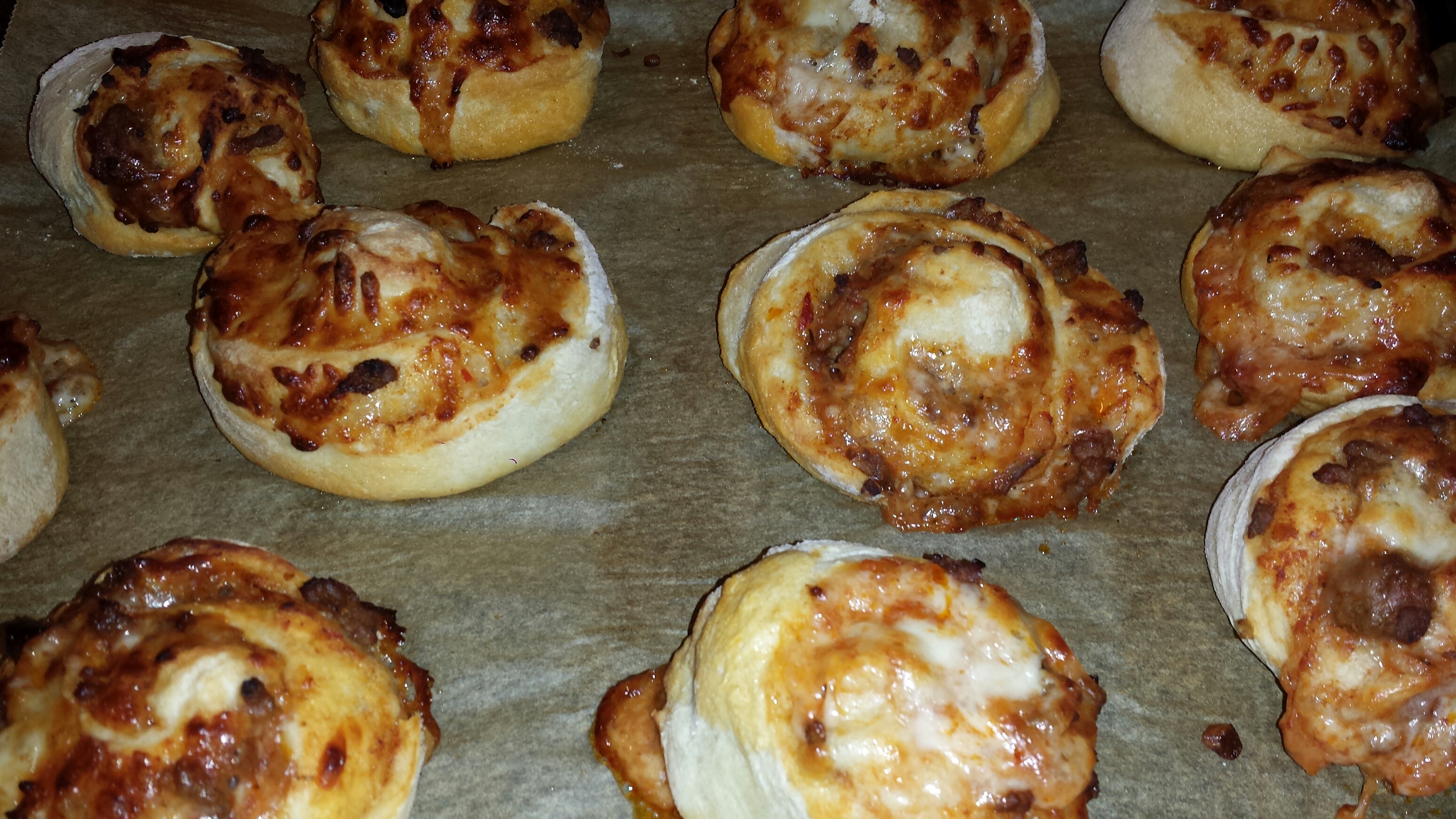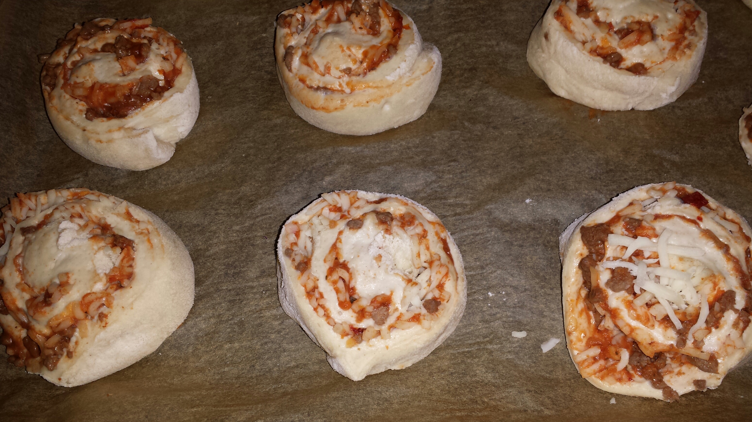 Når deigen er ferdighevet er det bare å kjevle ut leiver som fylles med pizzafyll, se bilder nedenfor.