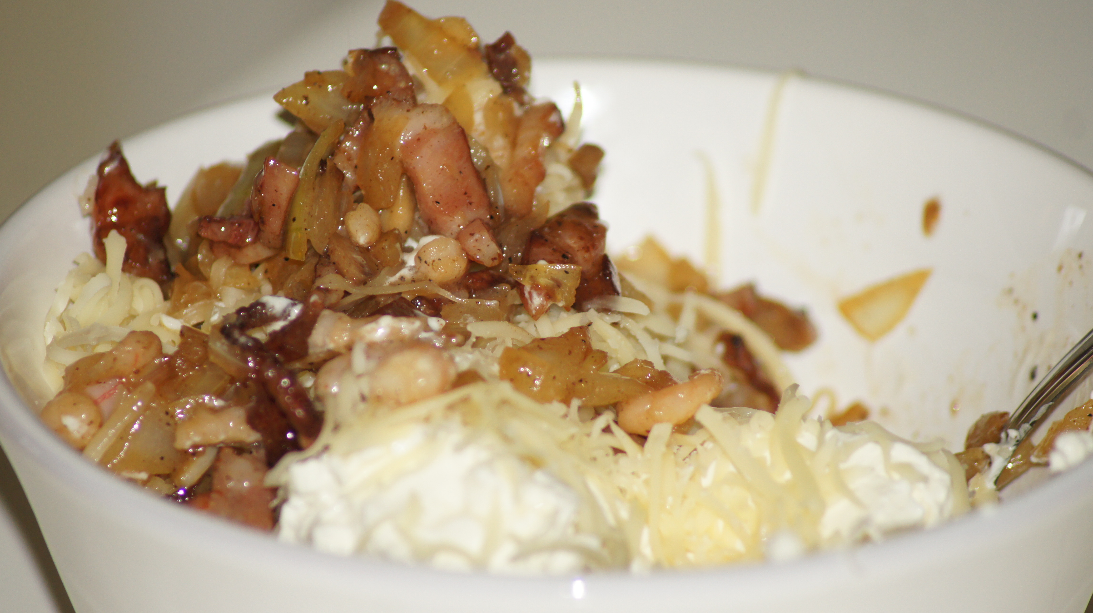 Ha løken og de finhakkede soppstilkene i pannen sammen med baconet. Krydre godt med kvernet salt og pepper, og stek videre til soppen har frigitt det meste av vesken og er blitt mør med en fin brun farge.