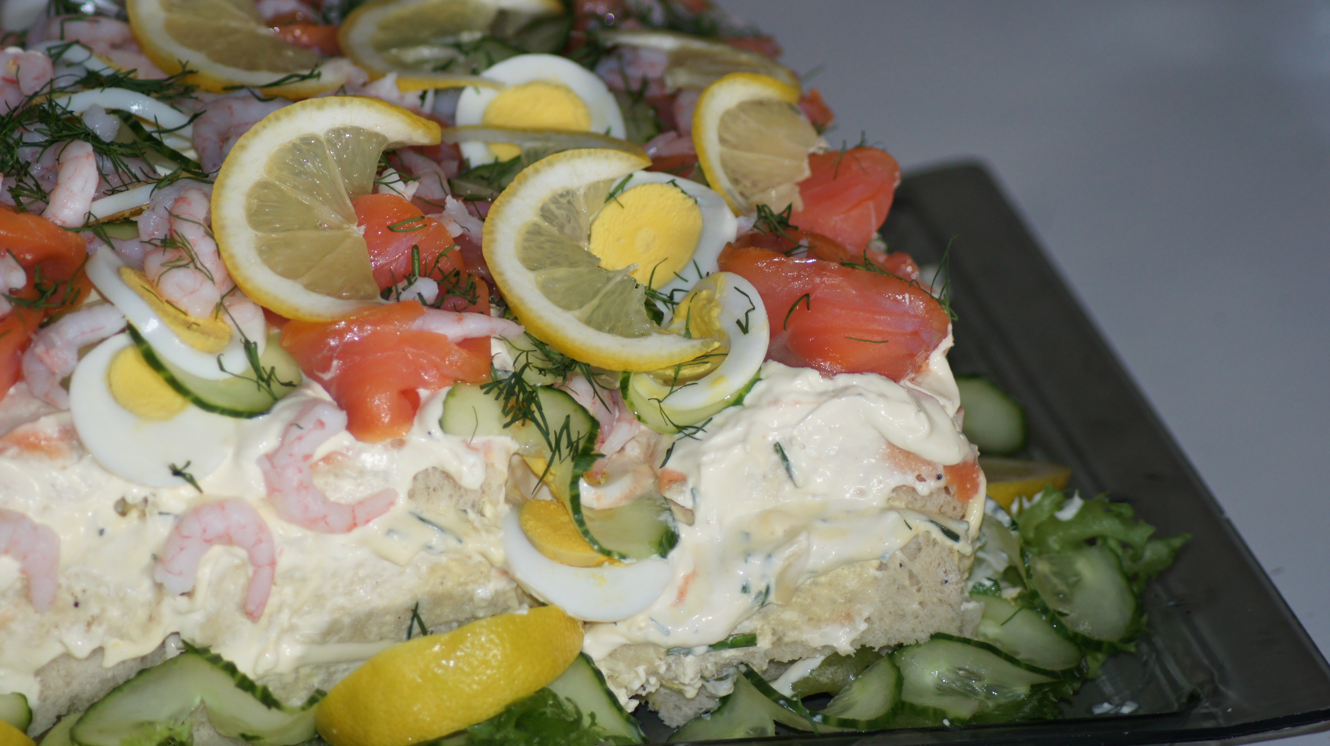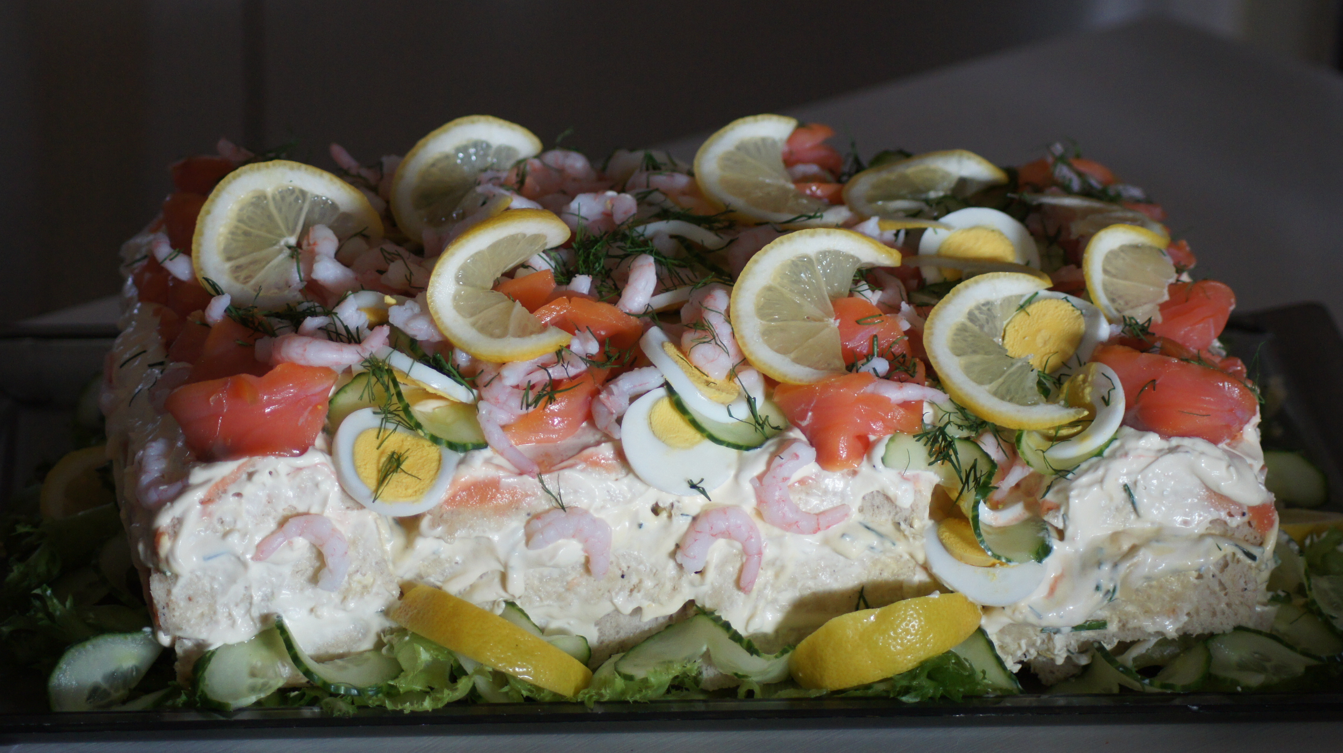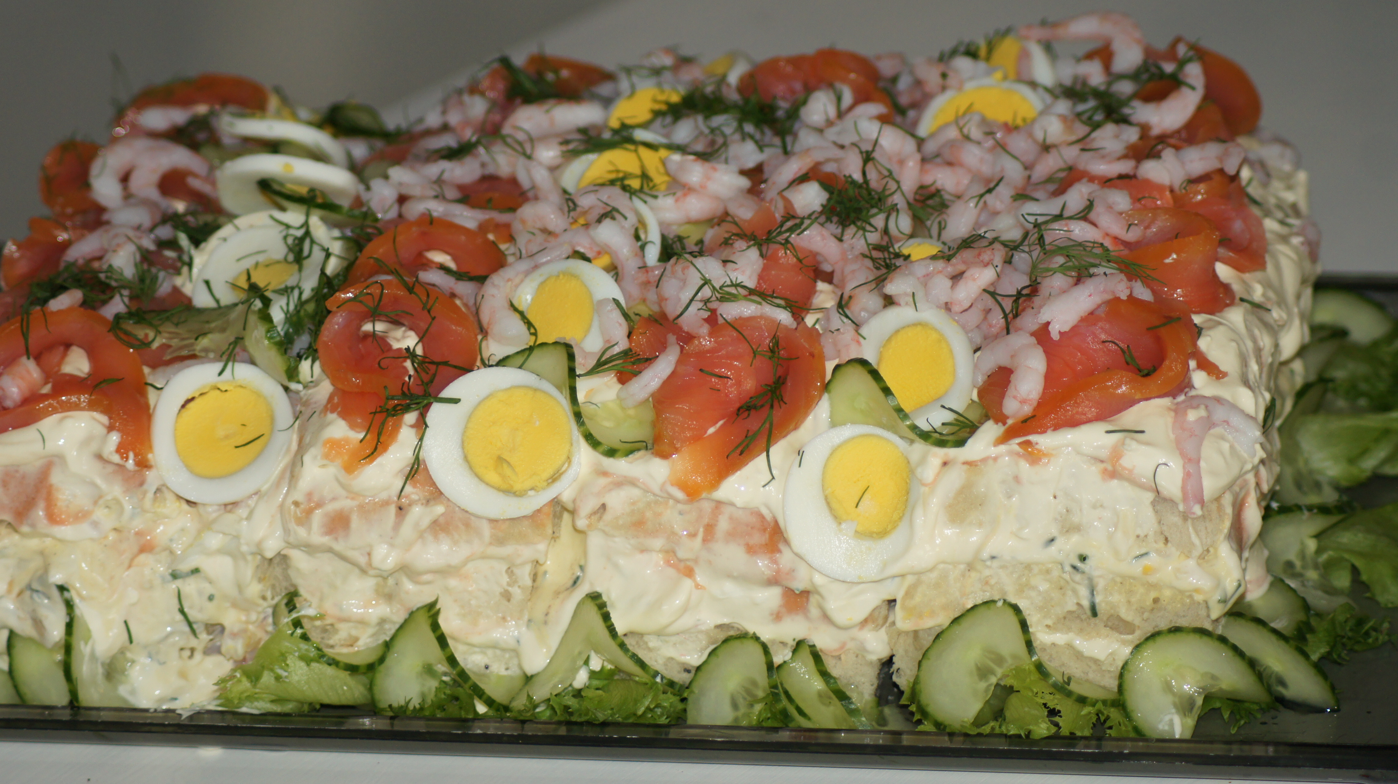 Sett smørbrødterten kjølig over natten slik at den får stå og trekke smaker før servering.