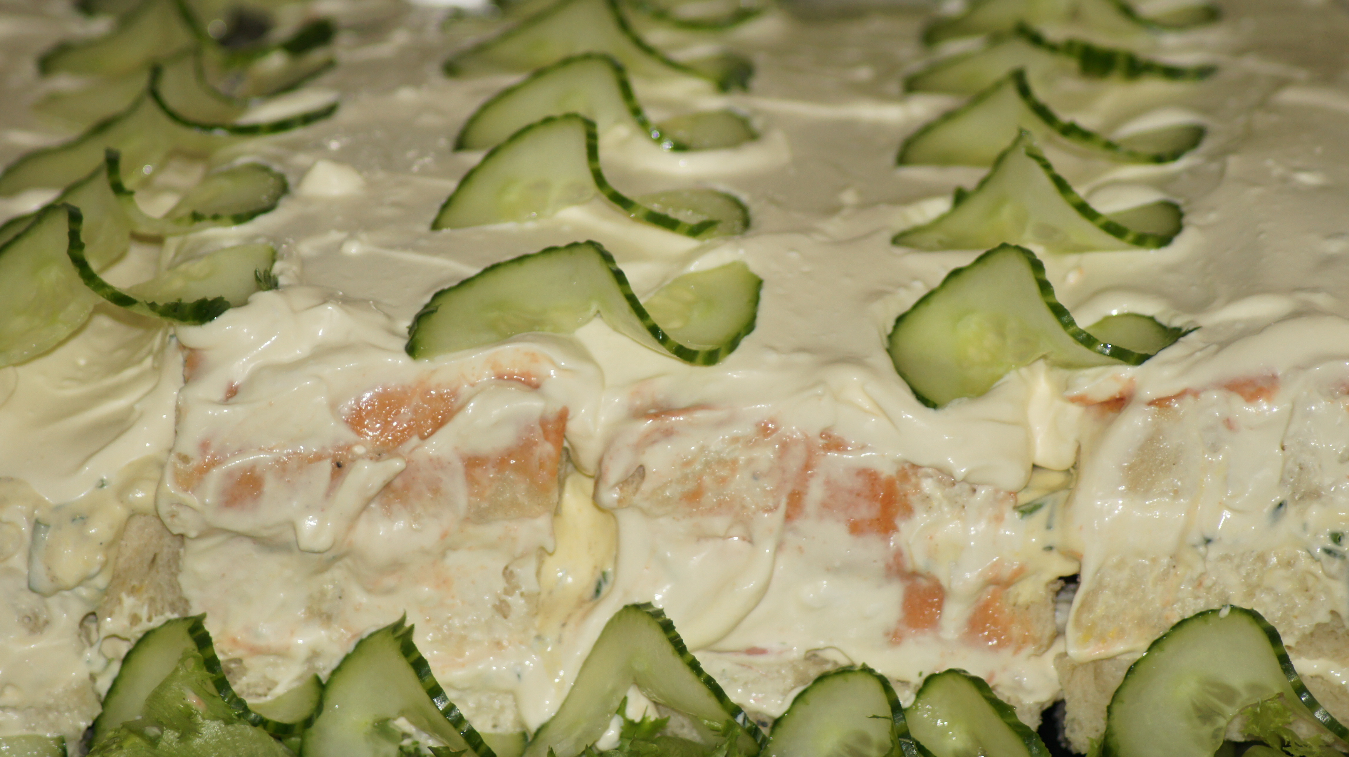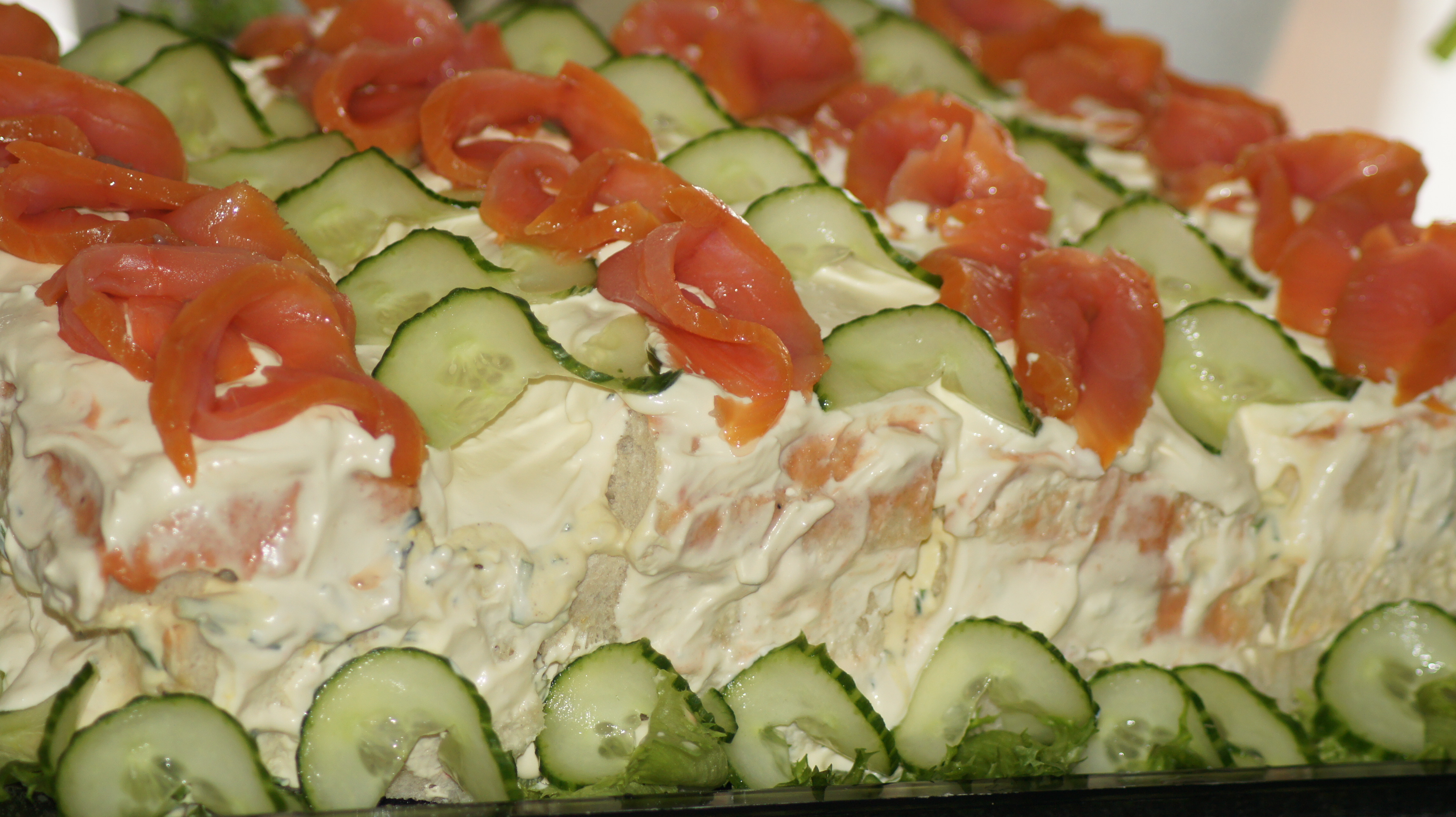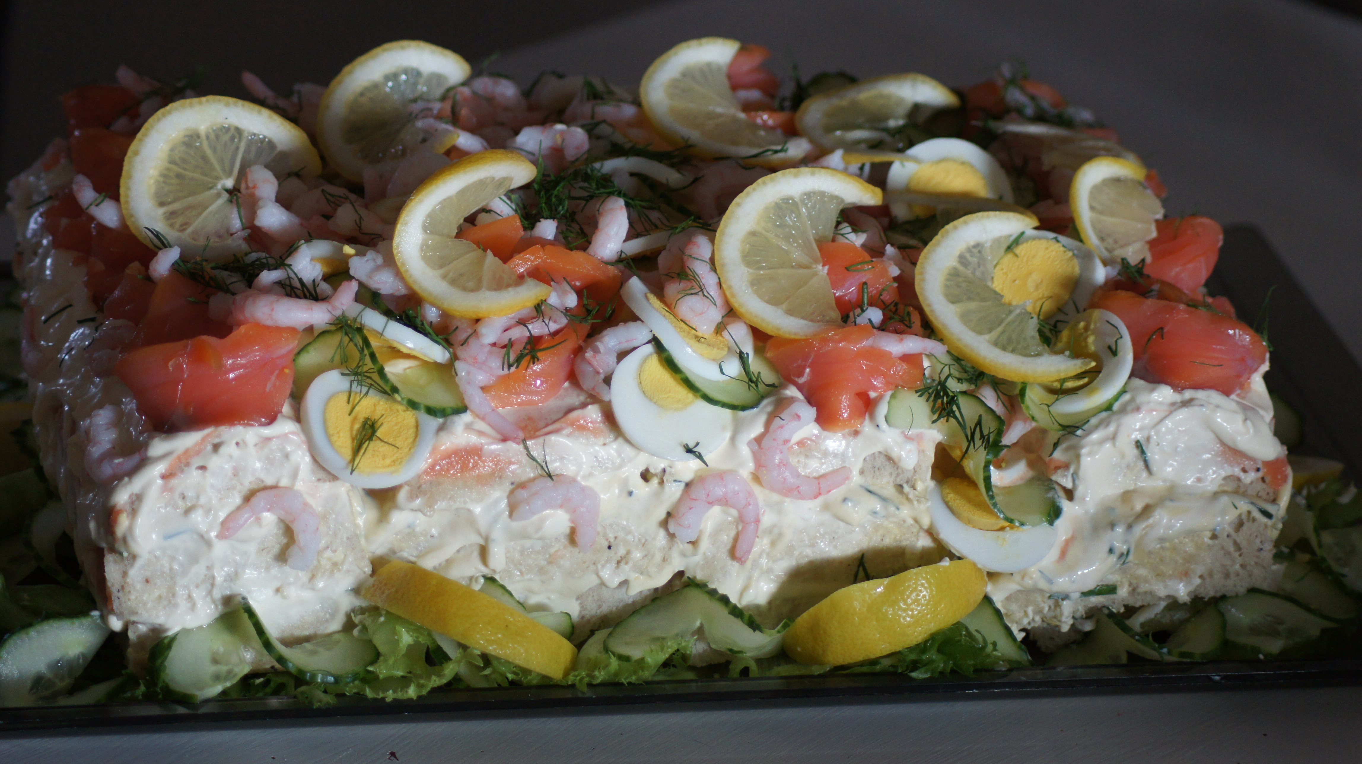 Sett smørbrødterten kjølig over natten slik at den får stå og trekke smaker før servering.