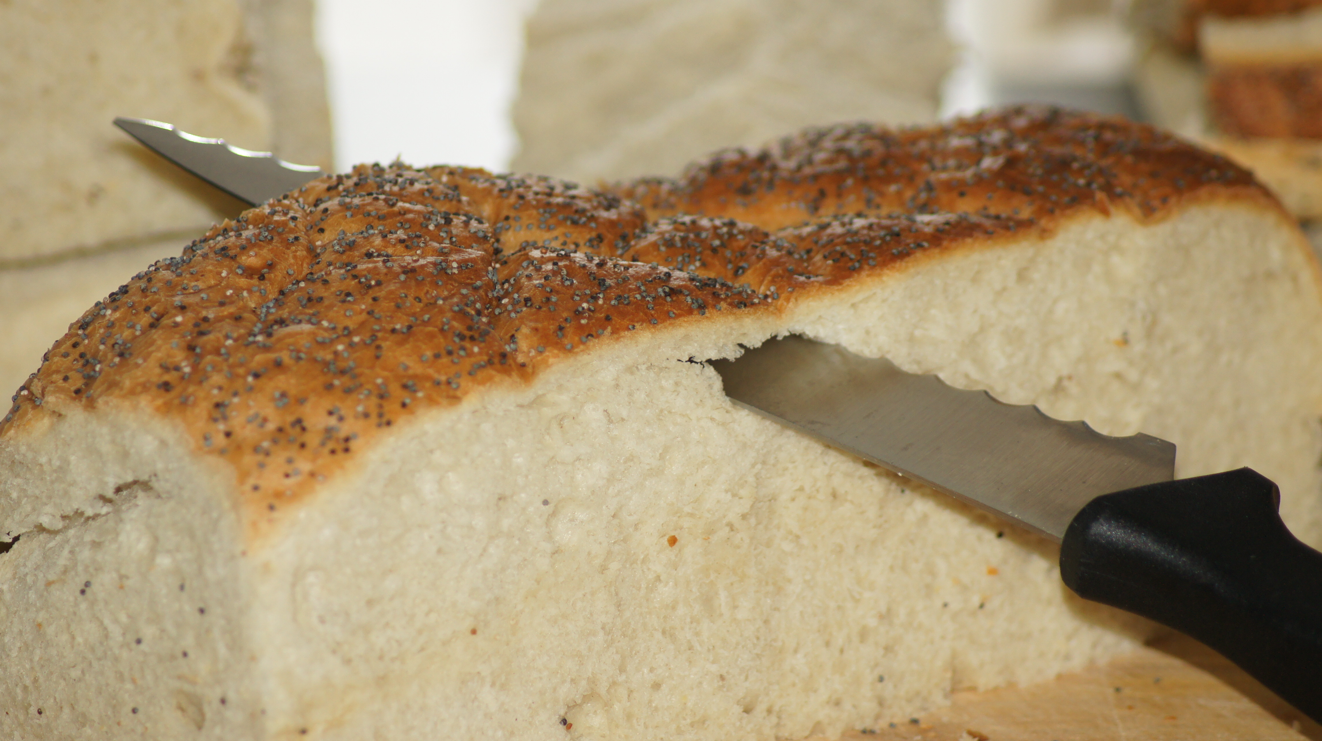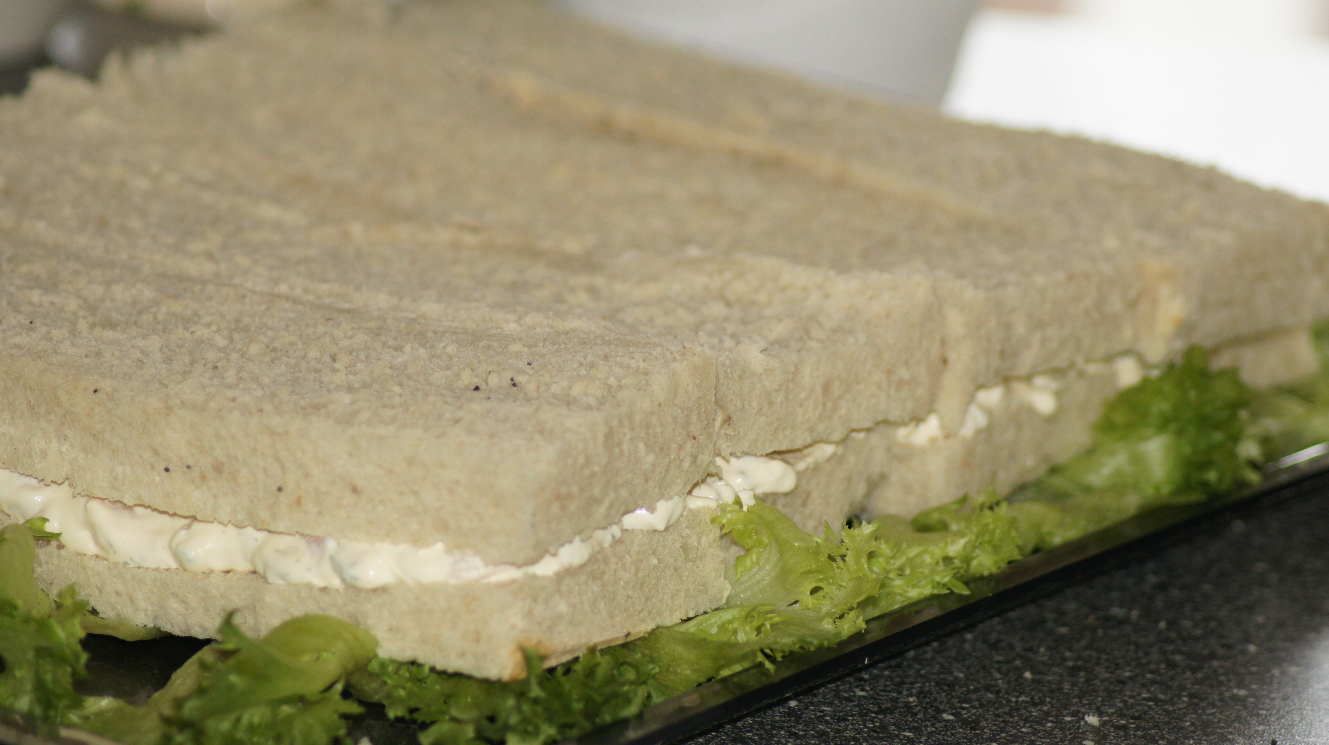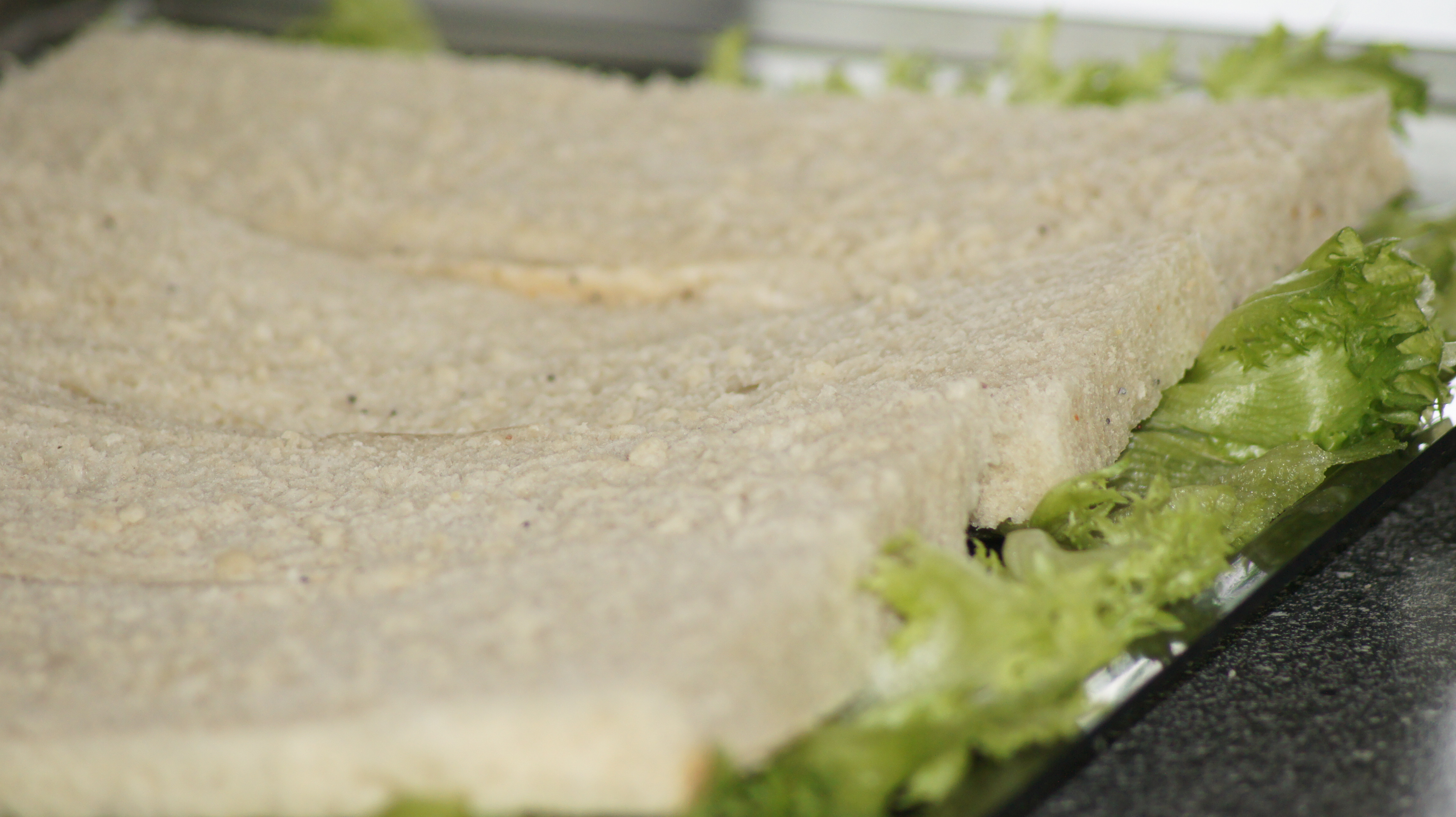 Fremgangsmåte: Skjær sidene, toppen og bunnen av loffene. Del hver loff i tre deler på langs. Legg salatblader langs kanten av serveringsfatet og plasser underdelene av loffene på fatet, side om side.