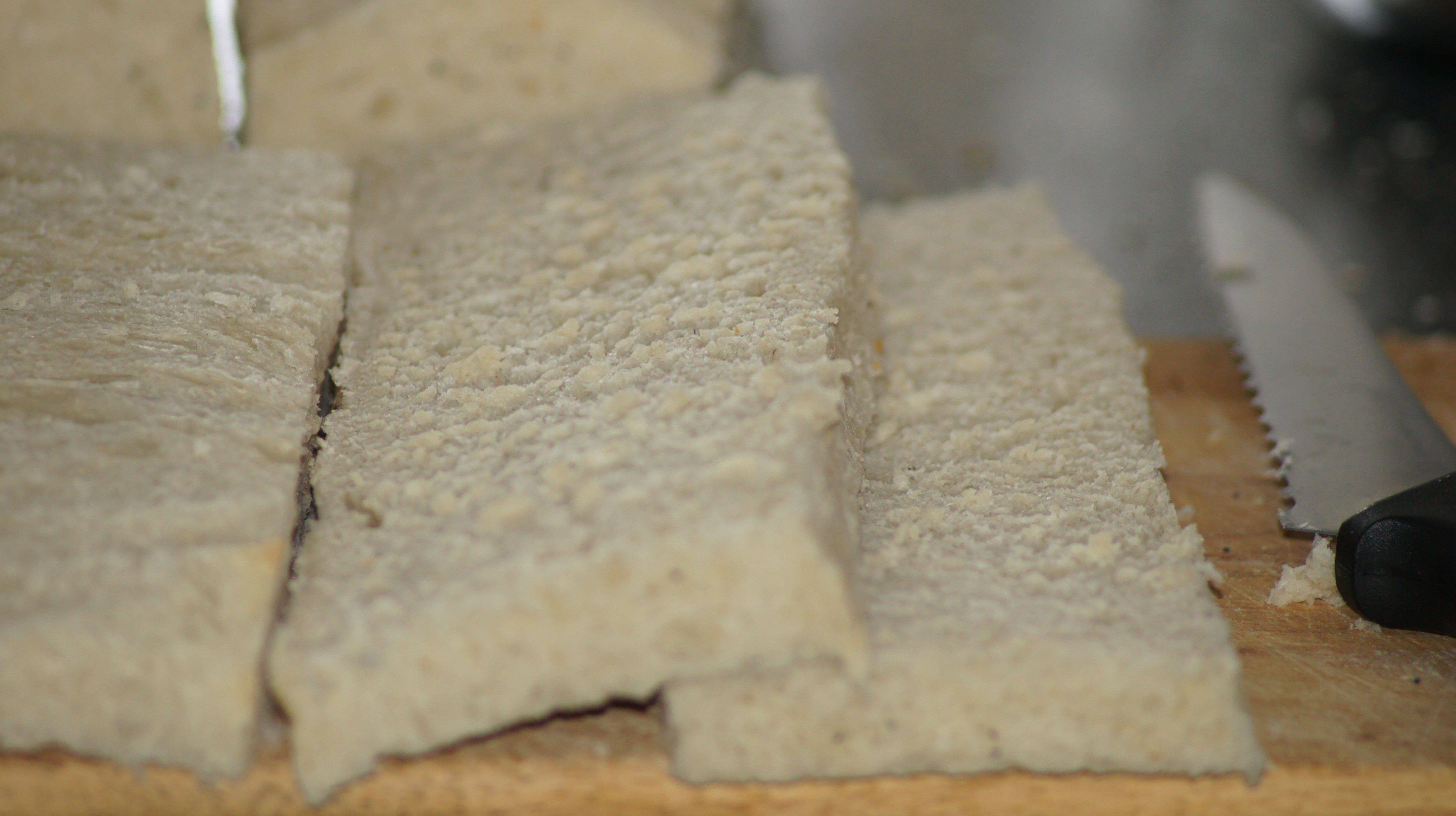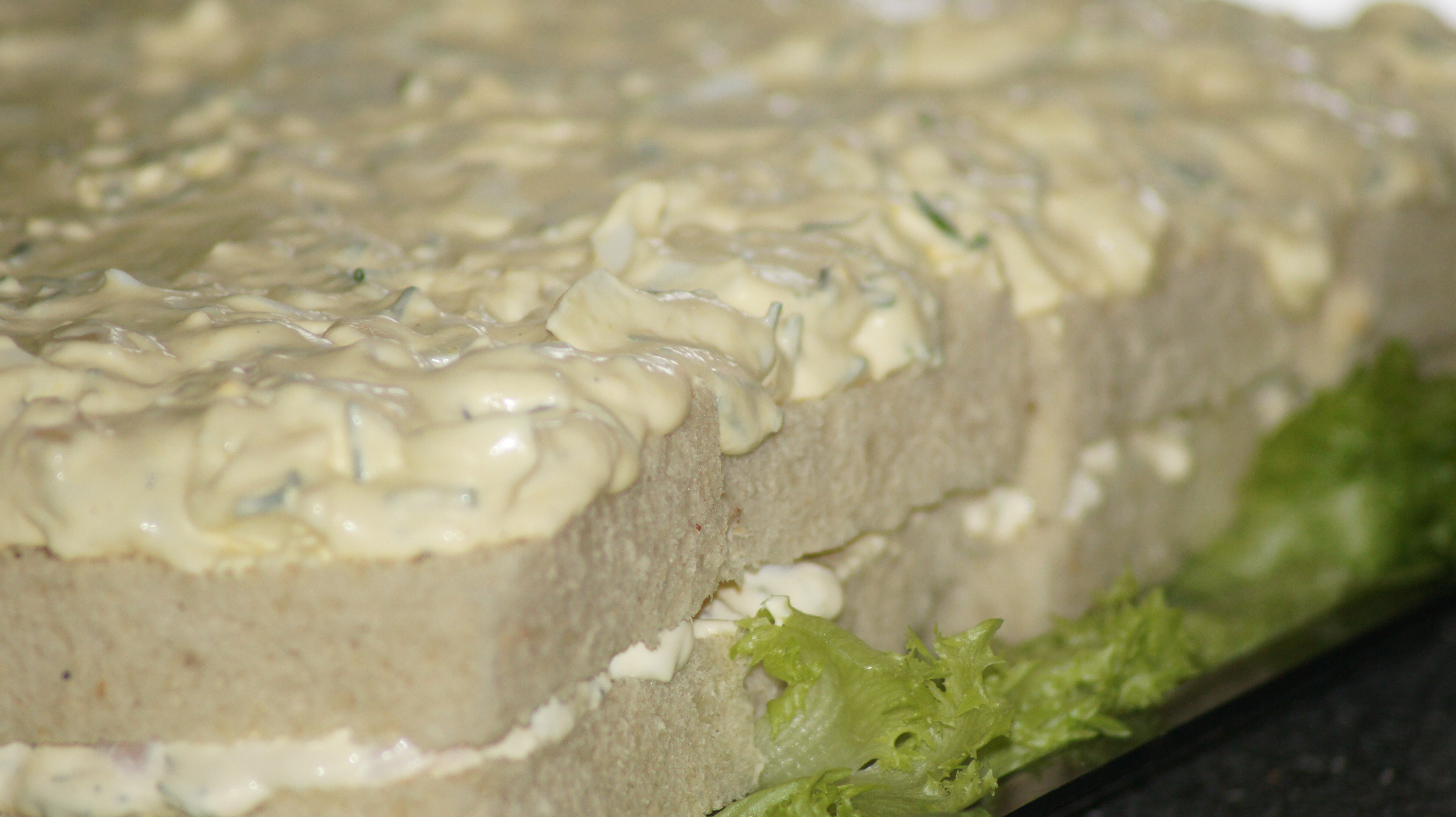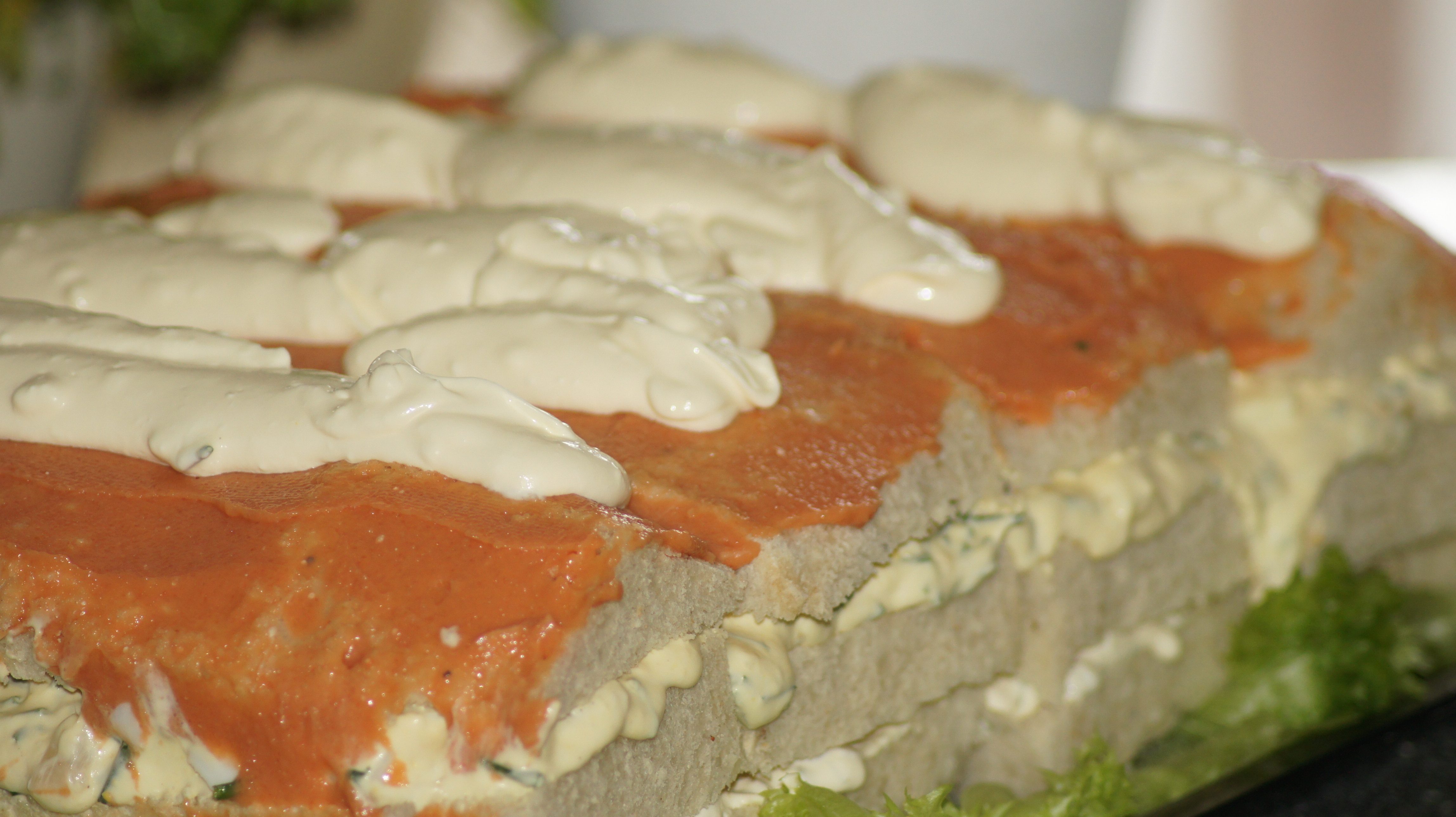 Bland alt godt sammen og smør over lag to med loff. Deretter legges topplaget med loff oppå.