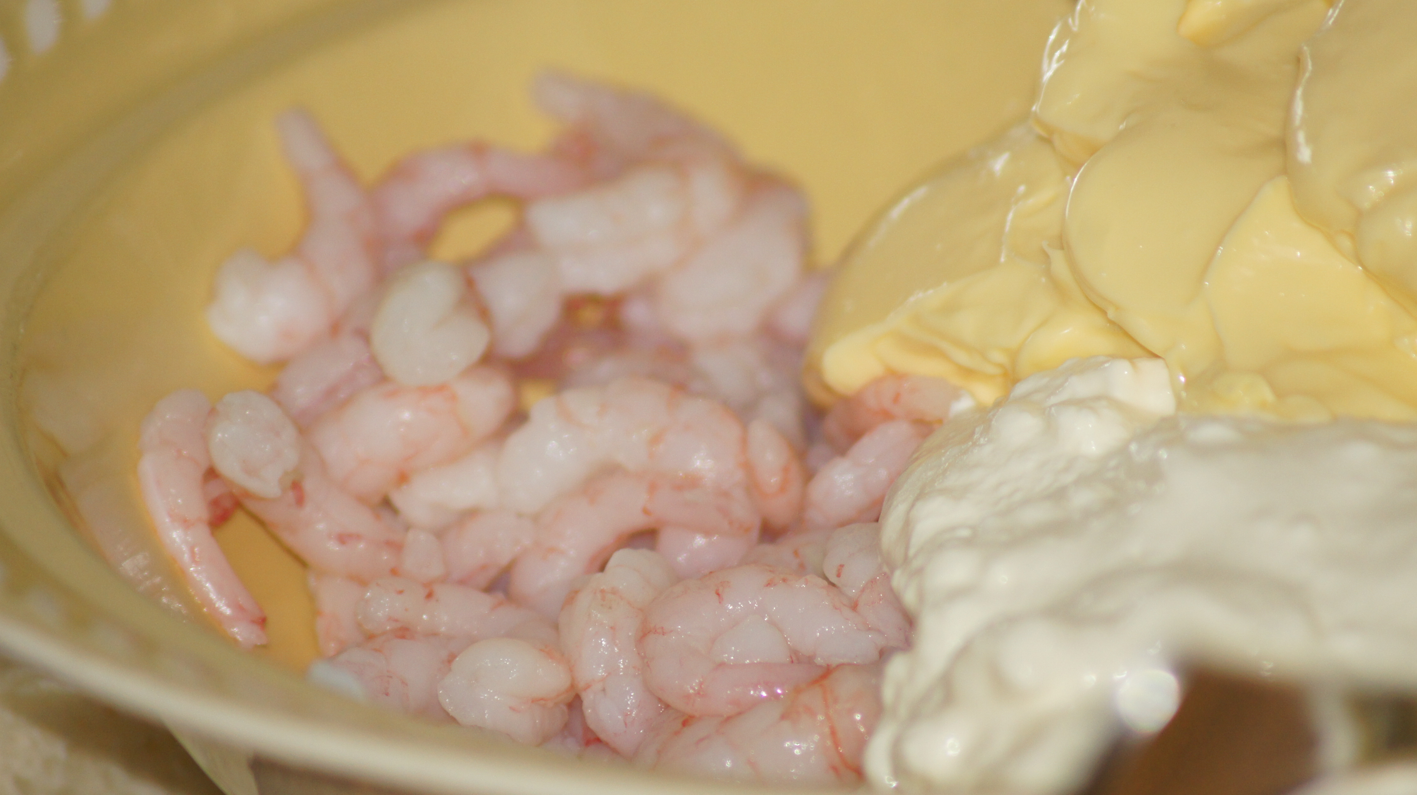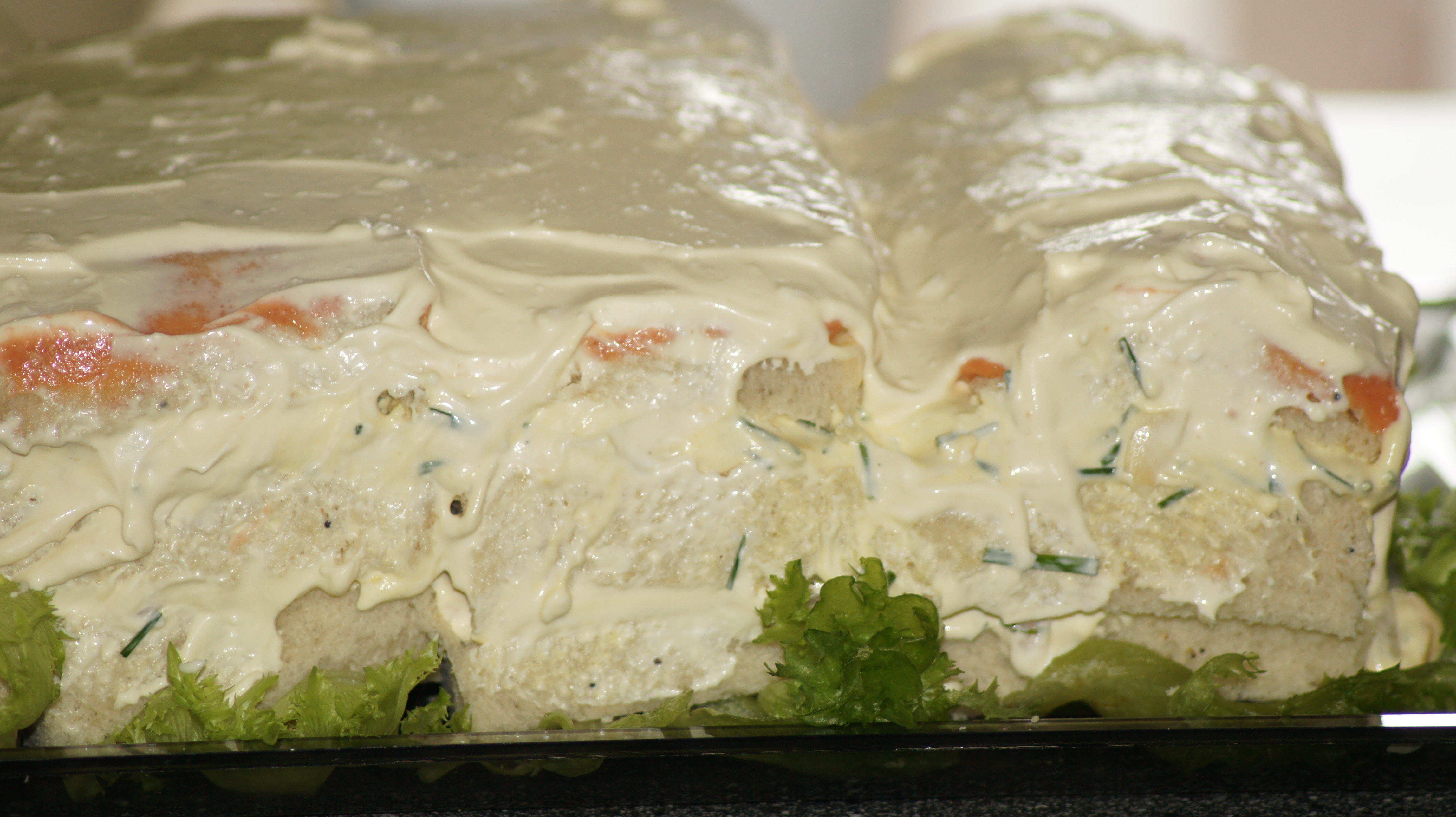 Bland alt godt sammen og smør over underdelene med loff. Dynk med litt sitronsaft før mellomdelene av loffene legges over.