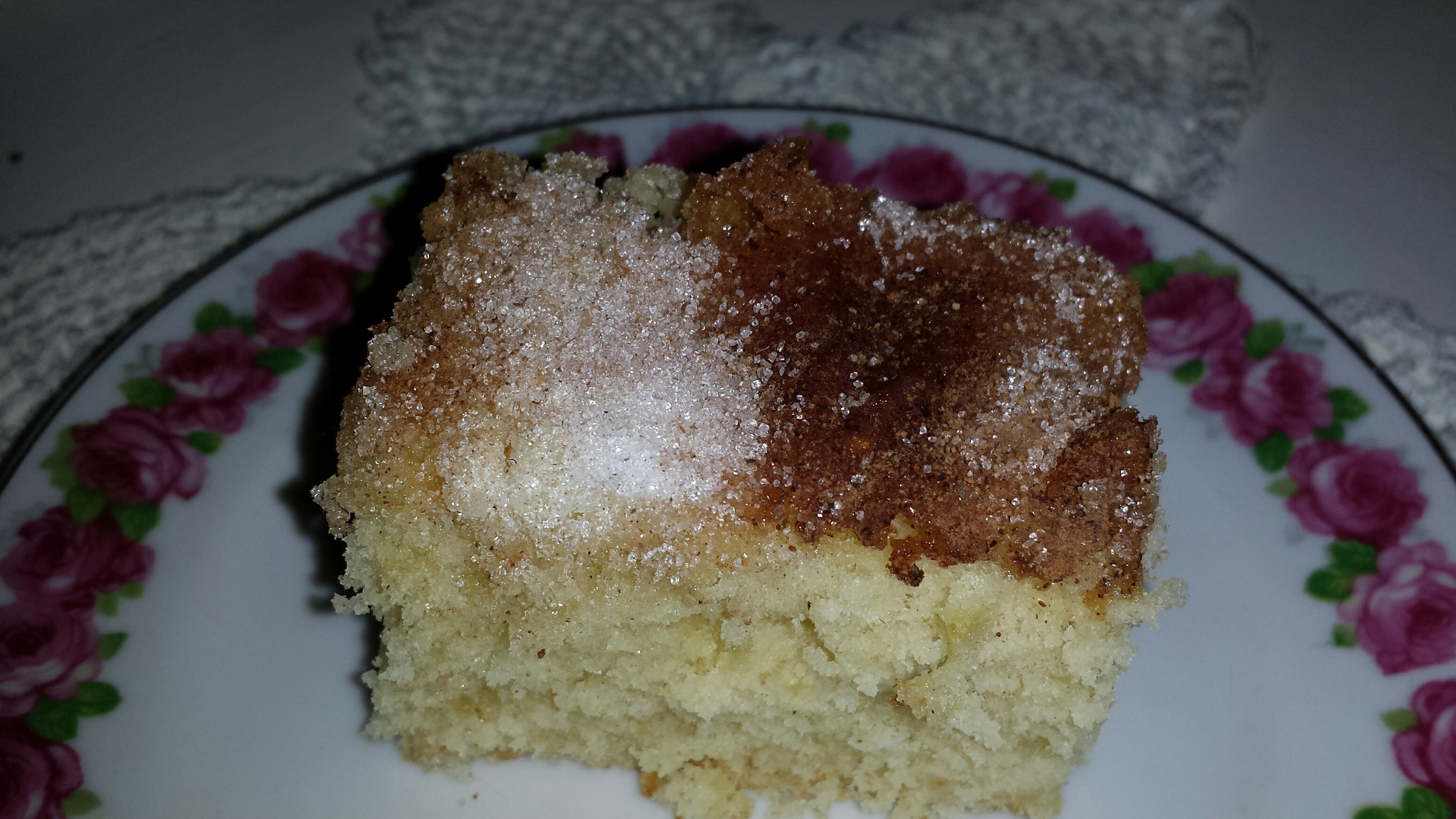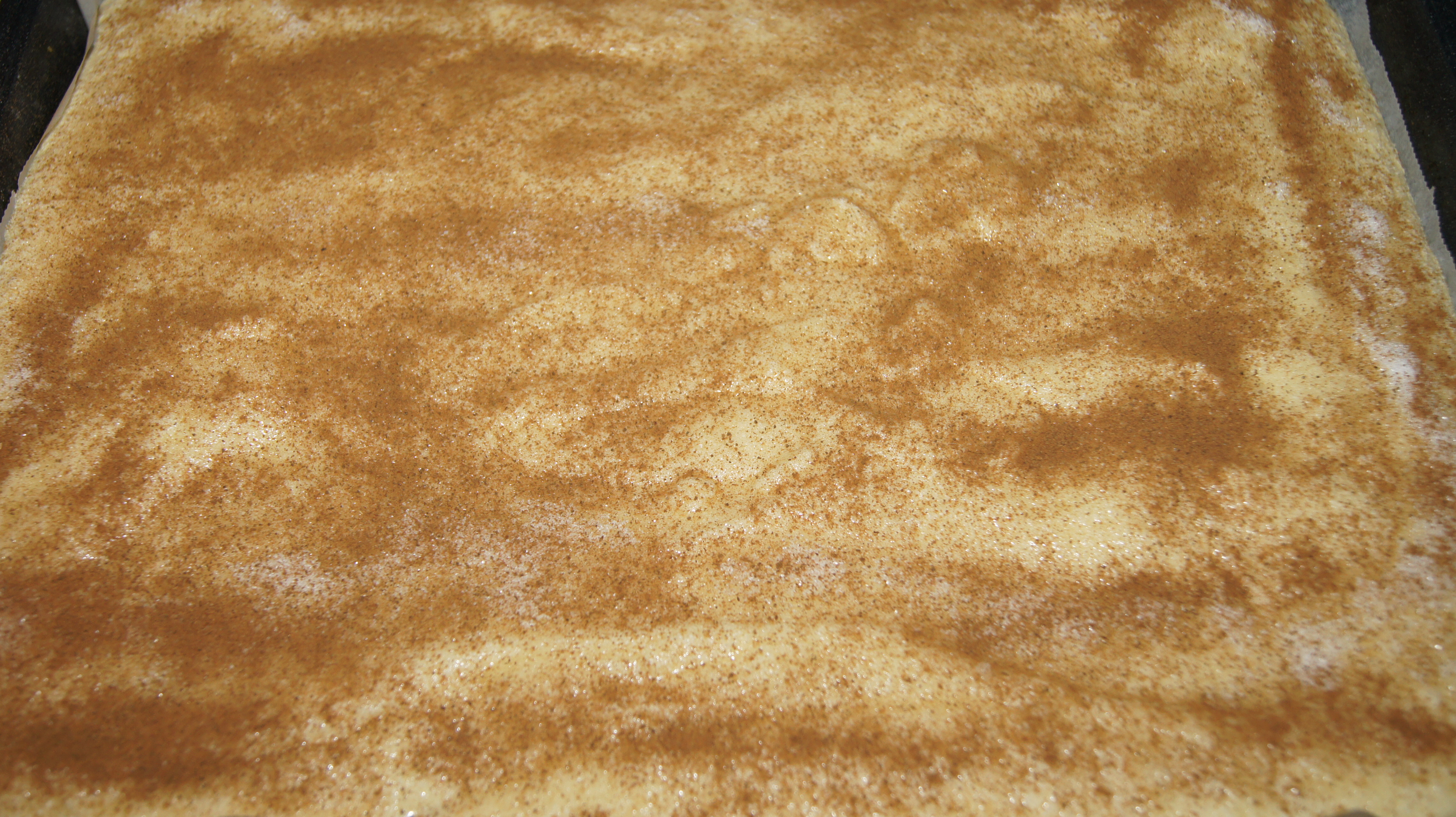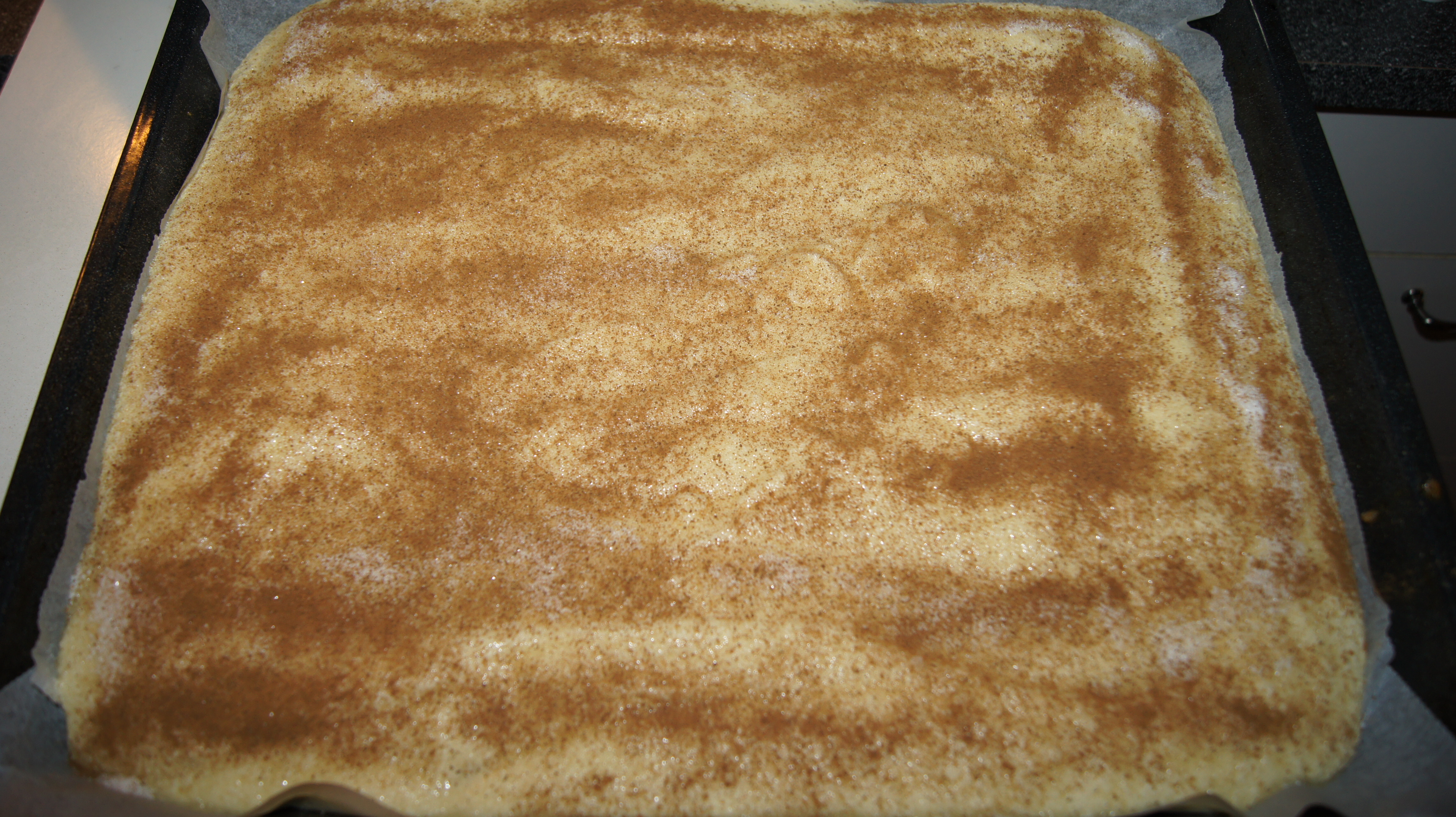 Ha røren i en godt smurt eller bakepapirkledt skuffeform. Strø over med sukker og kanel.
