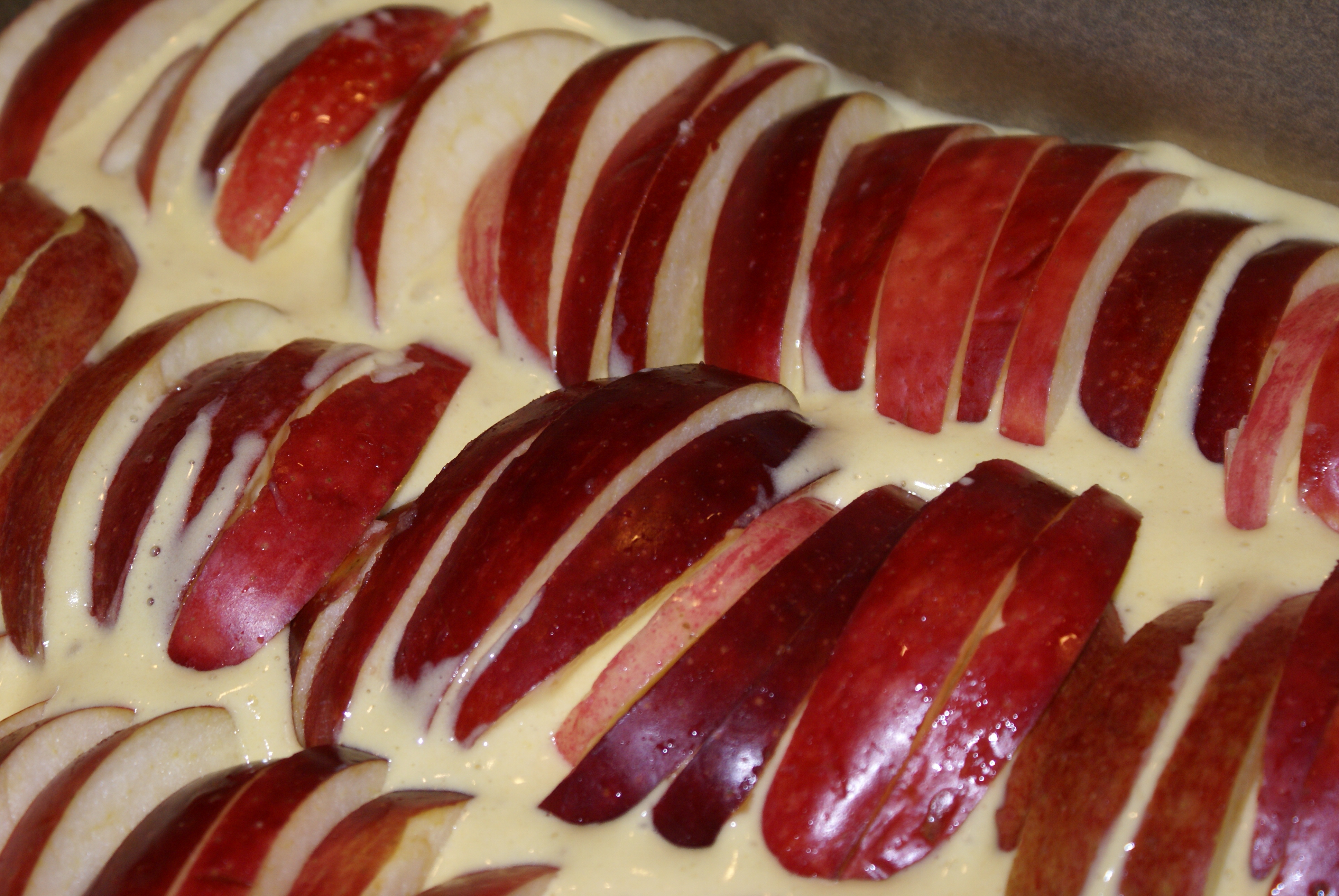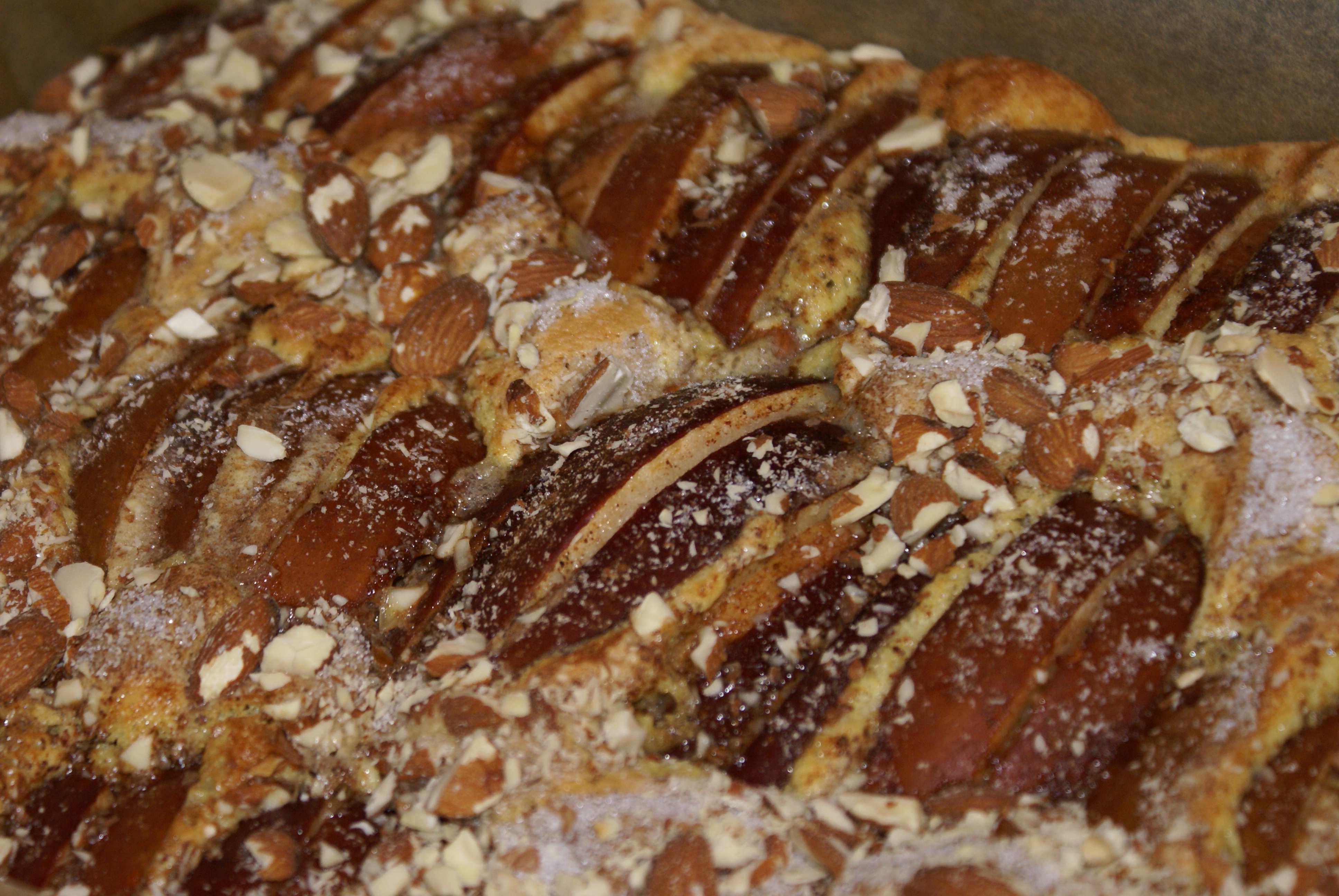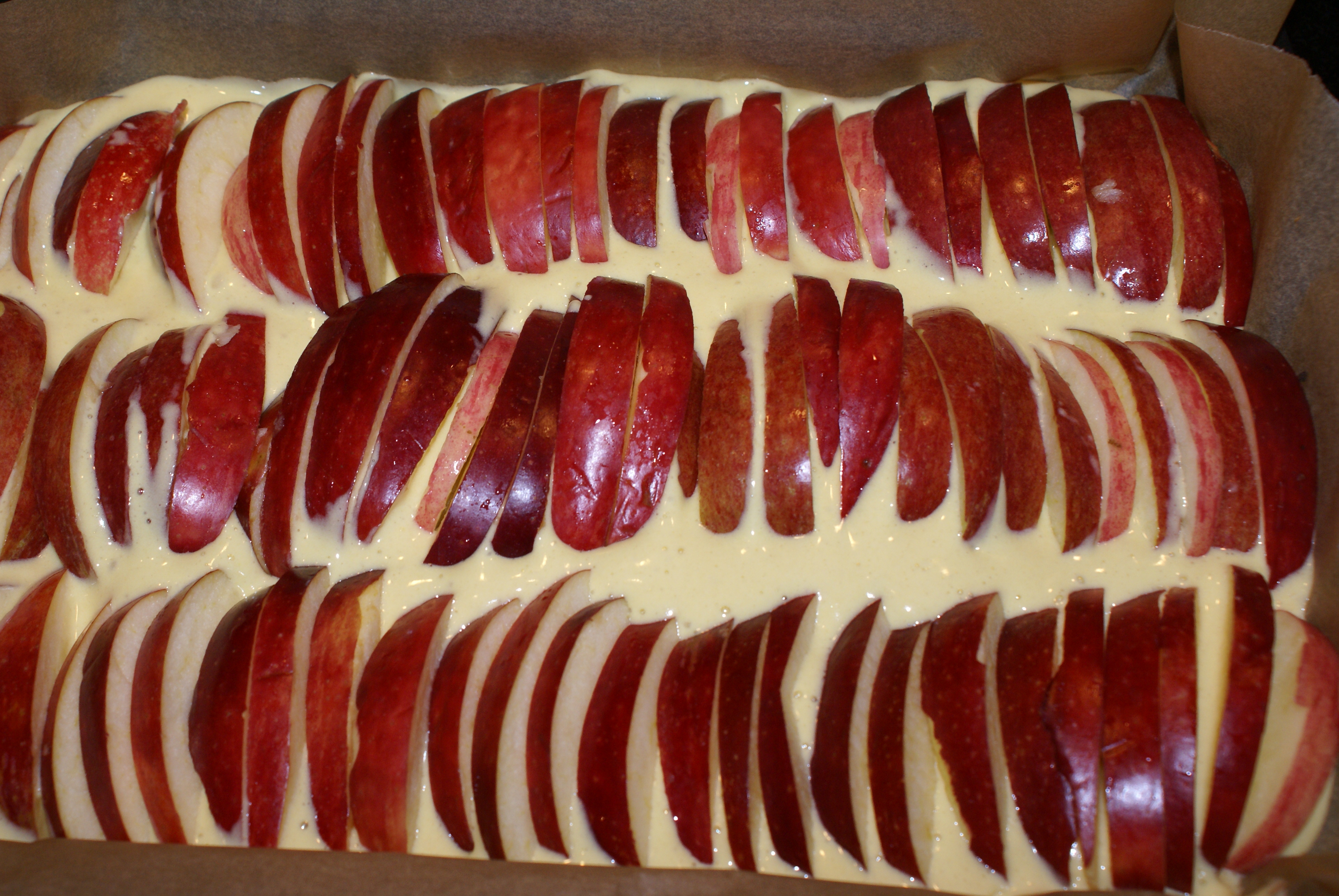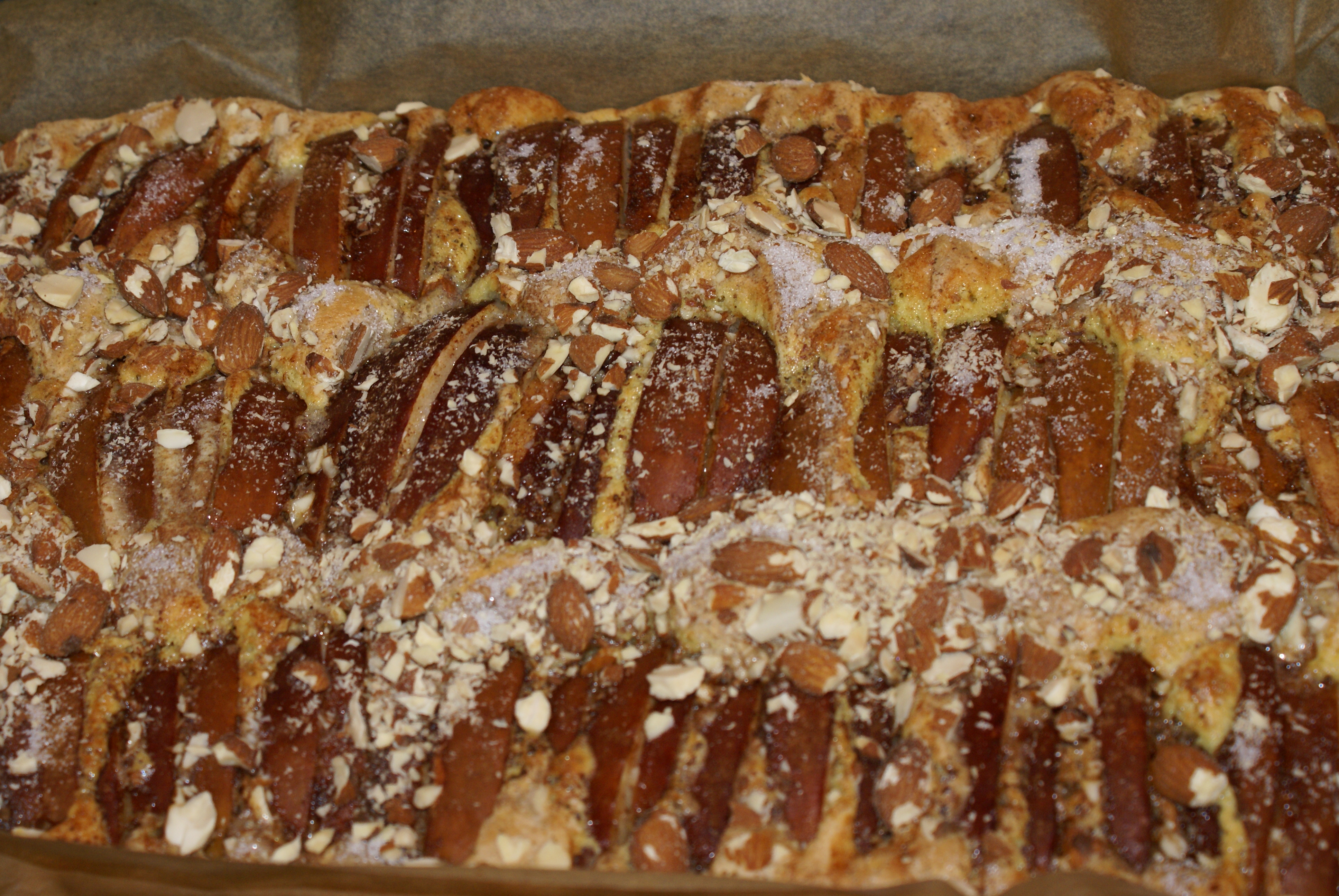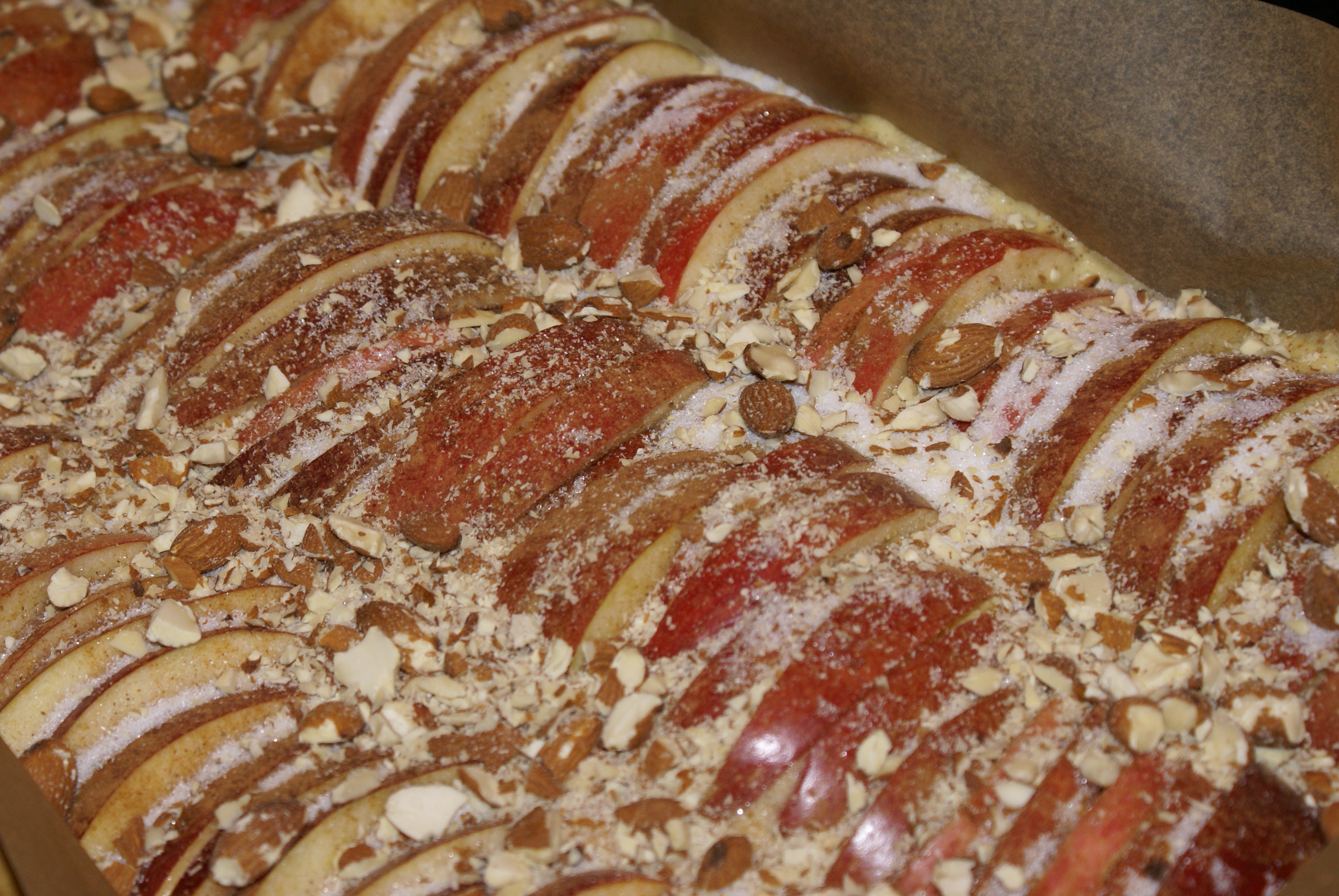 Ha røren i en smurt form og fordel eplene i et fint mønster ved å stikke de ned i røren. Strø sukker og kanel over. Og eventuelt hakkede mandler om man ønsker det.