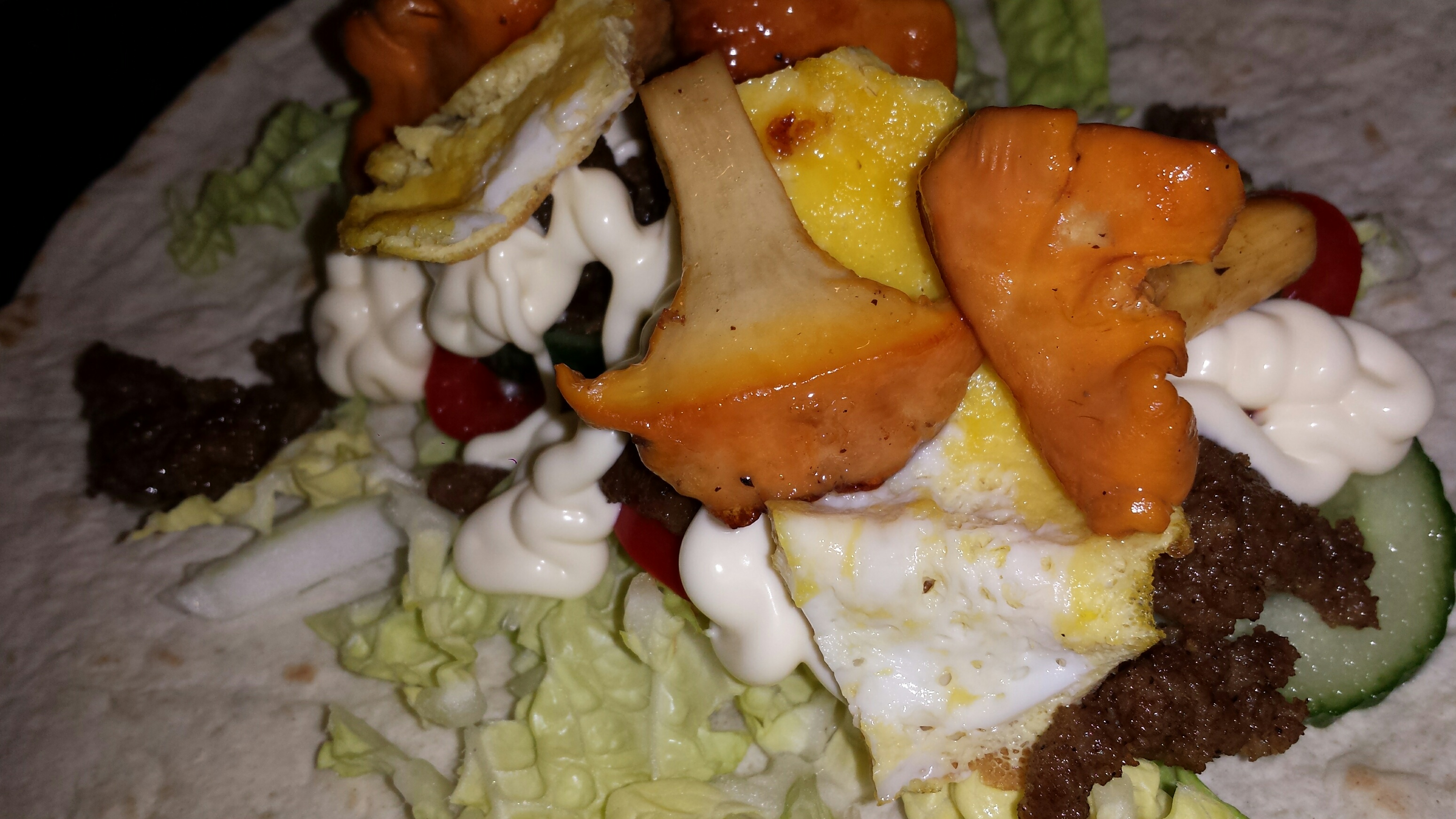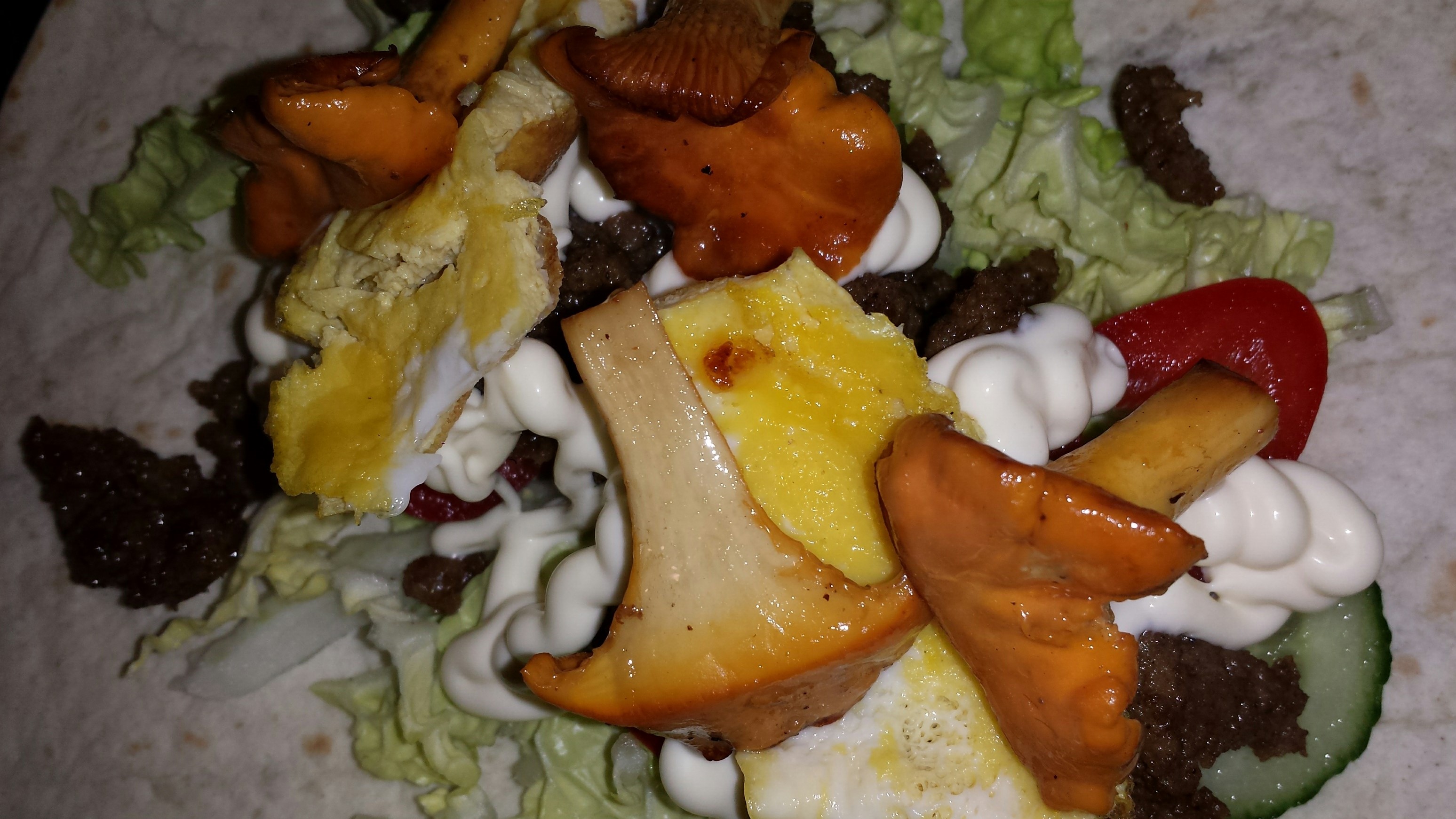 Et herlig og enkelt måltid som kan anbefales er soft tortilla med stekte kantareller, salat, kjøtt og omelett.