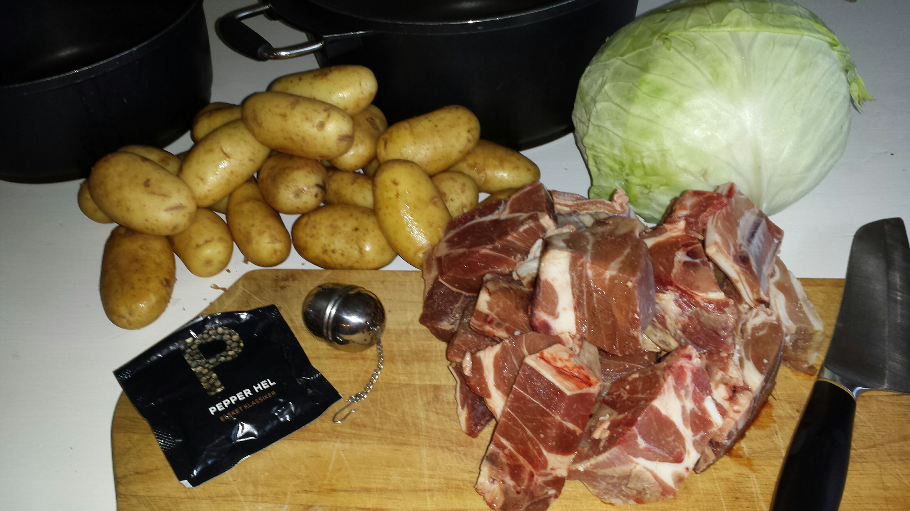 Legg kjøtt og kål skåret i større biter lagvis i gryta. Ha salt og pepper mellom lagene. Dersom man ikke liker å ha helpepper mellom lagene kan man ha pepperen i egen beholder.