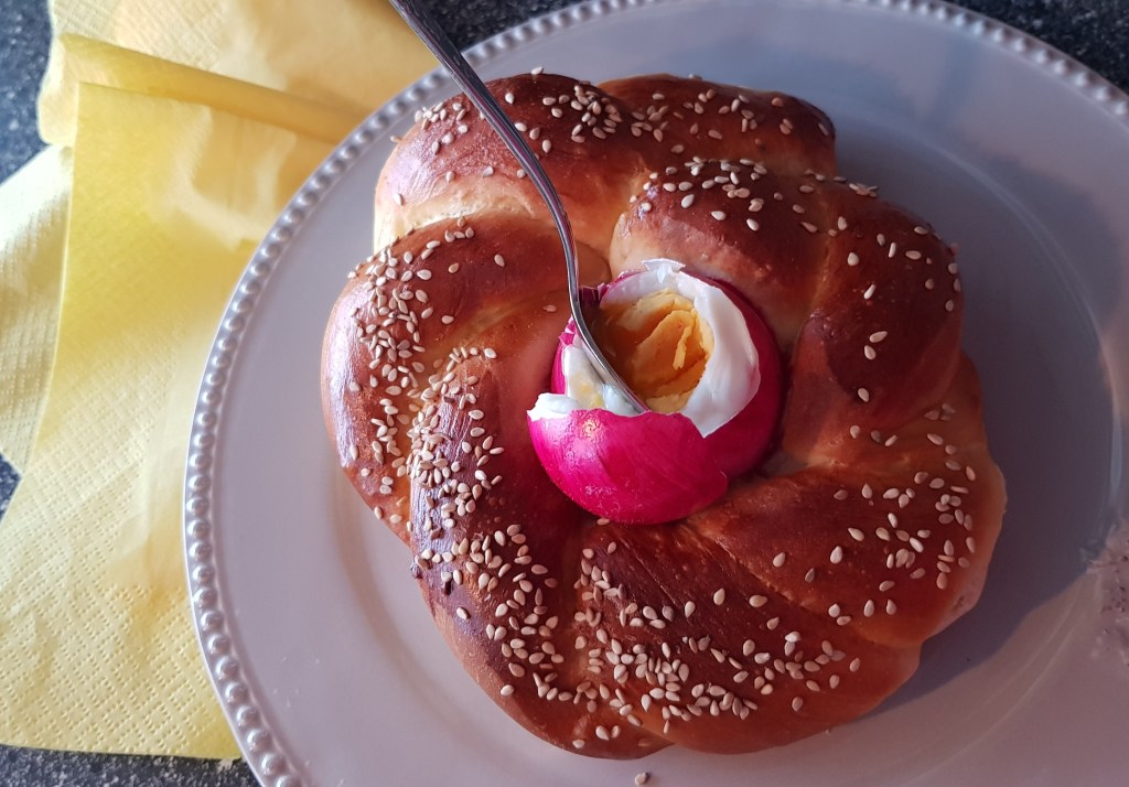 Når deigen er ferdig hevet deles den i 12 emner, som hver deles i to. Trill ut til lengder som snurres sammen og festes i sirkel. Sett egget i midten og plasser på bakepapirkledt steikebrett. Heves til dobbel størrelse, ca. 30 minutter.