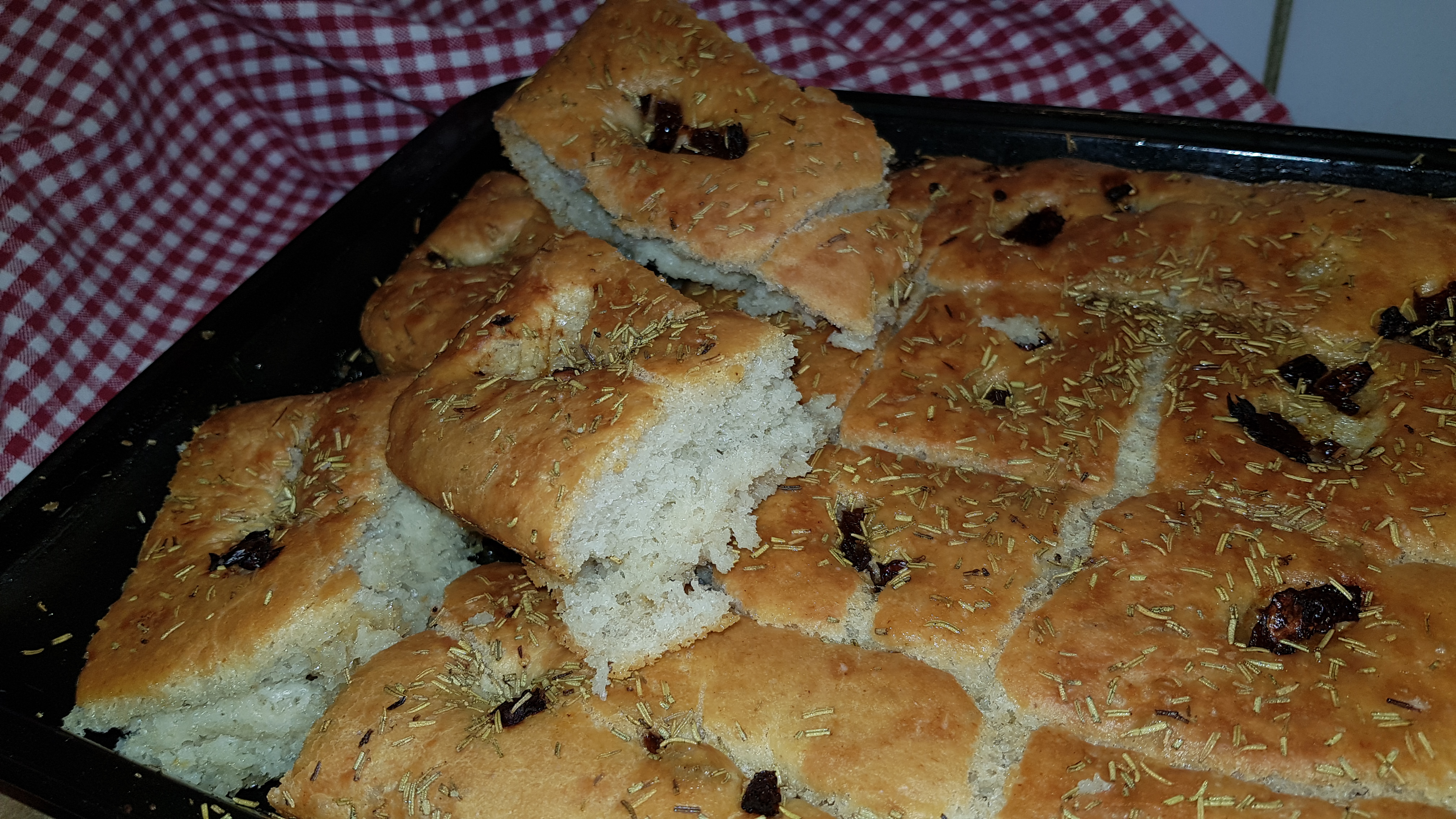 Legg bakepapir i en liten skuffeform, og ha olivenolje i bunnen. Hell deigen i forma. Ha godt med olivenolje over. Bruk en bakespade, eller lignende, og skjær deigen til passende firkanter. Dytt oliven og tørket tomat i hver firkant, og dryss over rosmarin og maldonsalt etter smak.