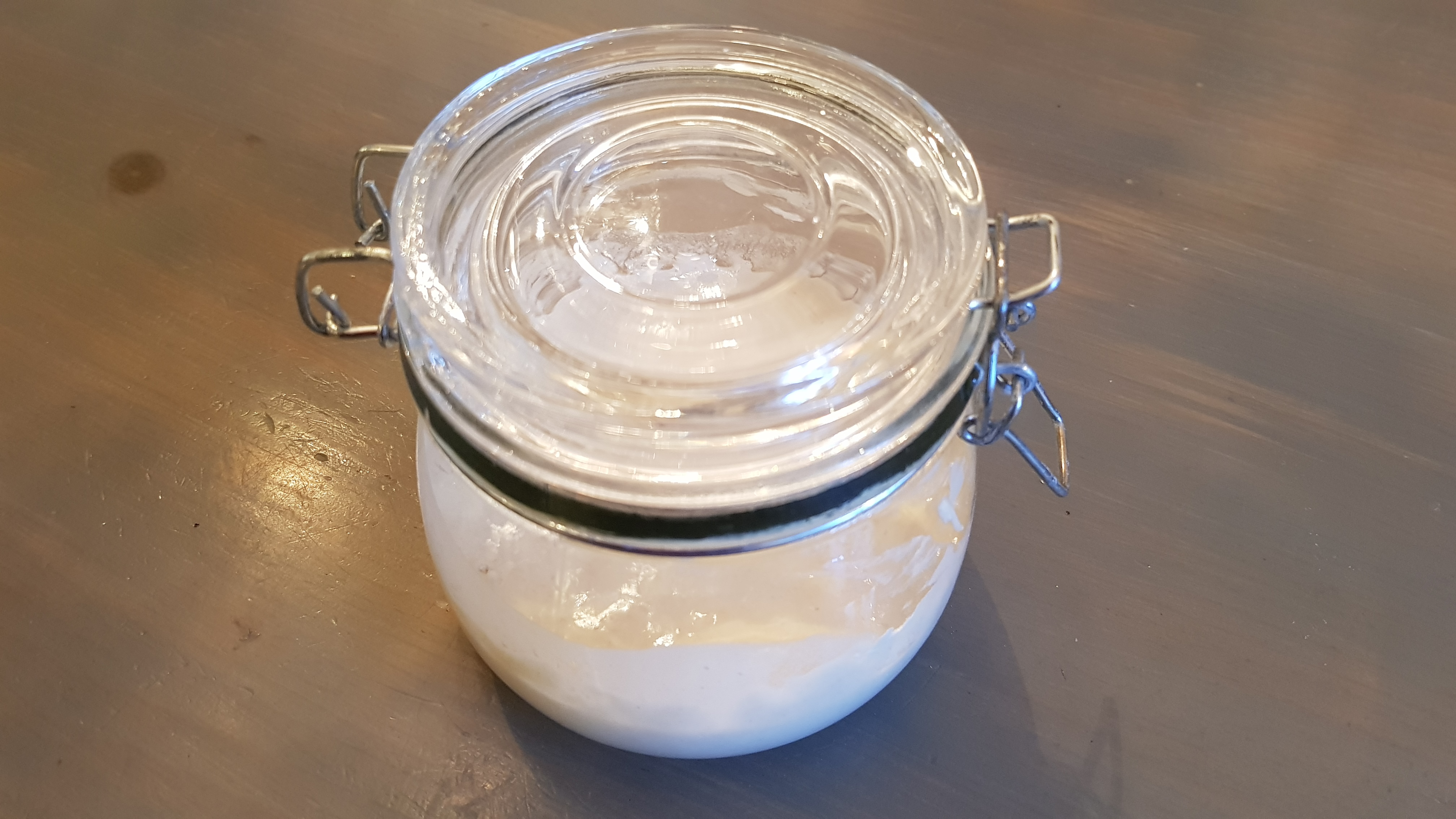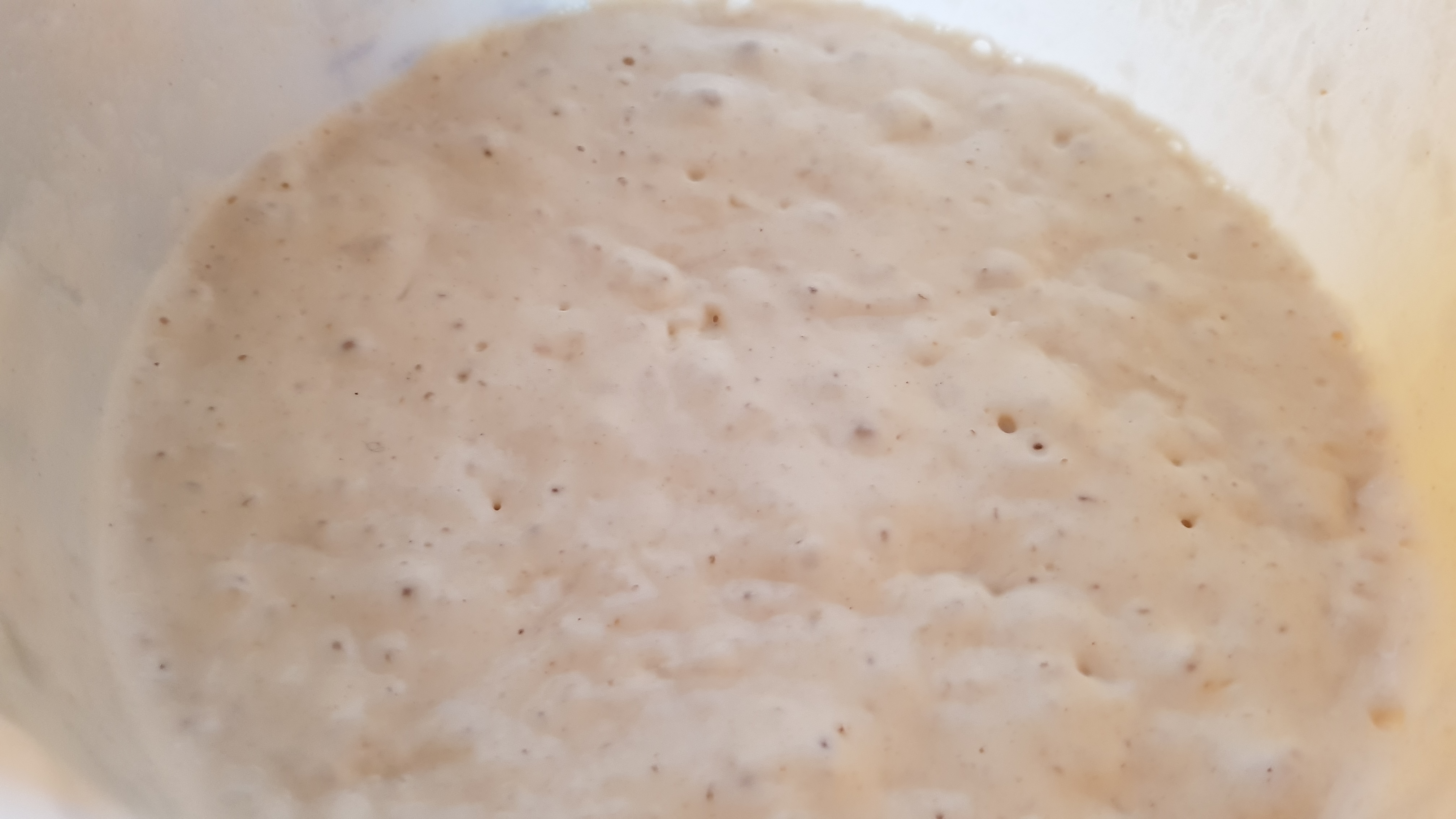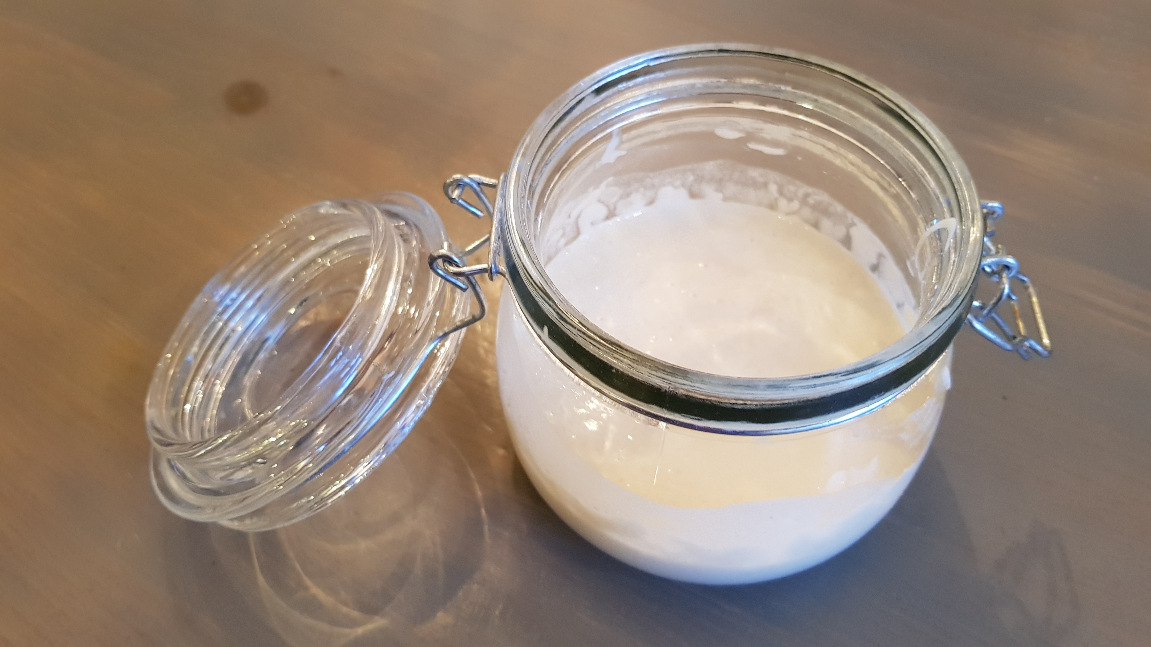Dag 1: Bruk 50 ml rosinvann, og rør sammen med 50 g mel. (Jeg bruker surdeigsmel, spelt, eller tipo). Ha blandingen i et glass, og sett på lokk, uten å skru det til. Det skal komme litt luft til deigen. (Jeg bruker glass med gummipakning, men tar vekk pakningen rundt lokket, da kommer det luft inn).