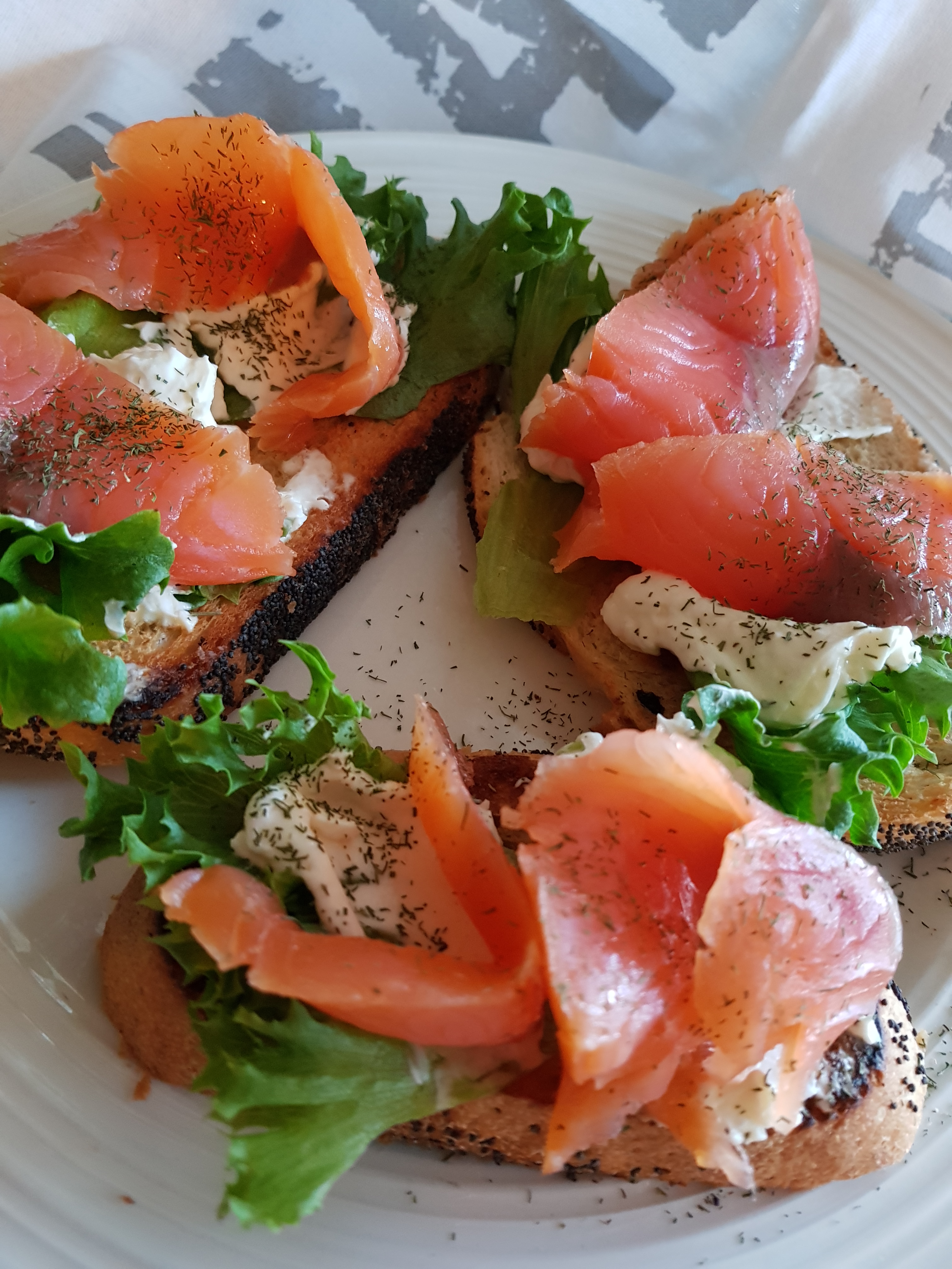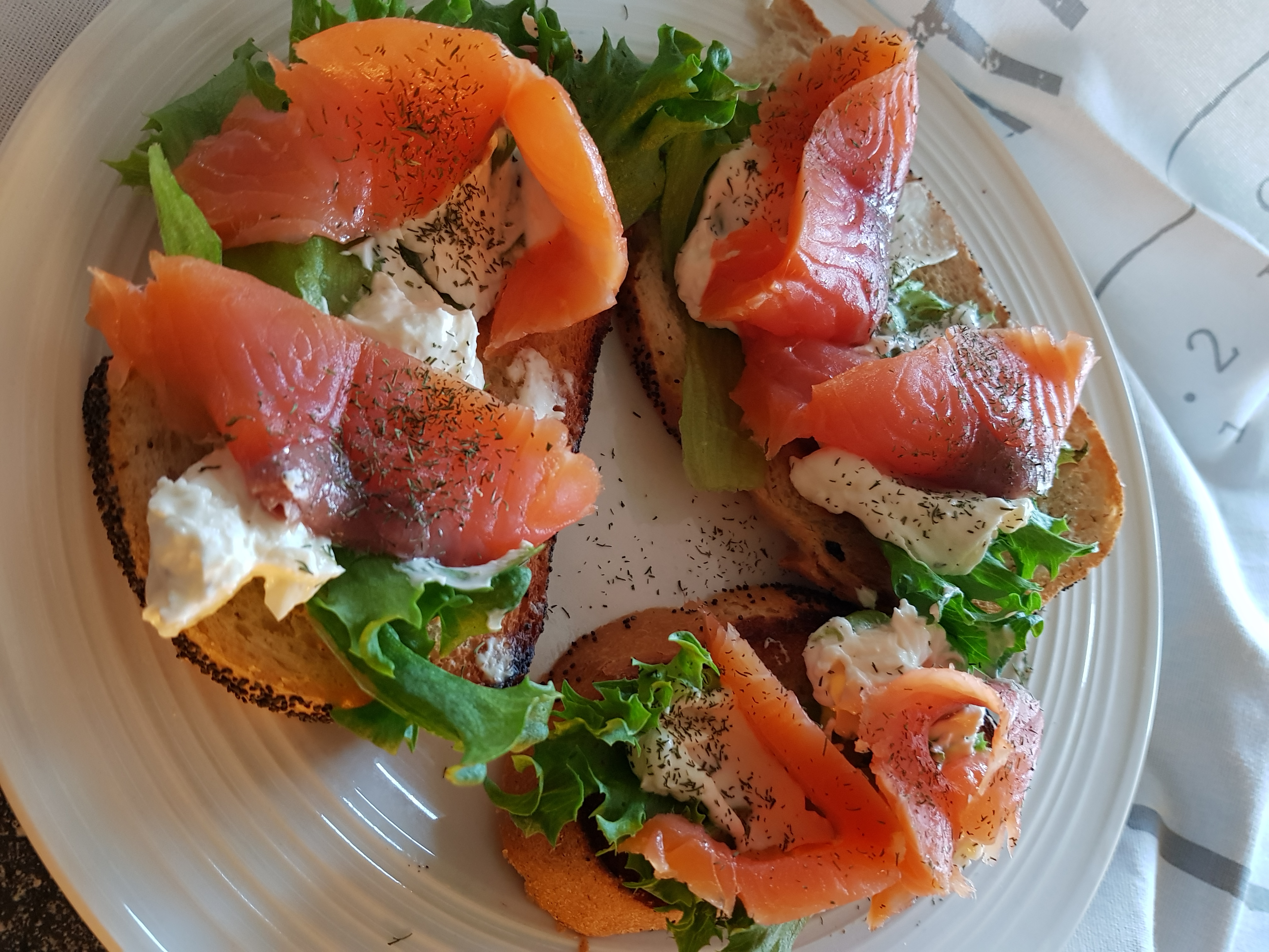 Rist skiver av brød i en varm stekepanne og ha litt olivenolje over. Legg på et salatblad og en spiseskje med pepperrotkrem på skiva, og deretter et par skiver røykt laks oppå. Pynt med dill.