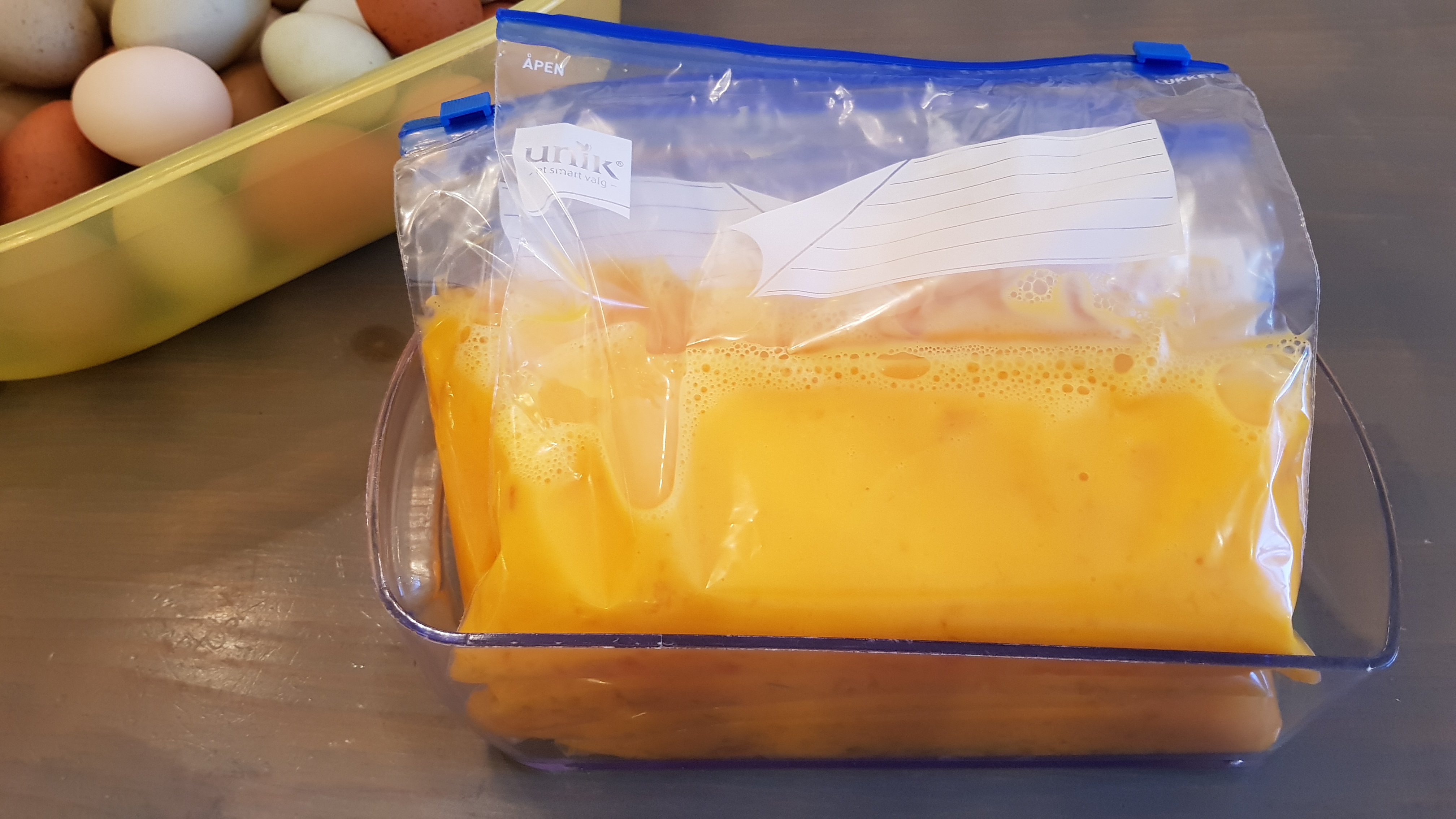 Ha to, eller flere egg i en skål og rør de lett sammen uten å piske de. Tøm de sammenrørte eggene over i en pose, og legg i fryseren.
