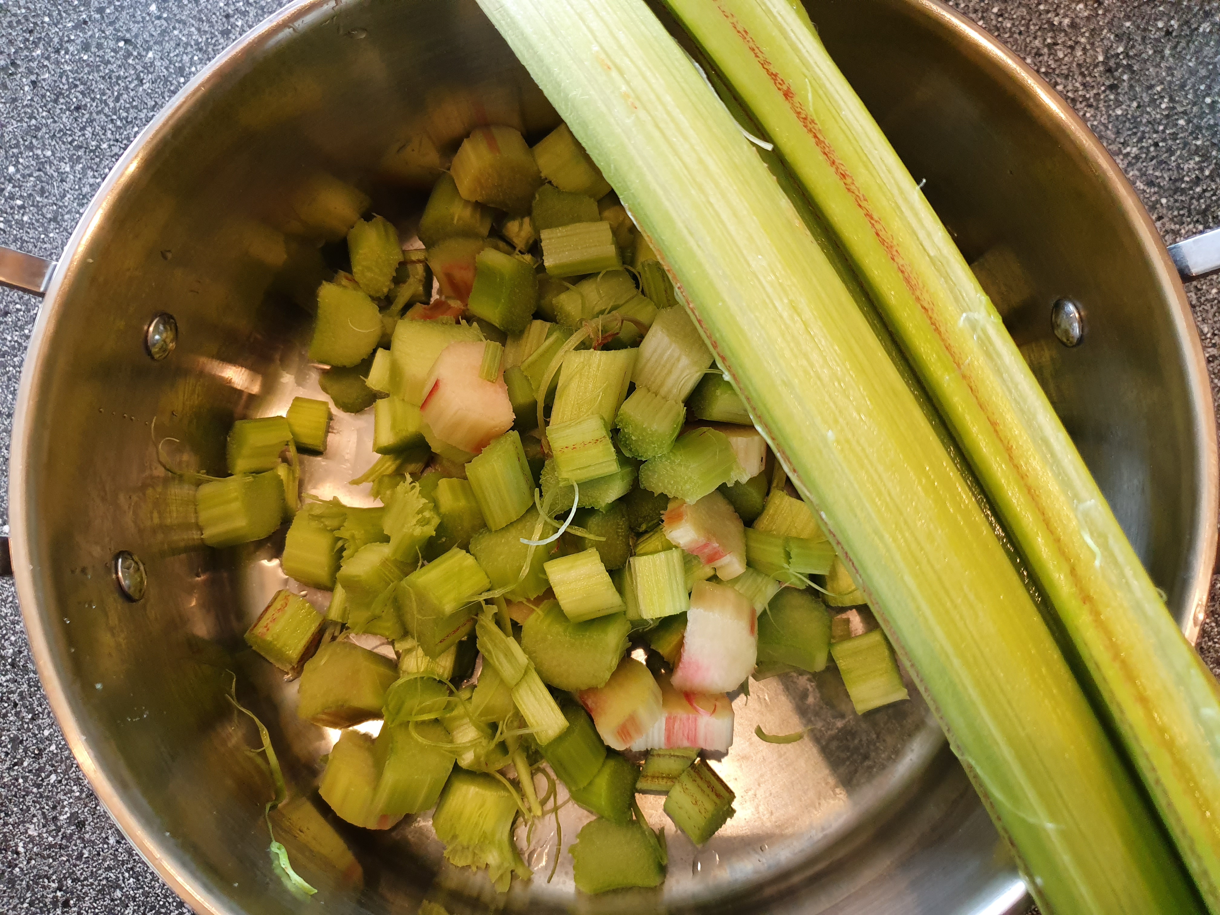 Rens og skyll rabarbra. Del den opp i mindre biter, og ha i en kjele.