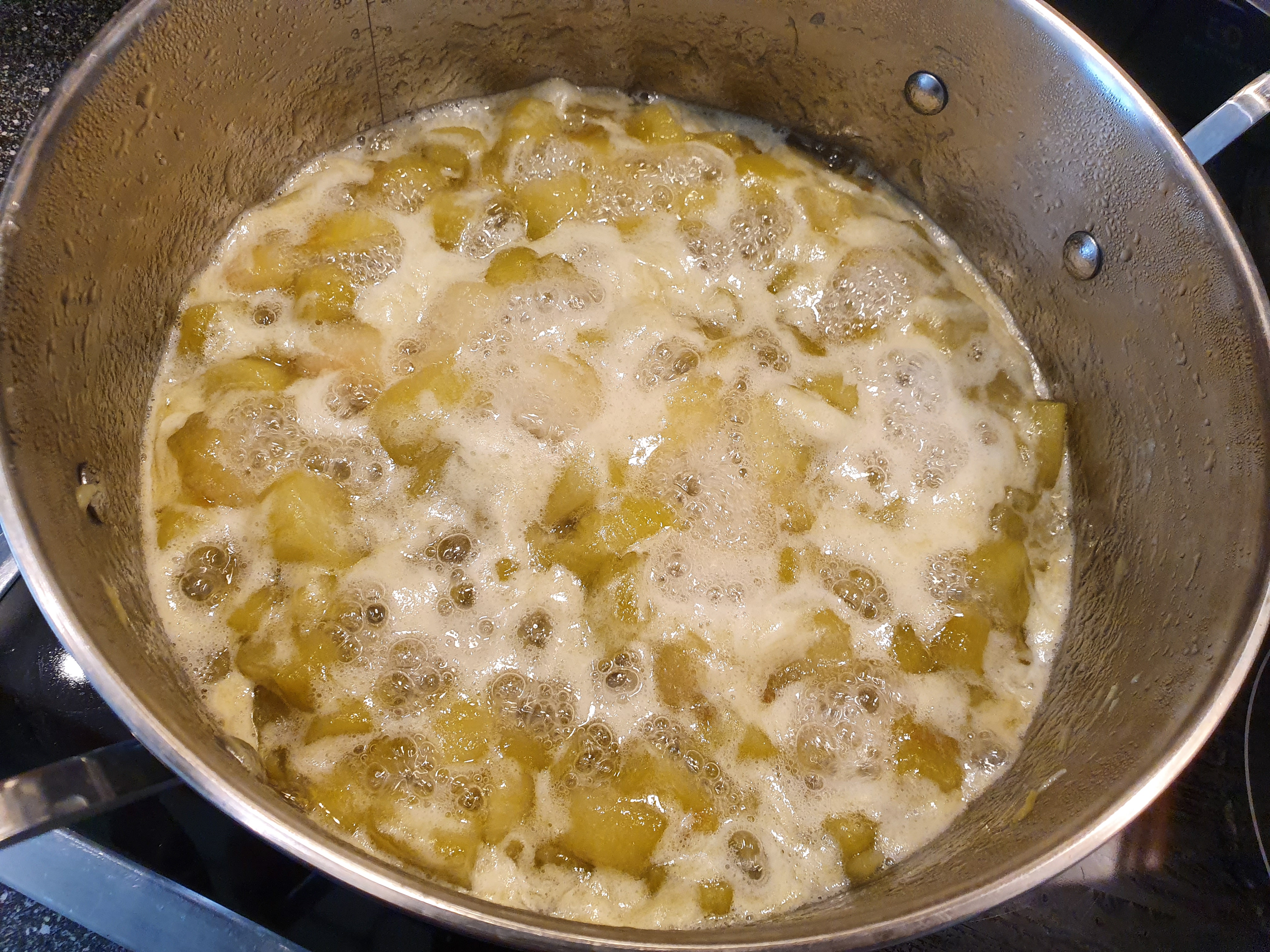 Kok på svak varme i ca. 10 minutter. Tilsett sukker, rør godt sammen og la koke videre ca. 10 minutter dersom man ønsker et lyst syltetøy. Foretrekker man den mer brune varianten (mormors syltetøy) kokes syltetøyet videre til det har fått en lys karamellfarge.