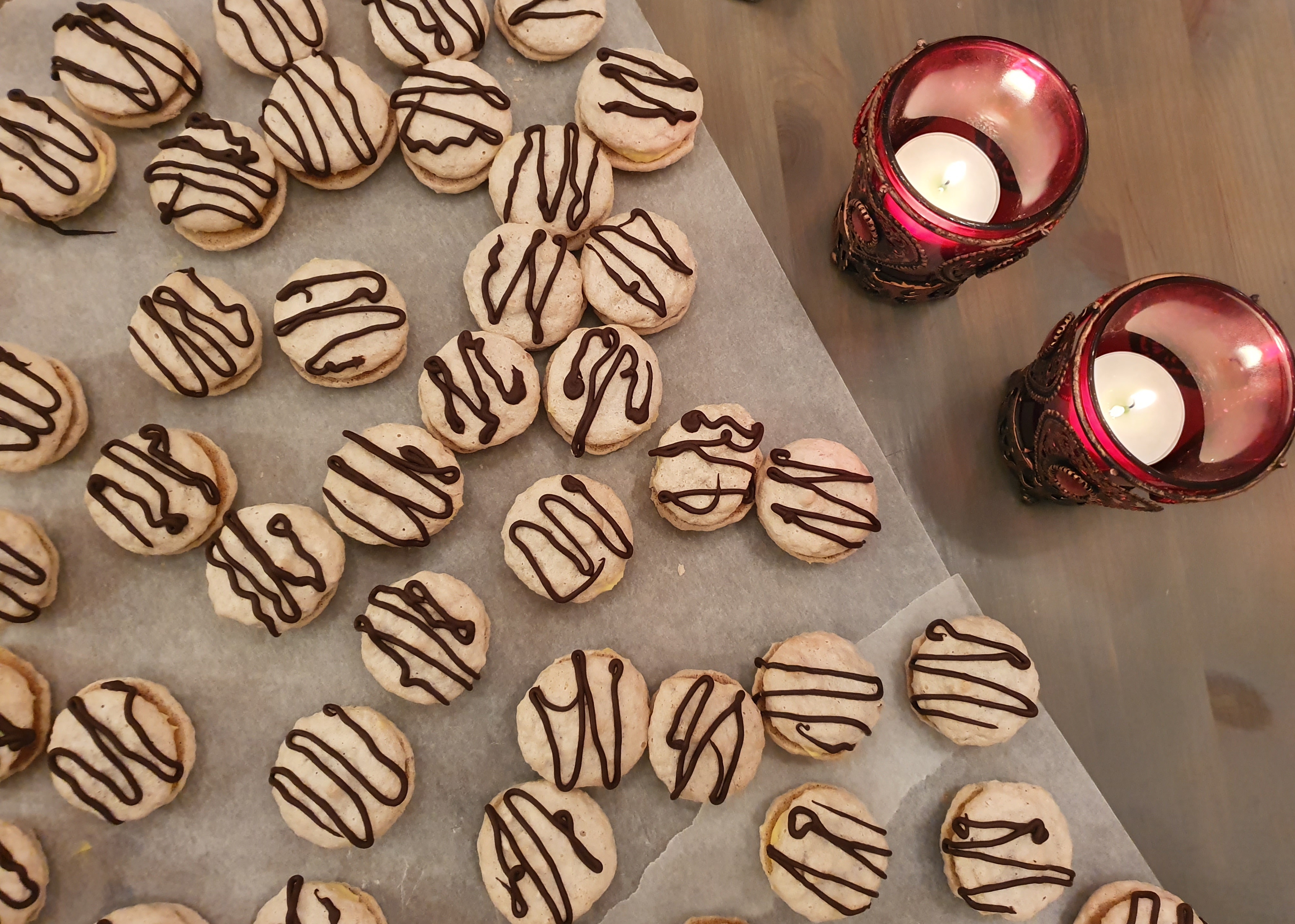 Avkjøl kjeksene og sprøyt deretter fyll på halvparten av kjeksene. Legg de andre halvdelene over. Smelt kokesjokolade i vannbad, og ha over kjeksene som pynt.