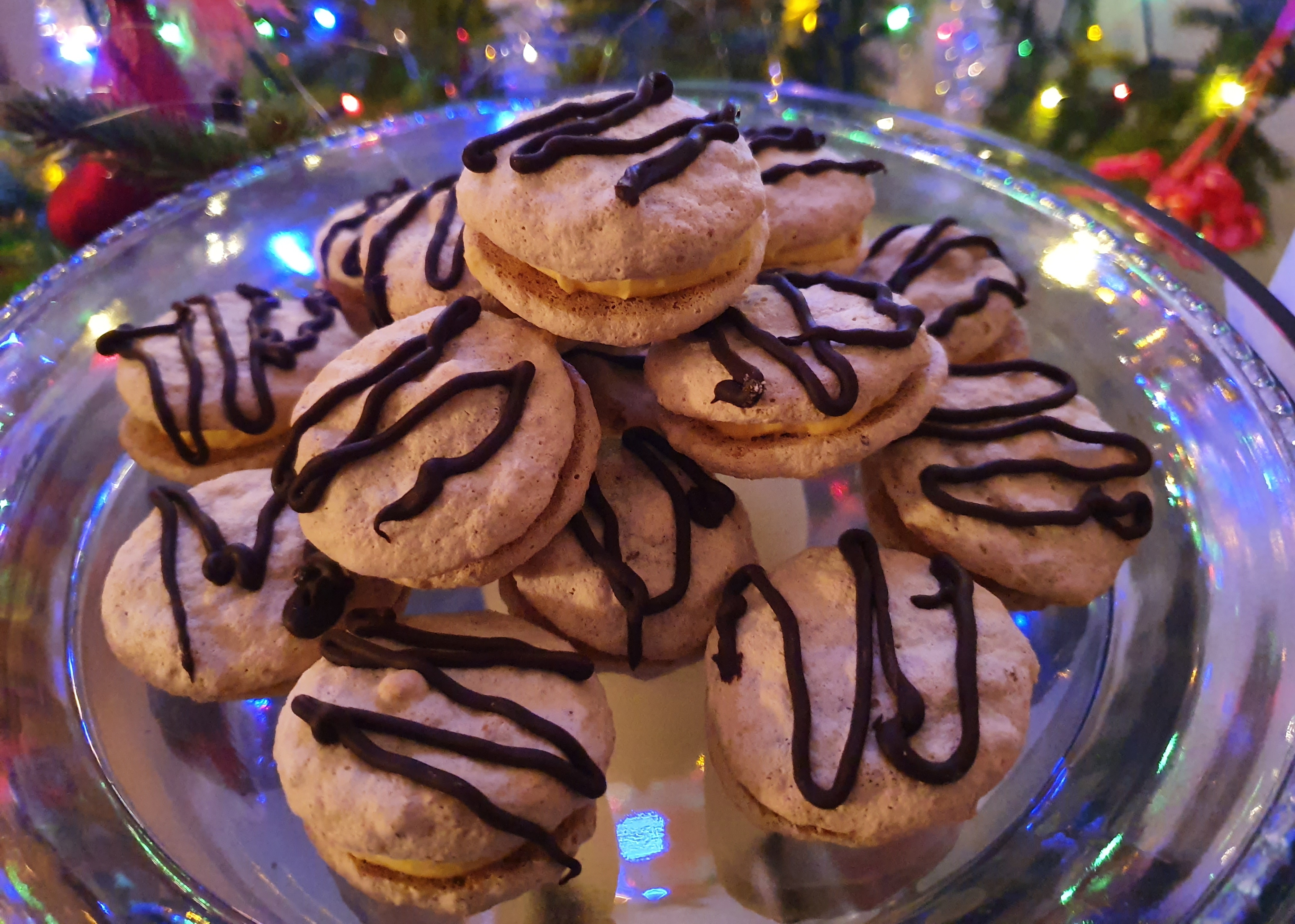 Visp eggehviter til de begynner å skumme, ha deretter i litt sukker av gangen. Visp til stiv eggedosis. Vend inn de malte mandlene. Ha massen over i en sprøytepose. Sprøyt ut små runde kjeks på bakepapirkledt steikebrett.