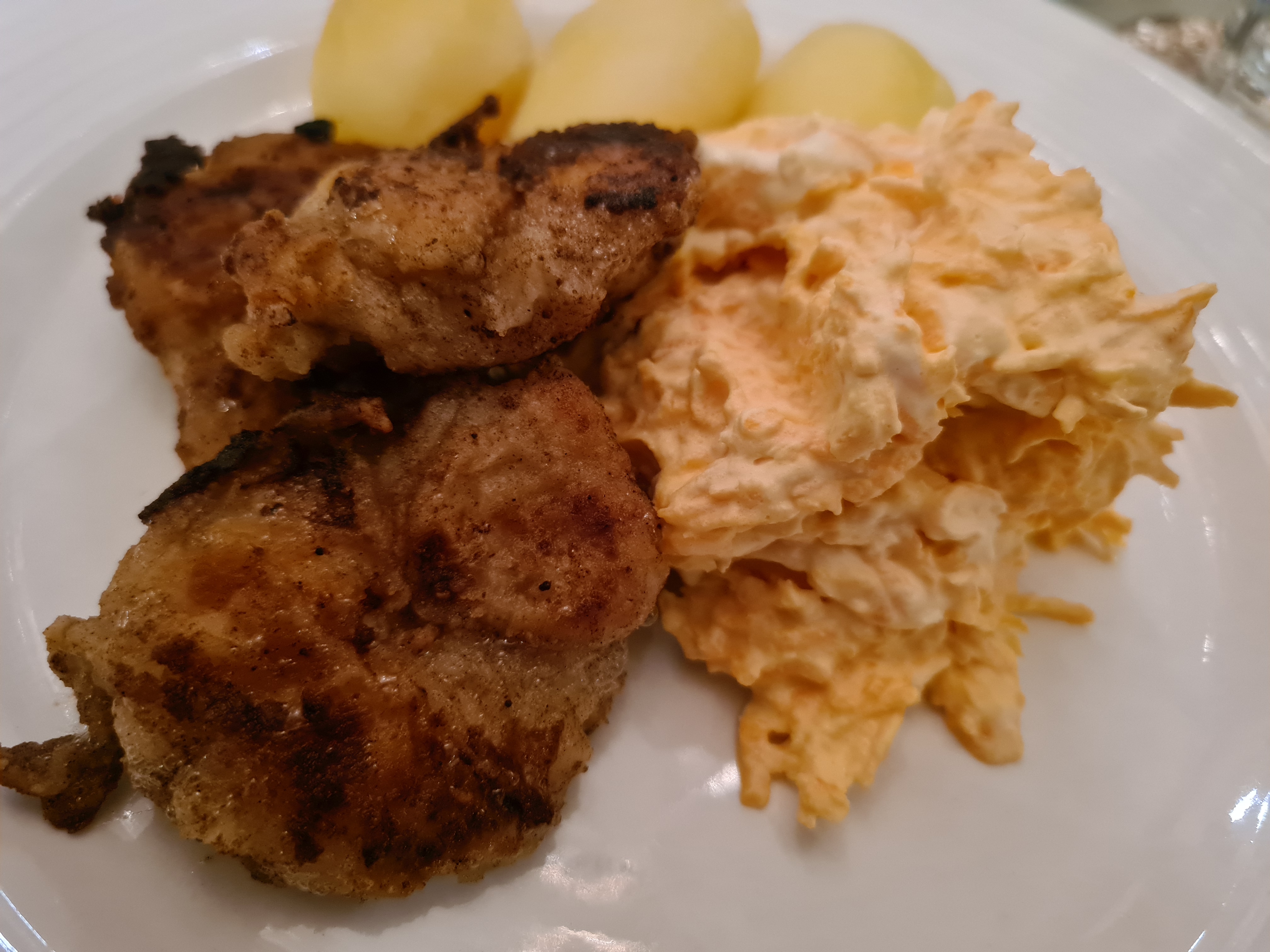 Man bør helle ikke steke torsketunger for lenge, helst bare lysebrune, ellers taper de den gode fiskesmaken. Tradisjonen hos oss er revet gulrot m/ slangeagurk 1 ss 7% eddik litt vann (ca 1 dl) ca 1 ss farin blandes og helles over salaten. Kan bruke sitronsaft også.