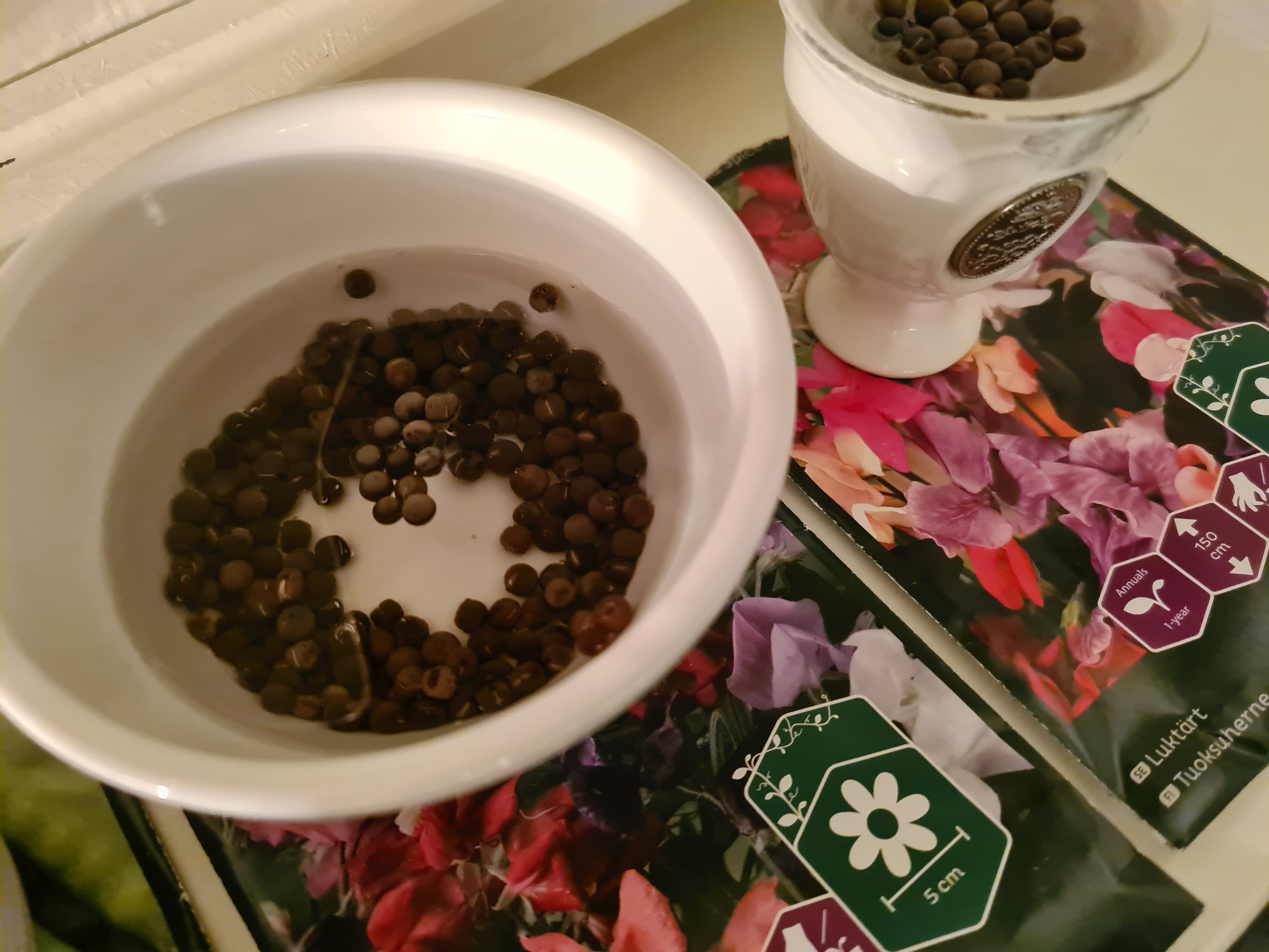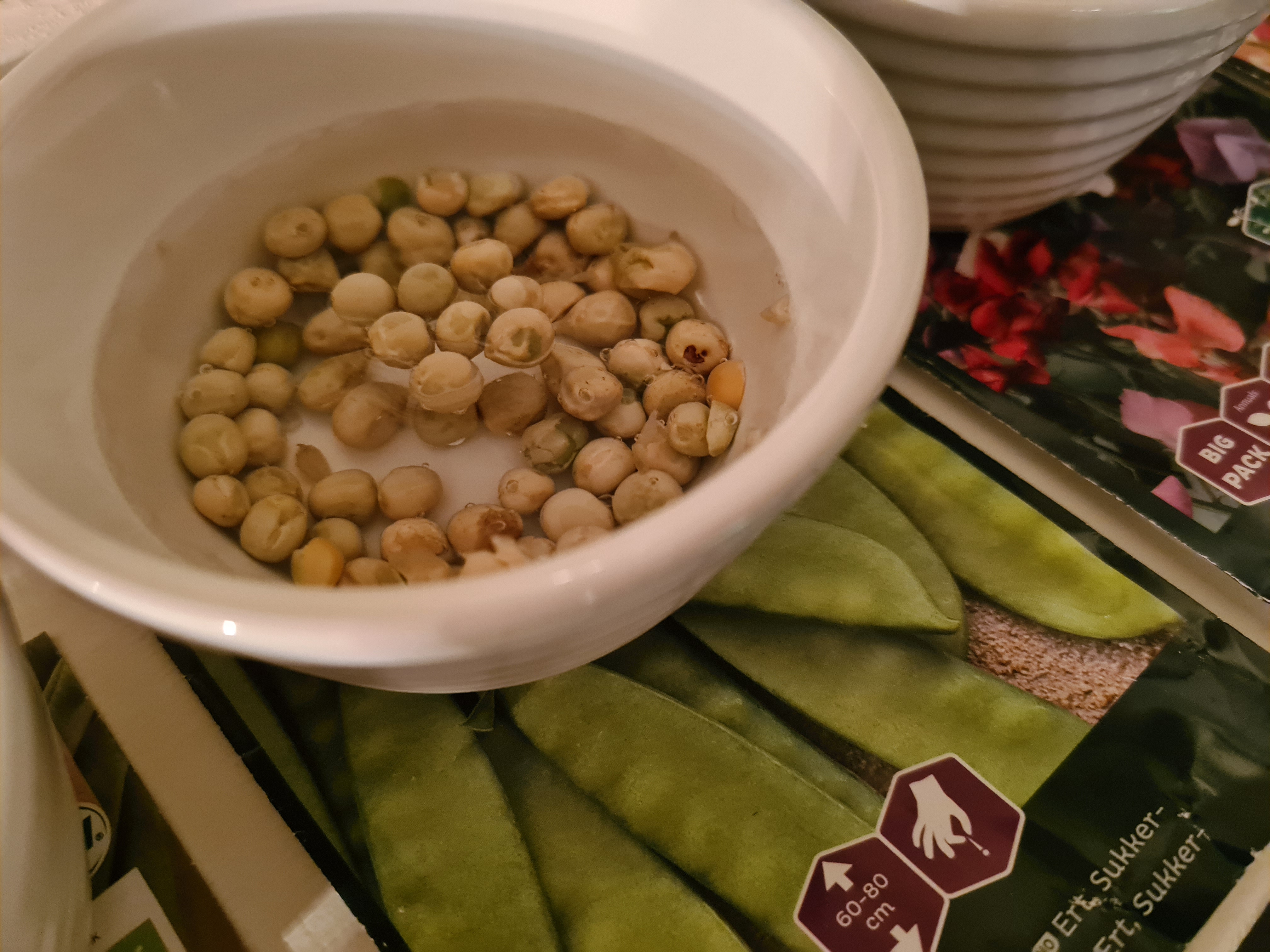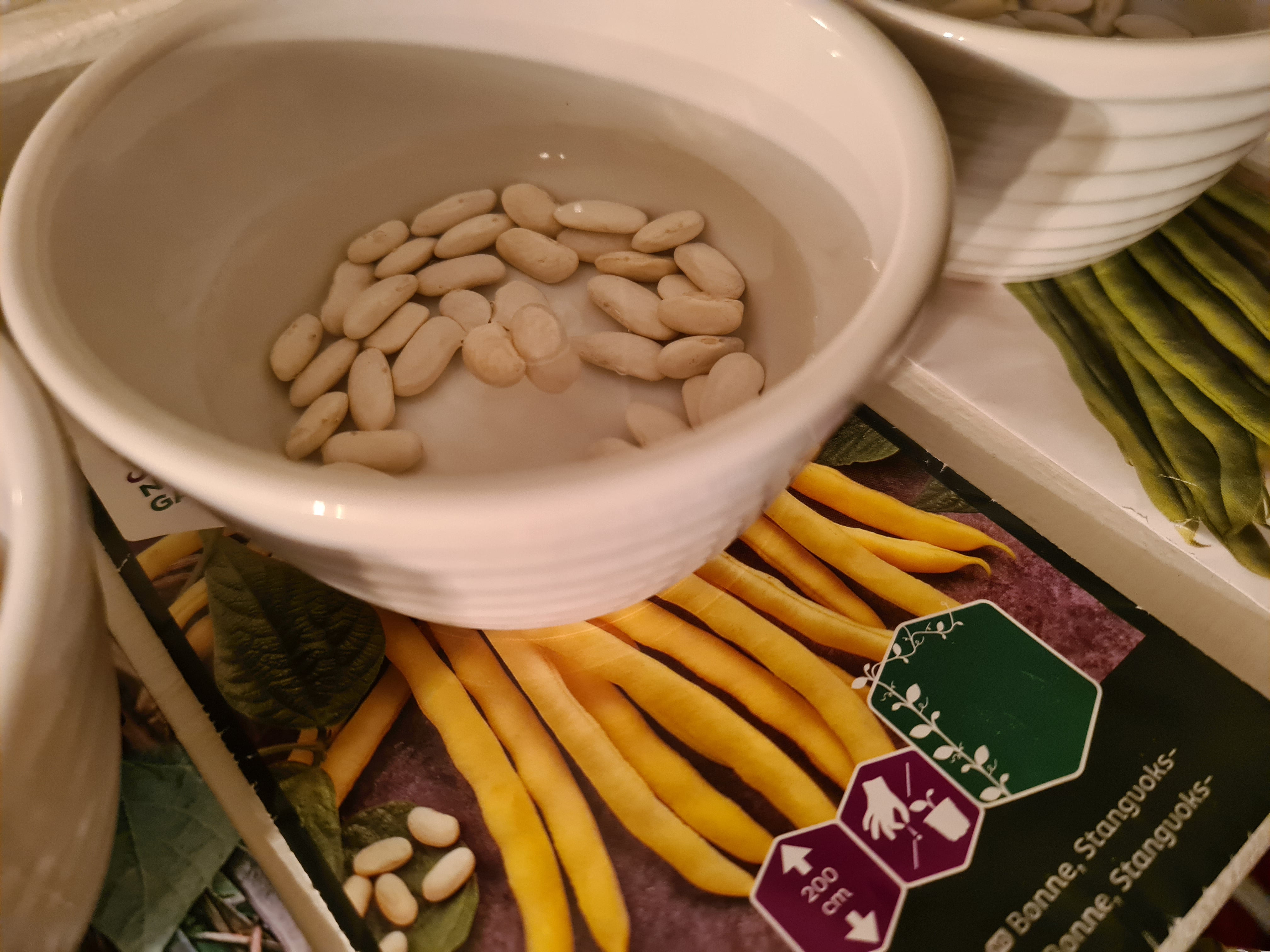 Nå er jeg i gang med forberedelse til årets sådd av sukkererter, bønner og blomstererter. For at de skal spire lettere legger jeg de i en skål med vann over natta, og deretter er det bare å så de.